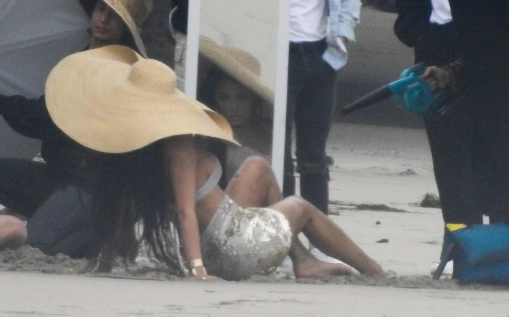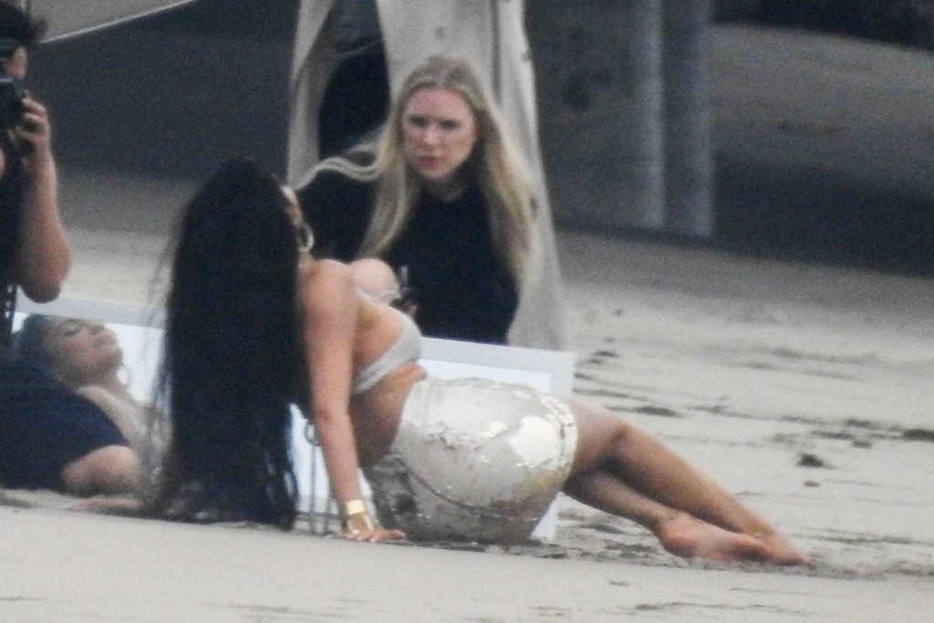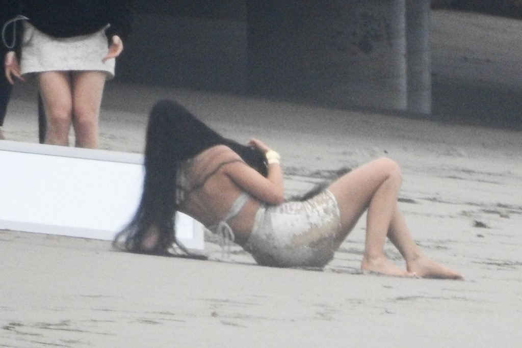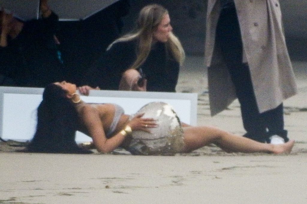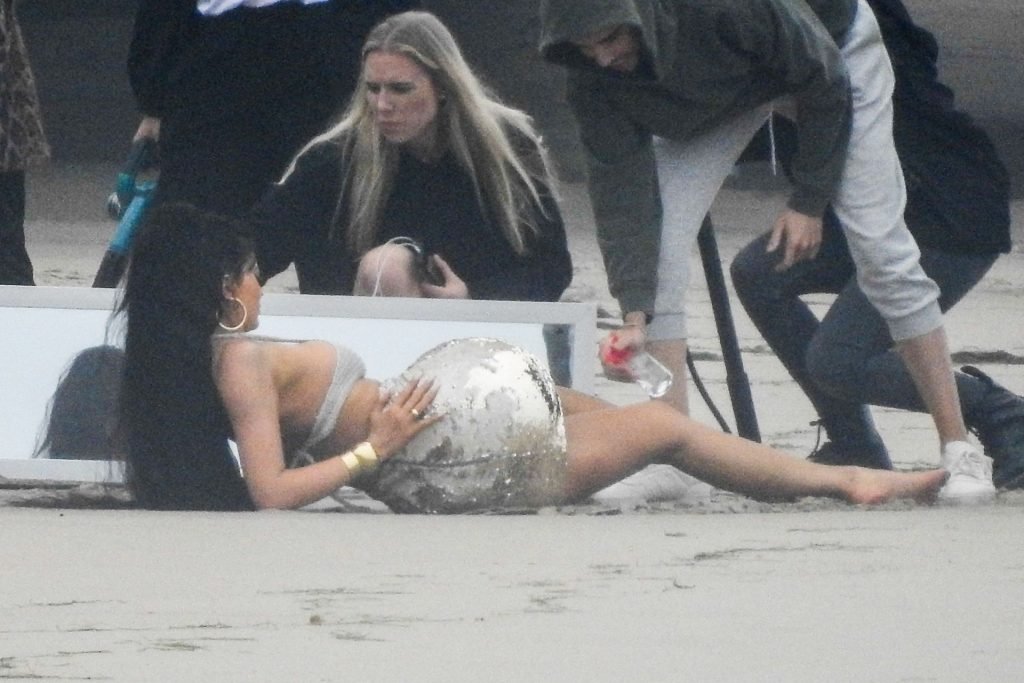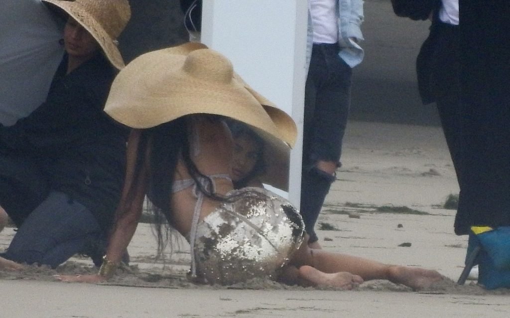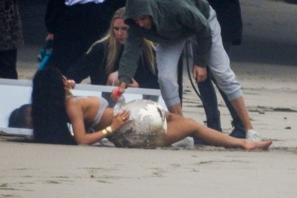 En otra escena, Kylie llevaba un top de bikini, una falda de lentejuelas y un sombrero de playa grande mientras posaba en la arena frente a un espejo. Mucho personal estuvo presente para ayudar, y un asistente afortunado tuvo la ardua tarea de rociarla con una botella de agua asegurándose de que tuviera la cantidad justa de agua y arena pegada en sus piernas.