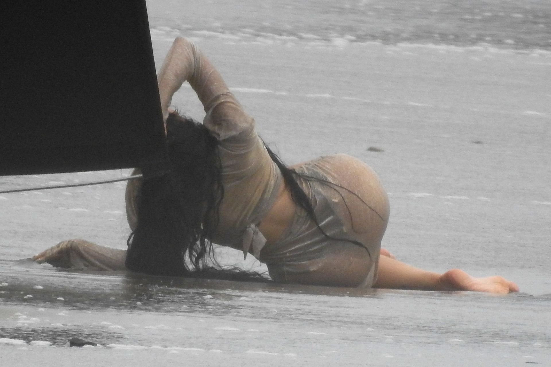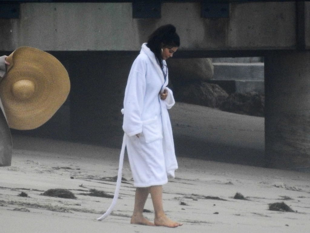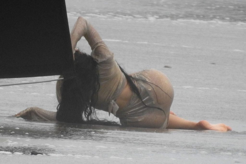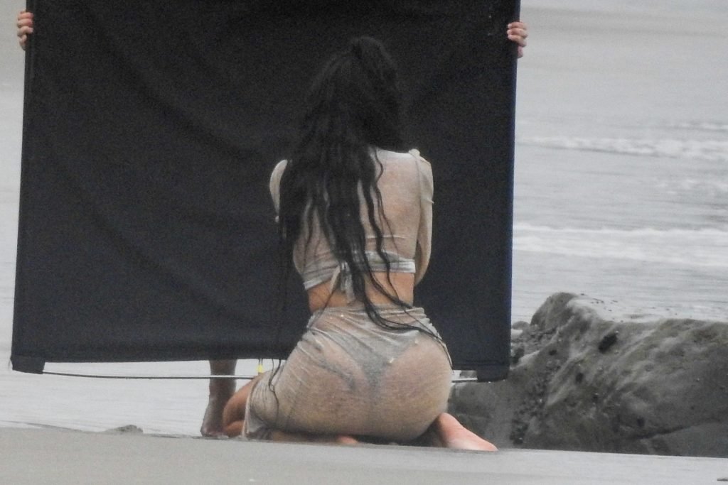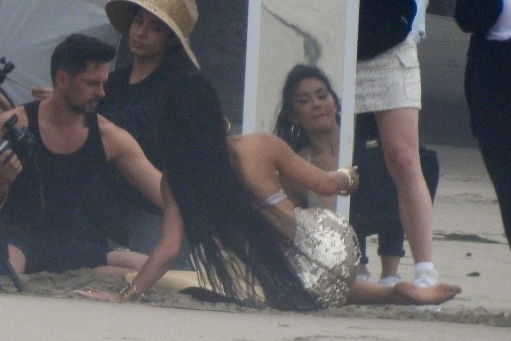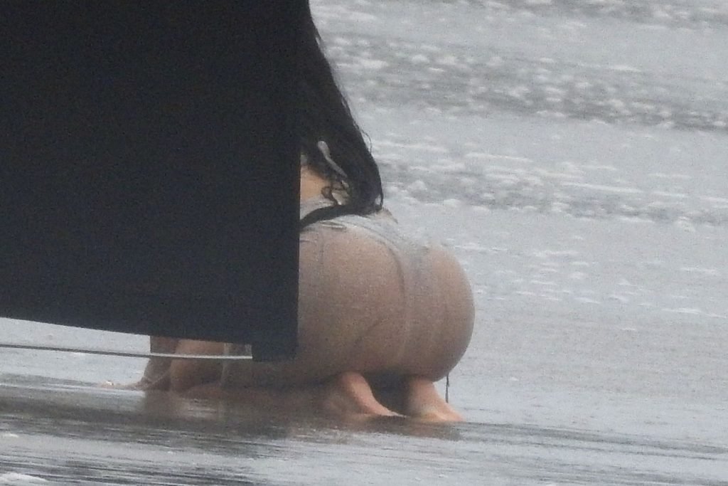 En otra escena, Kylie llevaba un top de bikini, una falda de lentejuelas y un sombrero de playa grande mientras posaba en la arena frente a un espejo. Mucho personal estuvo presente para ayudar, y un asistente afortunado tuvo la ardua tarea de rociarla con una botella de agua asegurándose de que tuviera la cantidad justa de agua y arena pegada en sus piernas.