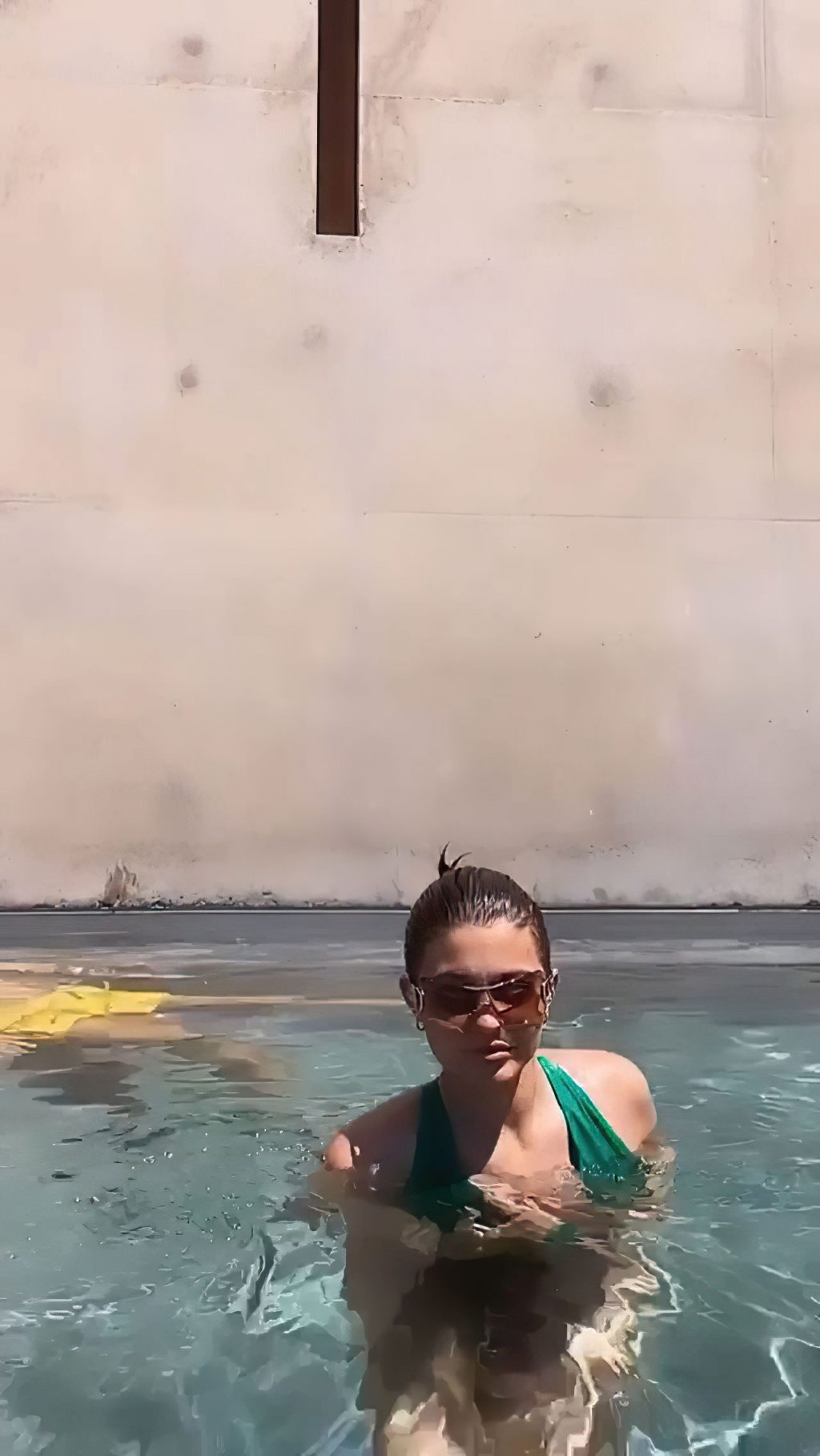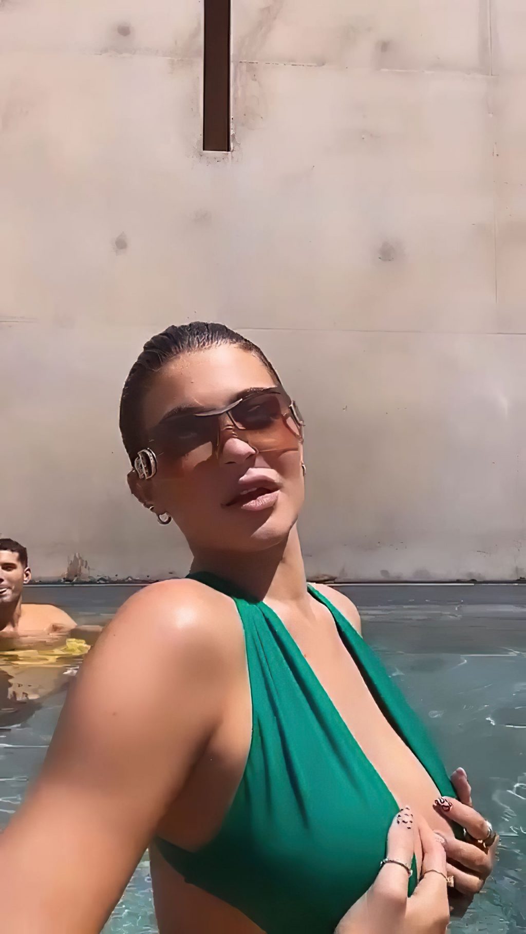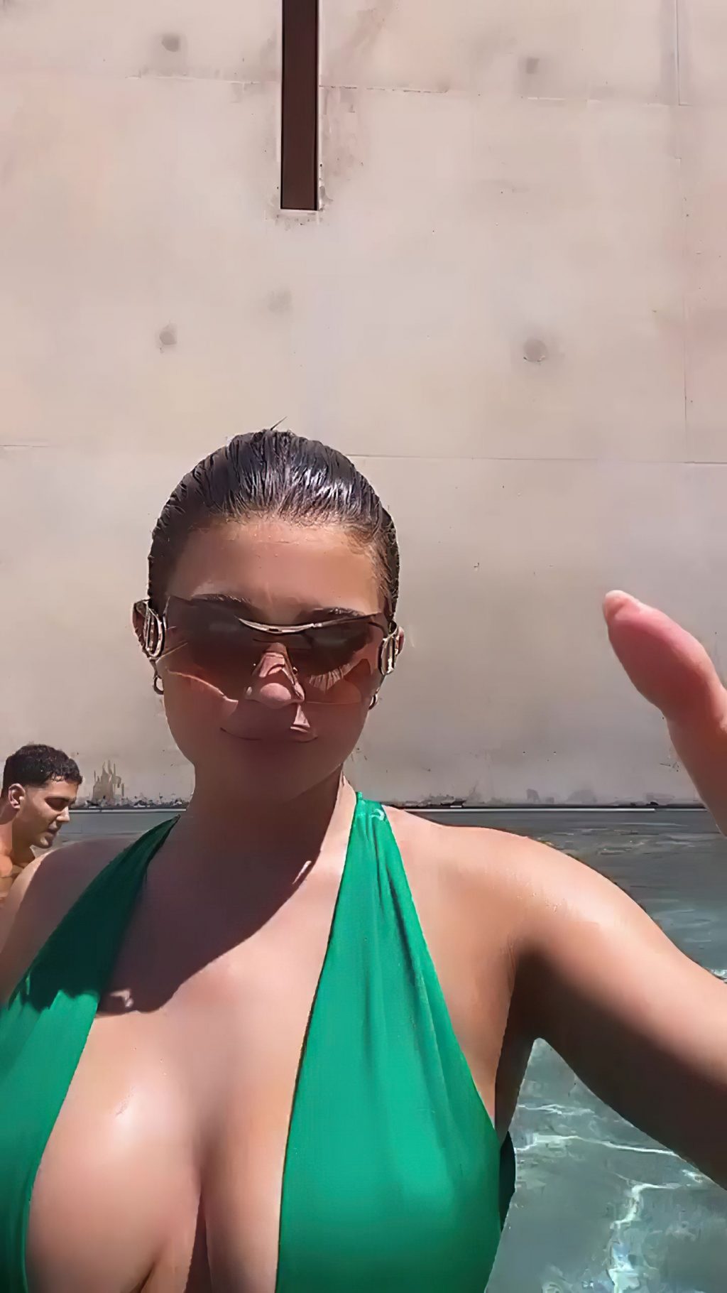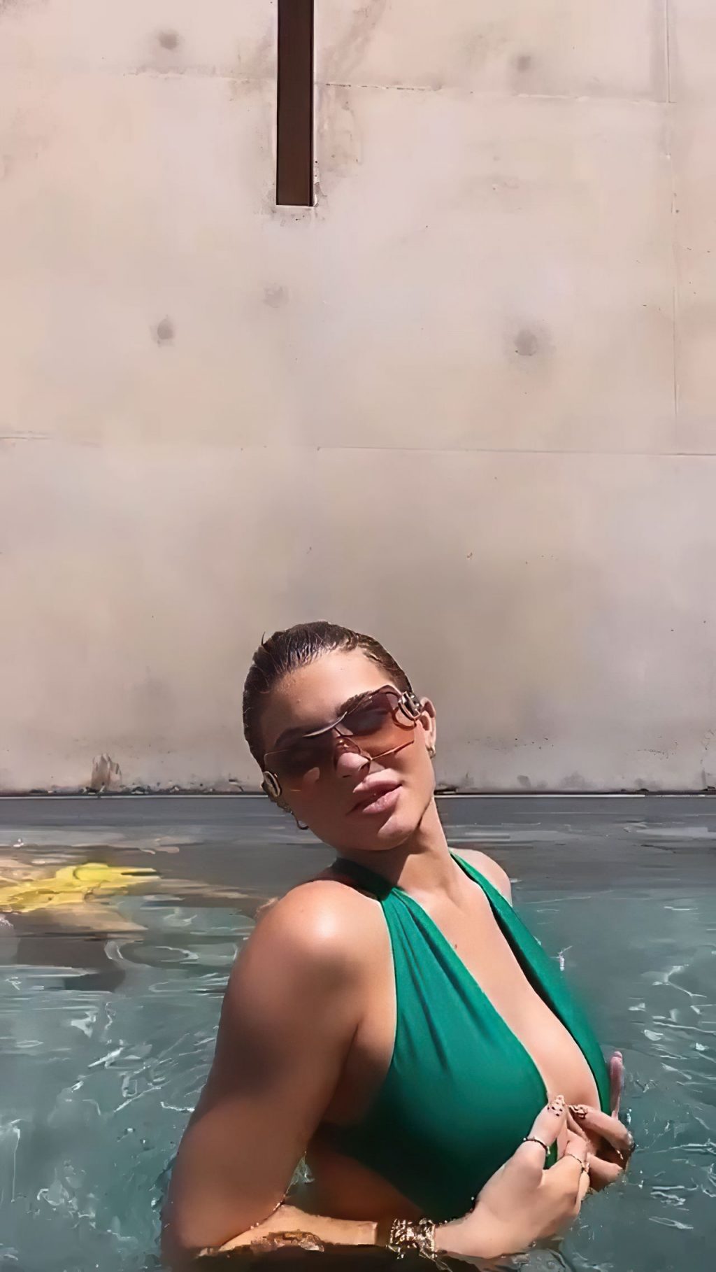 Mira las nuevas fotos, gifs y video sexys de Kylie Jenner en Instagram, 07/07/2020. La morena mostró sus pechos posando en una piscina con un traje de baño verde.
