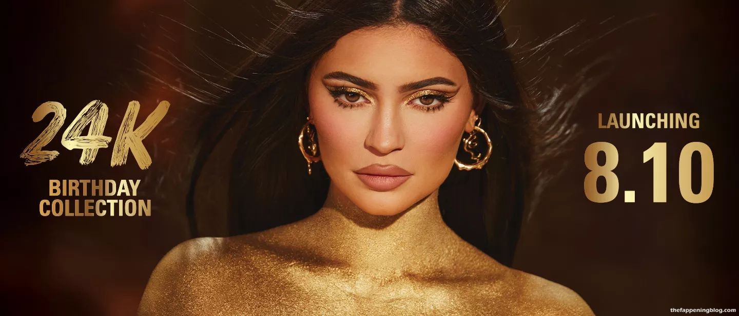 Model Kylie Jenner promociona sus cosméticos, posando topless, cubriendo sus pechos con las manos y con purpurina dorada en una nueva sesión de fotos (2021).
