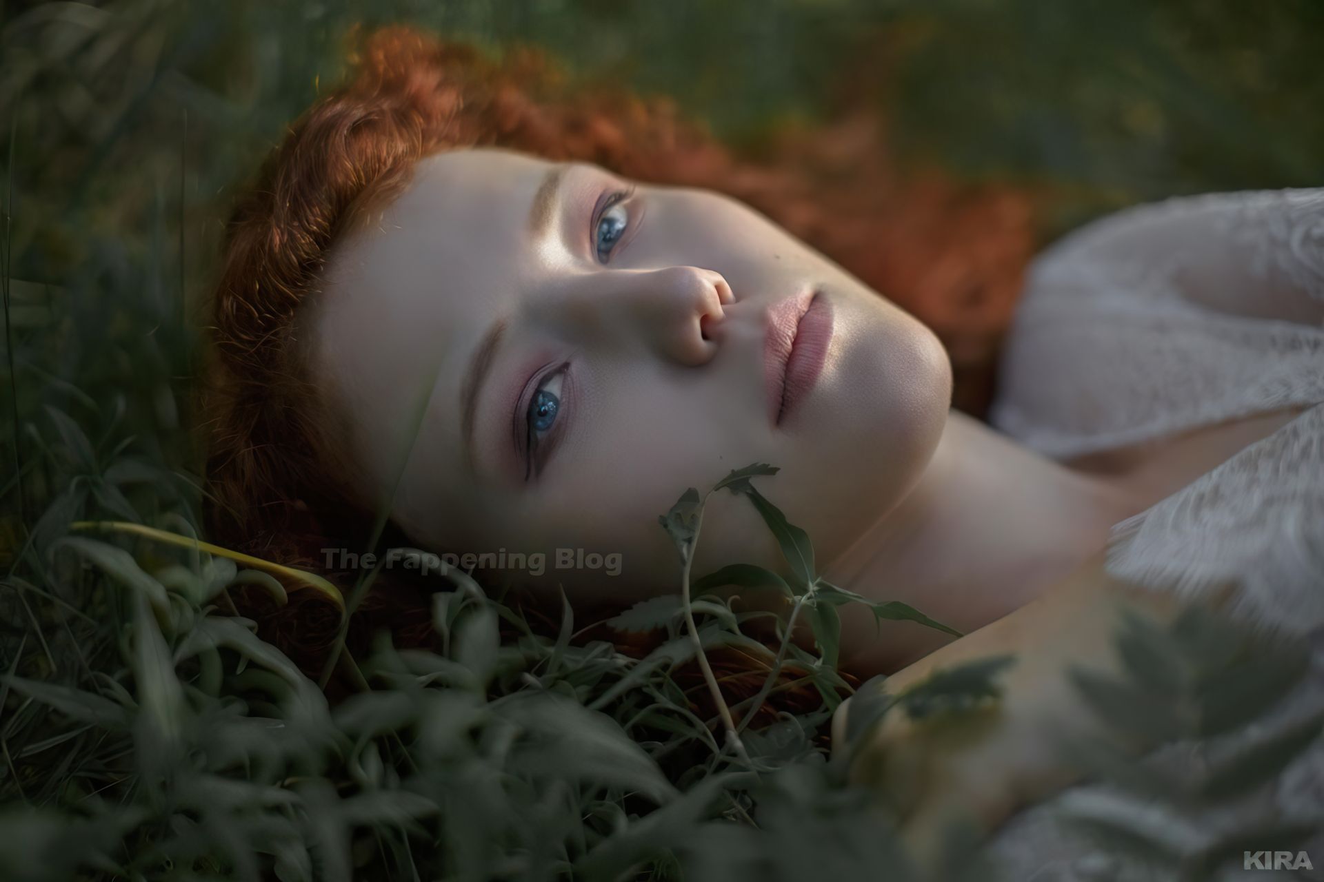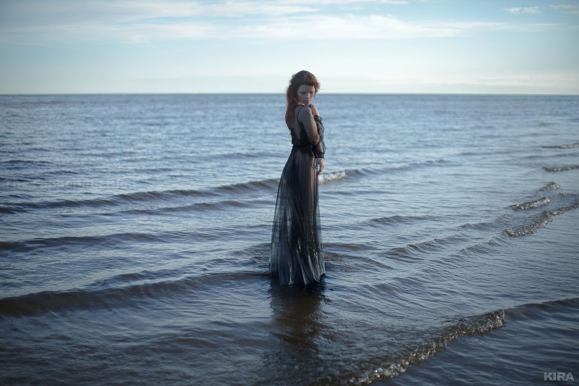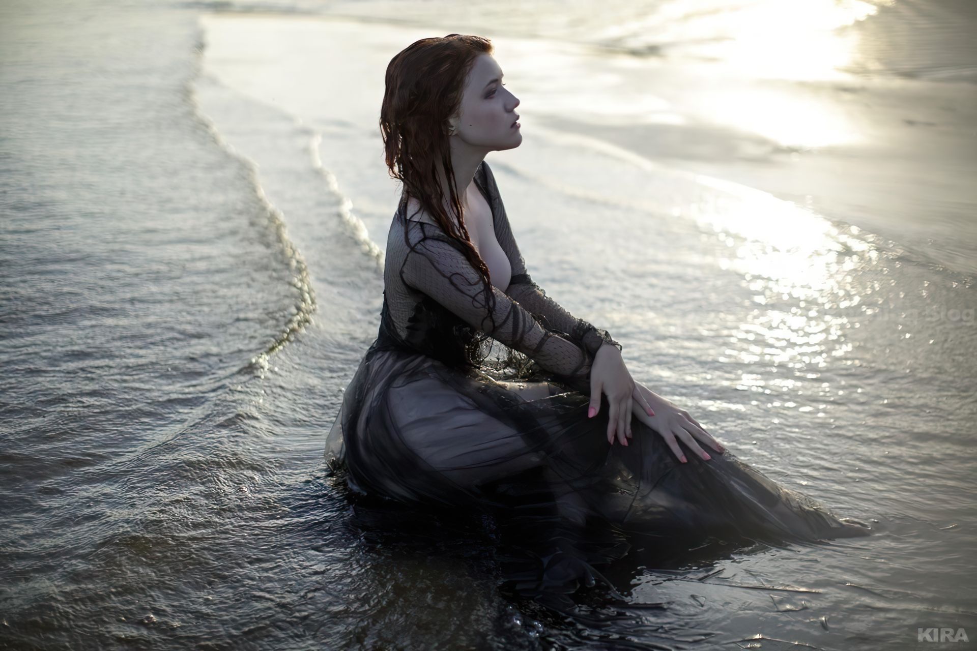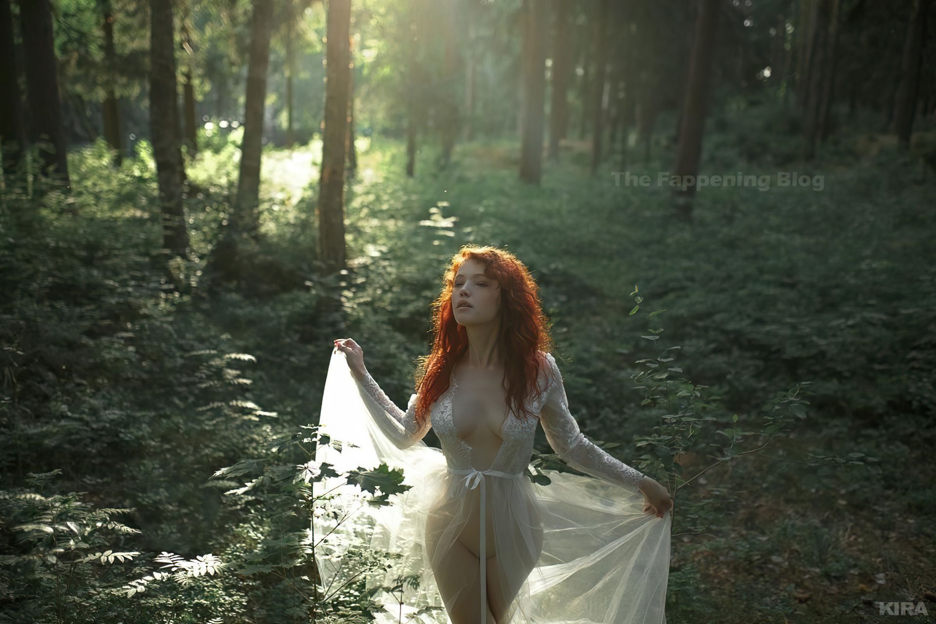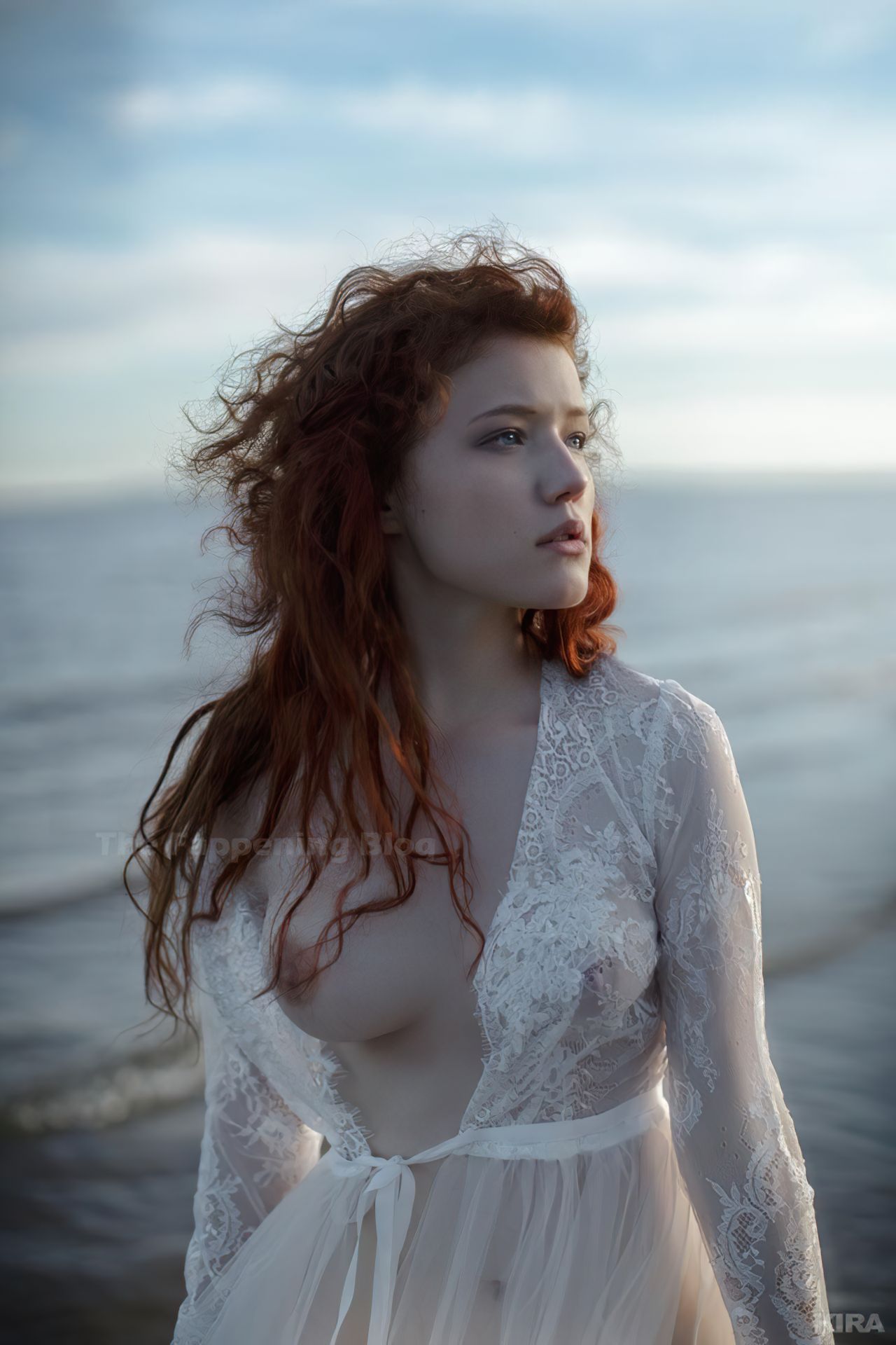 Modelo y diseñadora rusa pelirroja de cosplay Lada Lyumos va del bosque al mar vistiendo hermosos vestidos transparentes y poco más en una sesión de fotos de Kira Mitenkova.