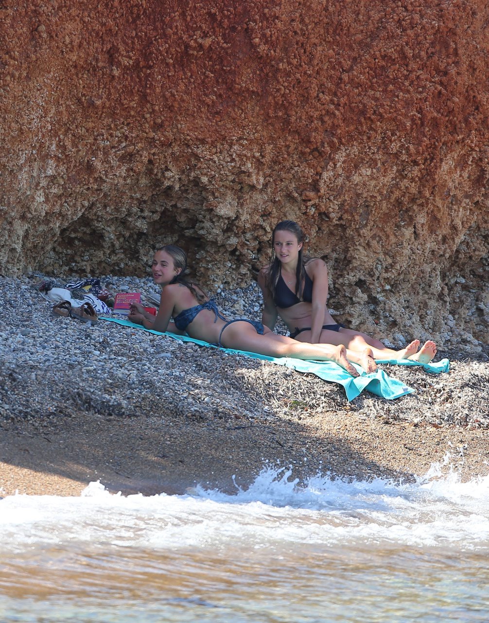 Modelo de moda y heredera al trono Lady Amelia Windsor fue fotografiada con una lectura festiva “Todo lo que sé sobre el amor,” y una amiga en una playa de Ibiza, 28/07/2018.