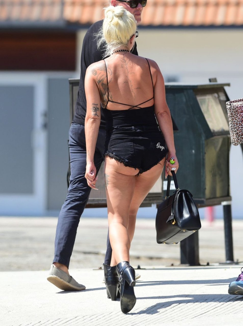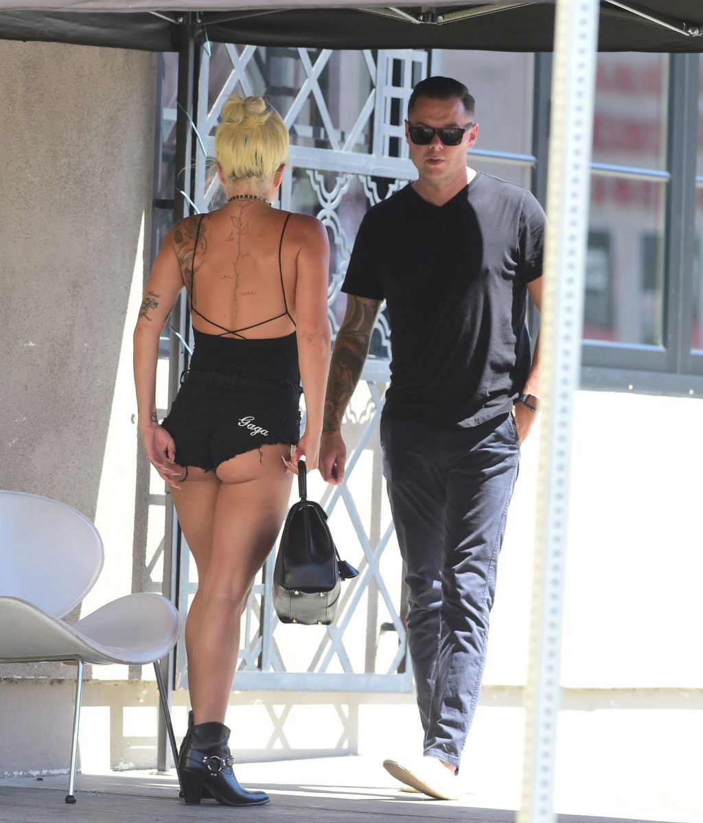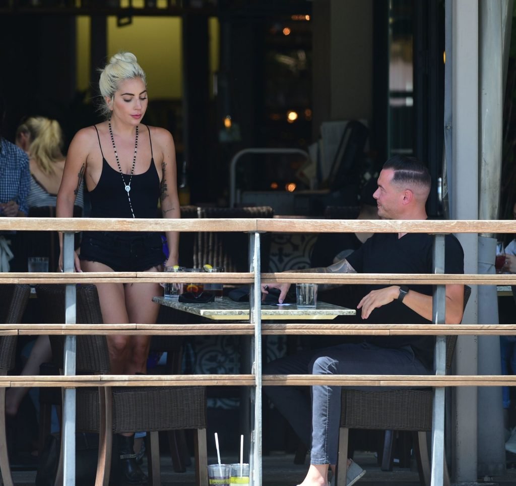 La estrella del pop de 33 años se acercó a su apuesto acompañante masculino y le dio un largo y apasionado beso en los labios. Gaga llevaba una camiseta sin mangas negra, shorts Daisy Duke reveladores y botas de cuero negro hasta el tobillo.