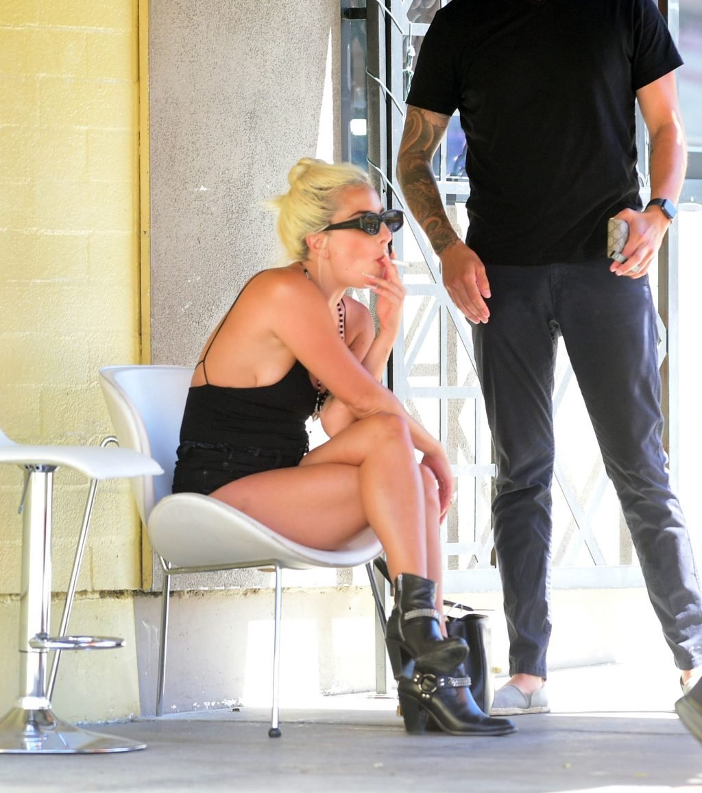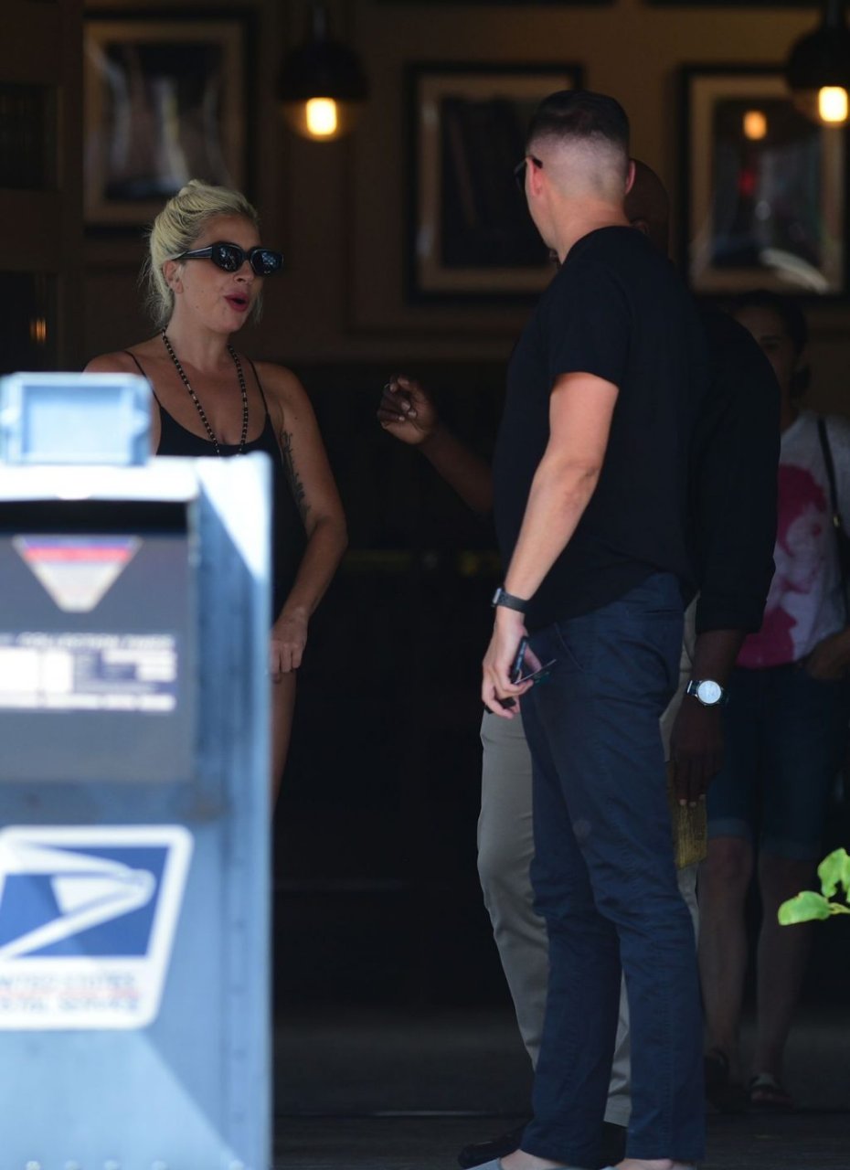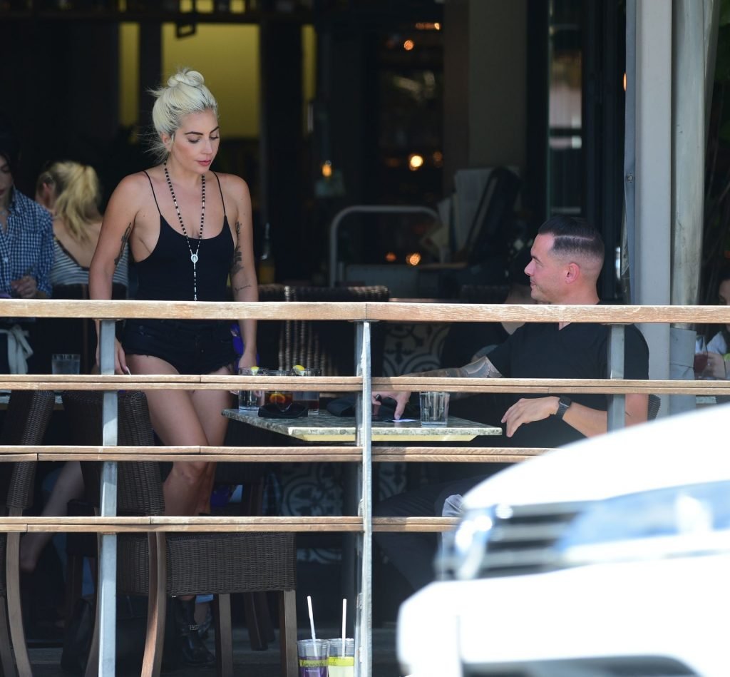 La estrella del pop de 33 años se acercó a su apuesto acompañante masculino y le dio un largo y apasionado beso en los labios. Gaga llevaba una camiseta sin mangas negra, shorts Daisy Duke reveladores y botas de cuero negro hasta el tobillo.