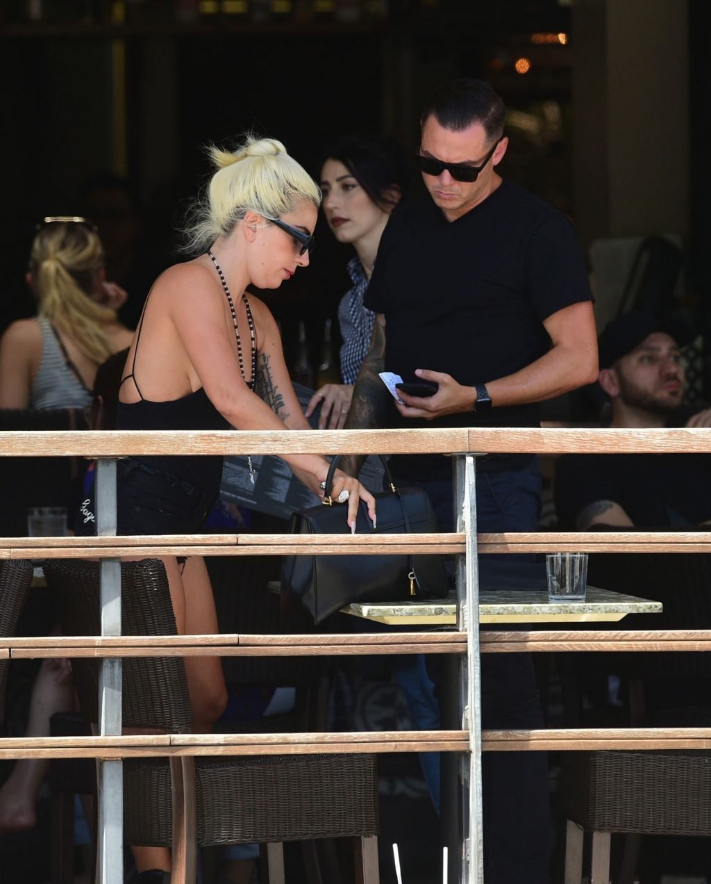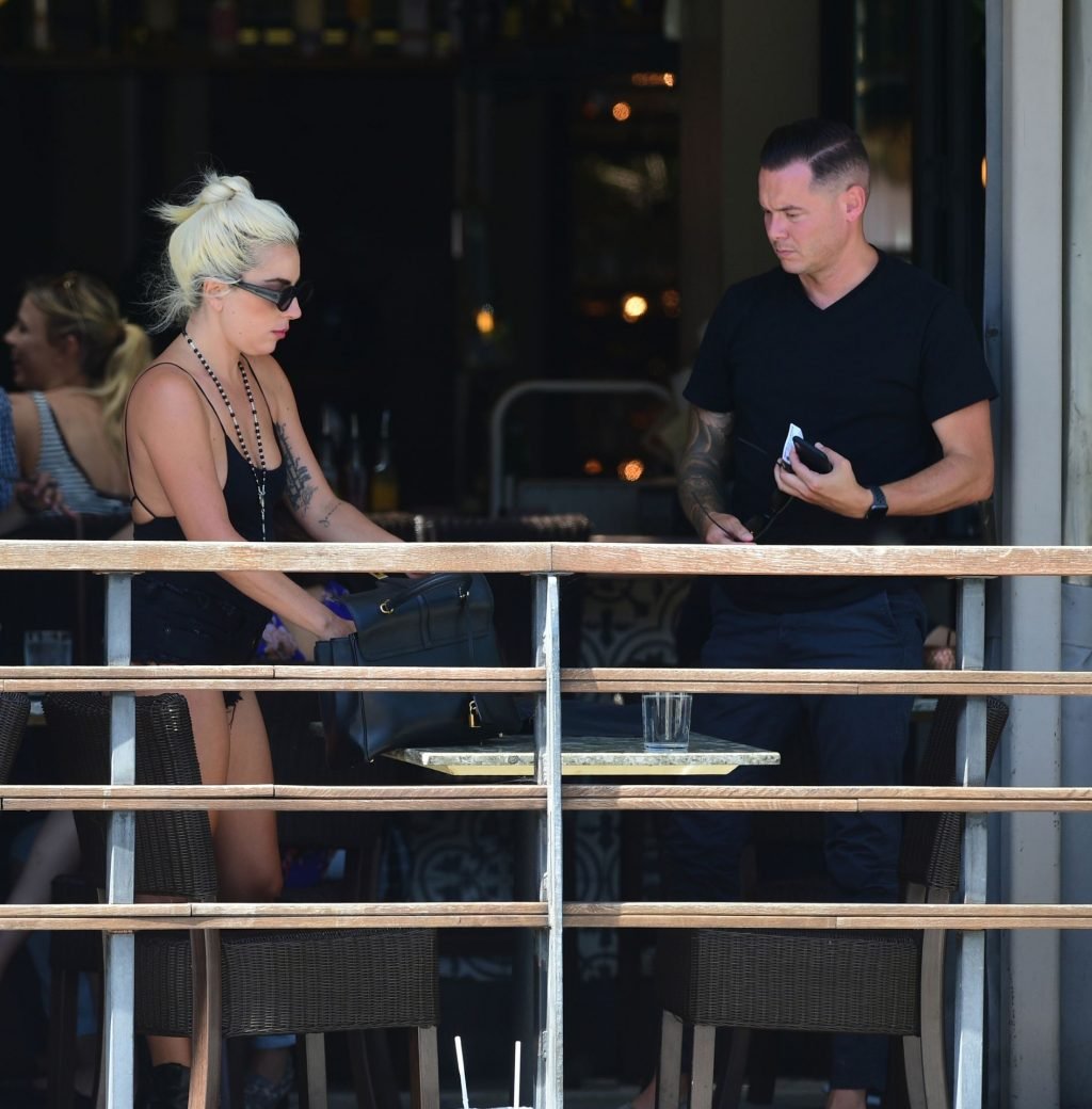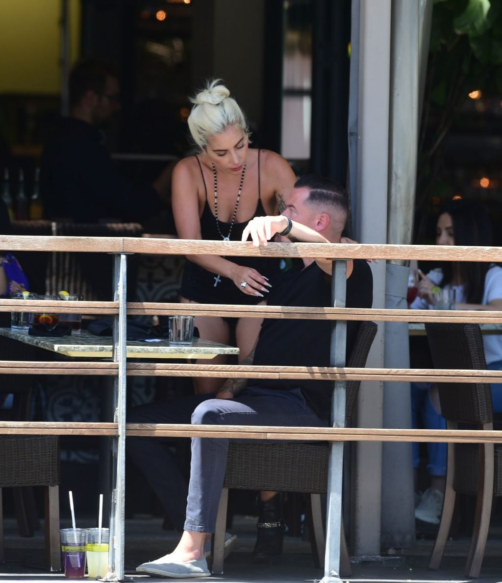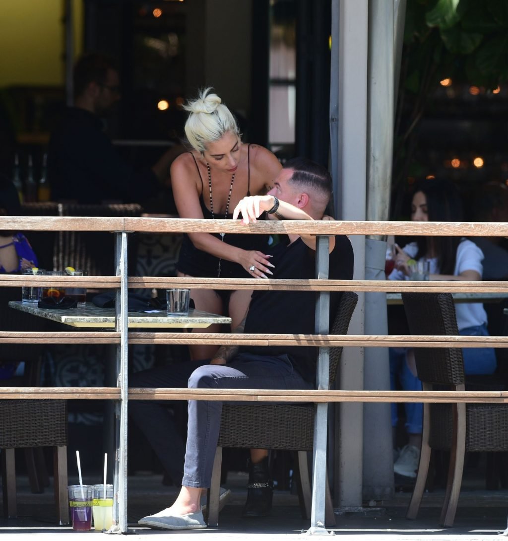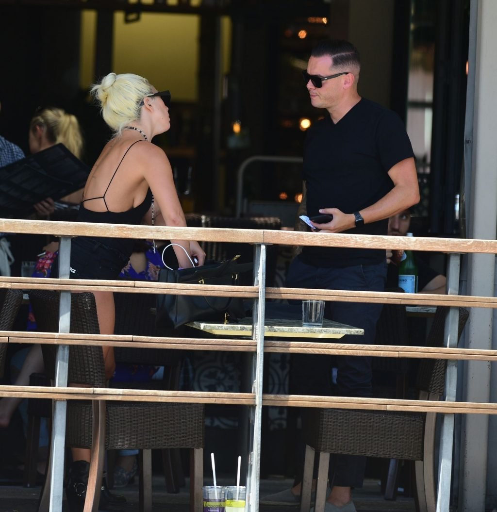 Lady Gaga muestra afecto público con el ejecutivo de la industria musical, Dan Horton, en un restaurante de Los Ángeles, 28/07/2019.
