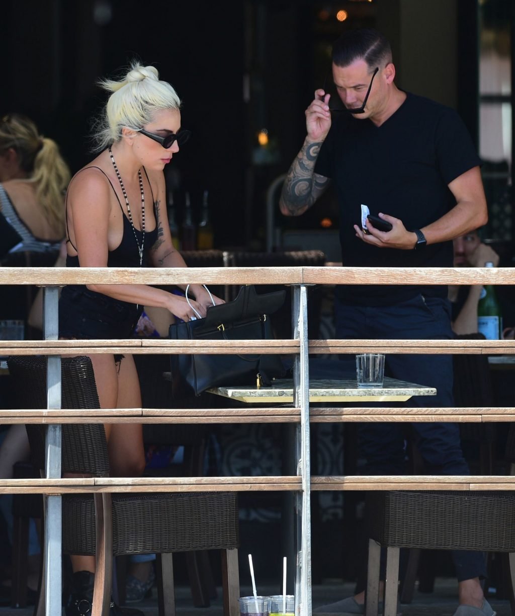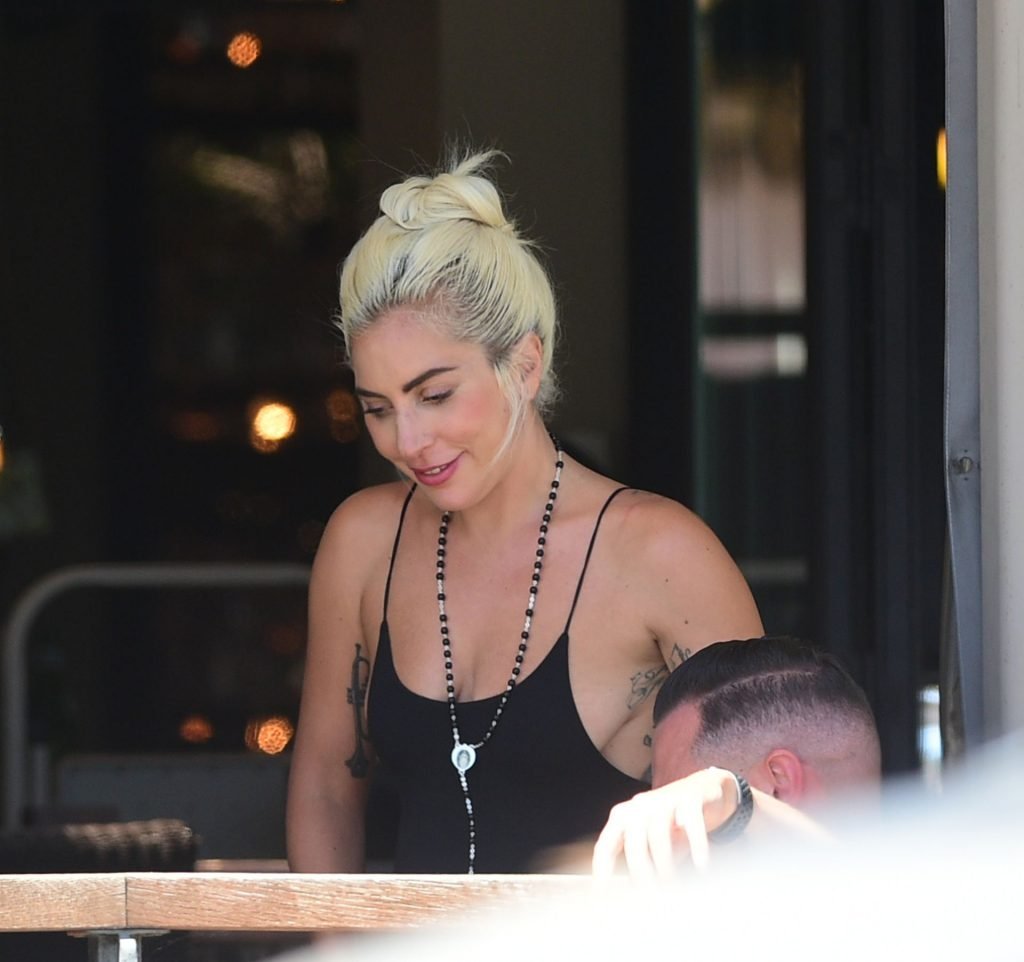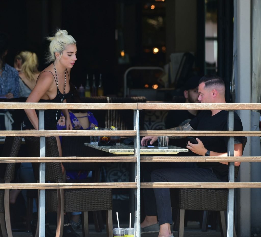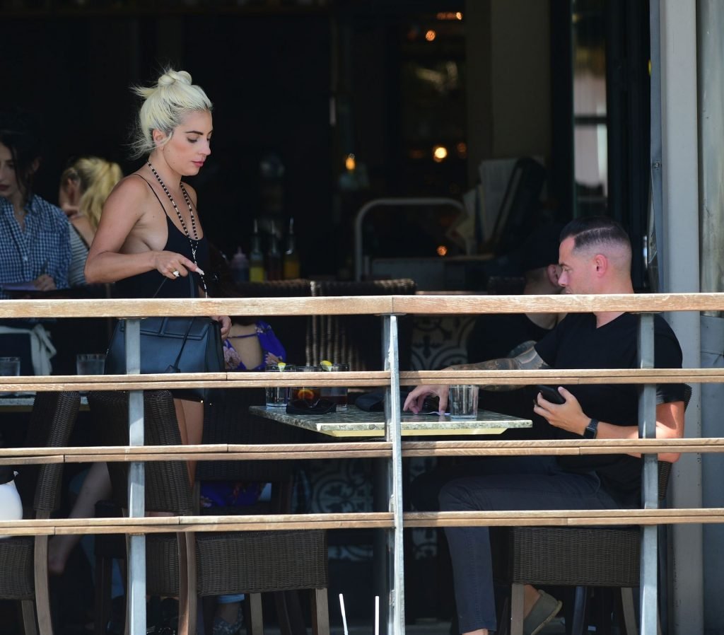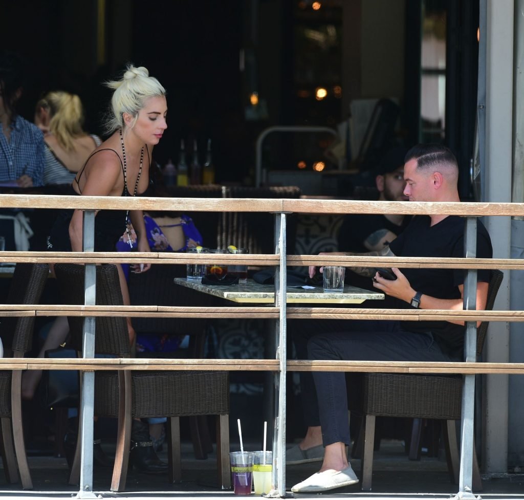 Lady Gaga muestra afecto público con el ejecutivo de la industria musical, Dan Horton, en un restaurante de Los Ángeles, 28/07/2019.