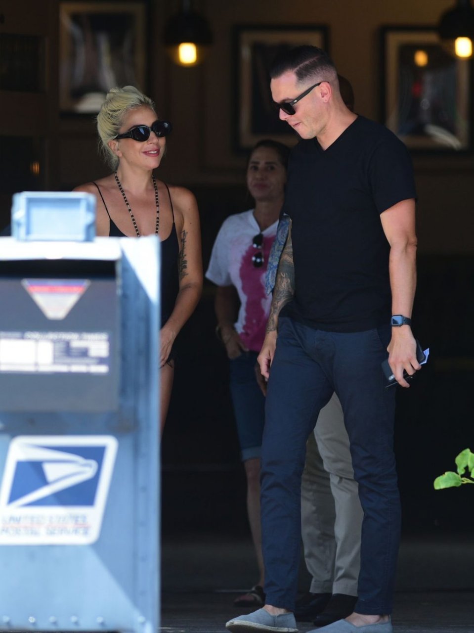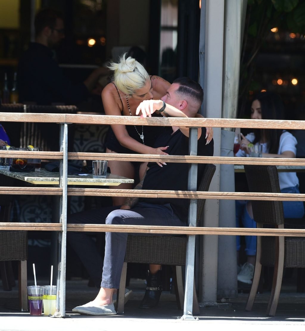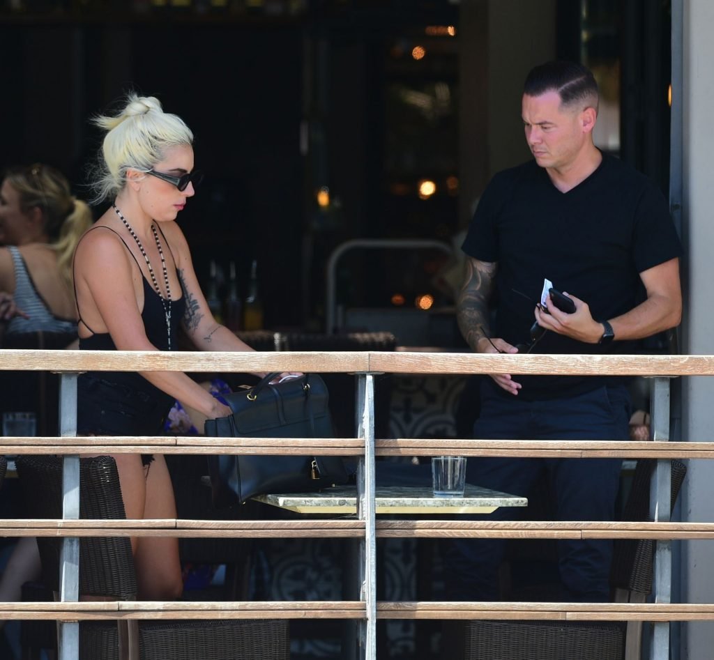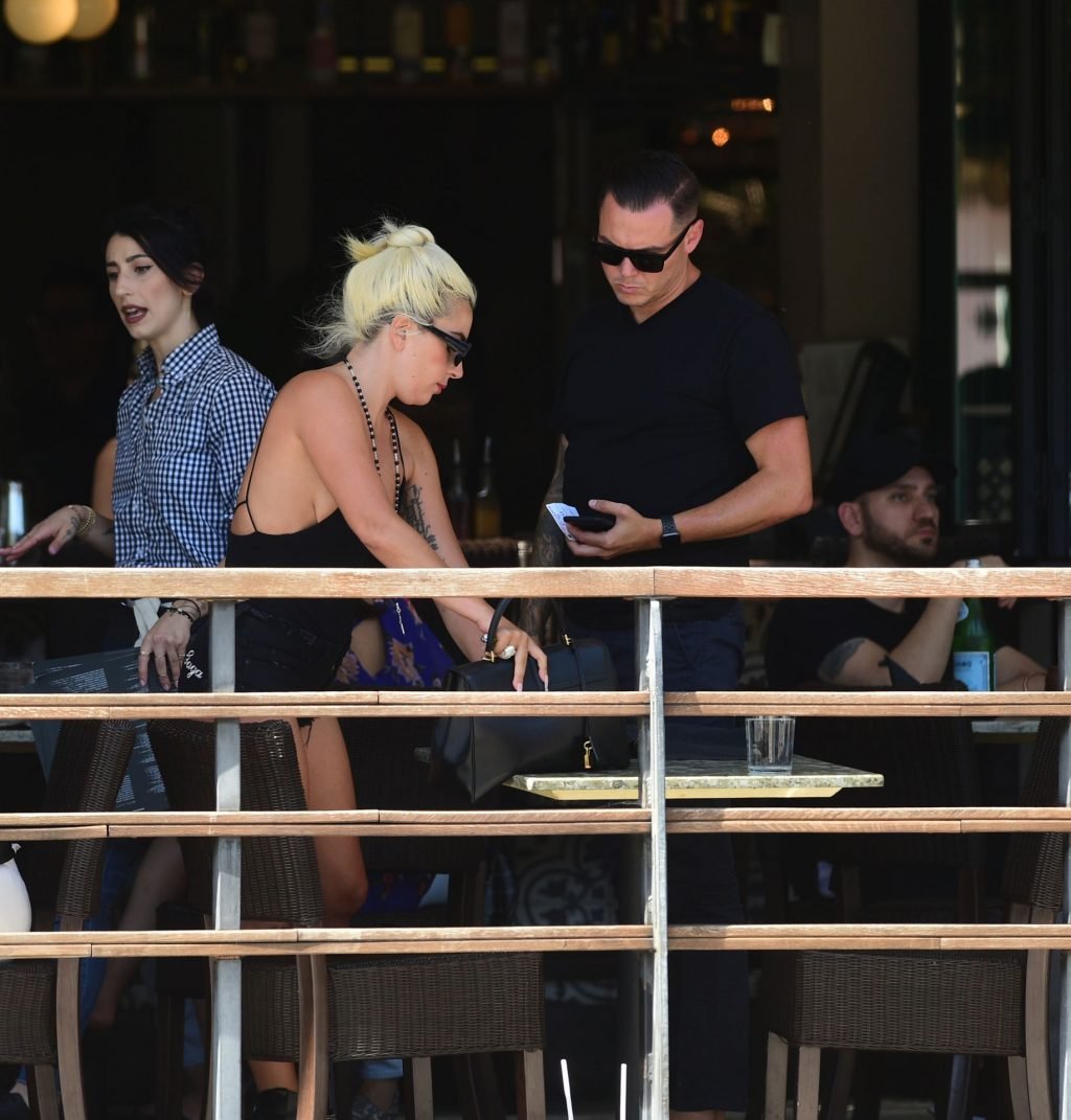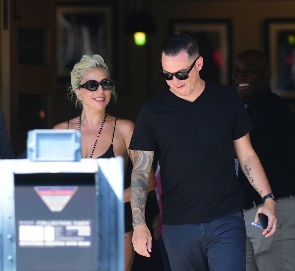 Lady Gaga muestra afecto público con el ejecutivo de la industria musical, Dan Horton, en un restaurante de Los Ángeles, 28/07/2019.