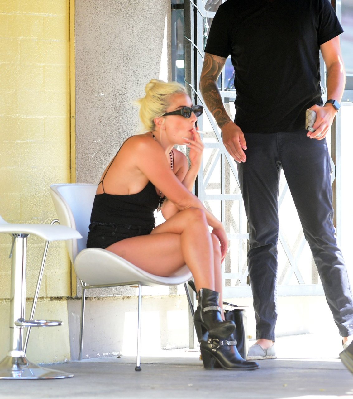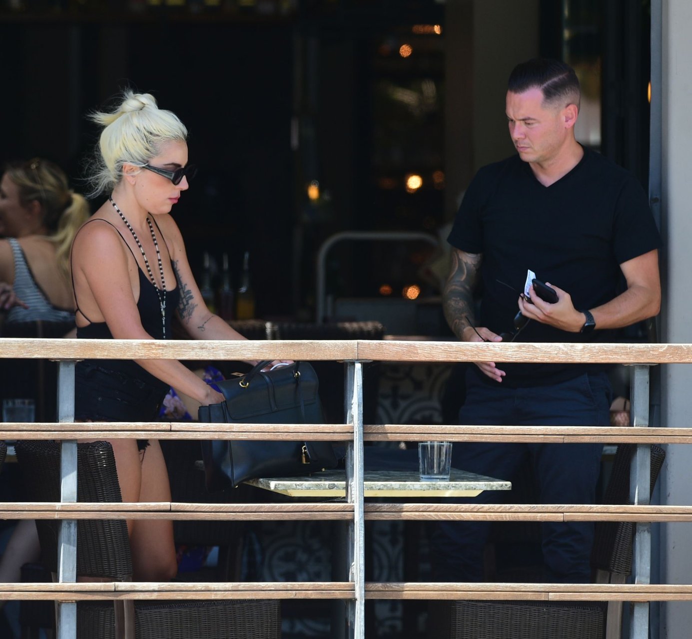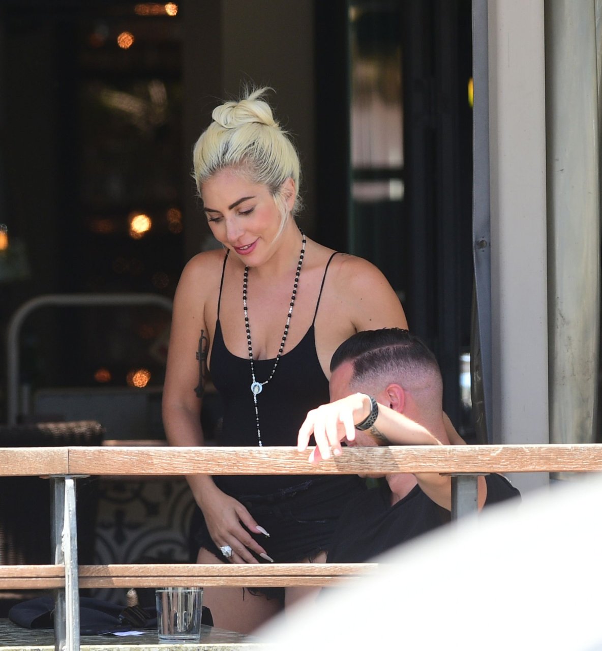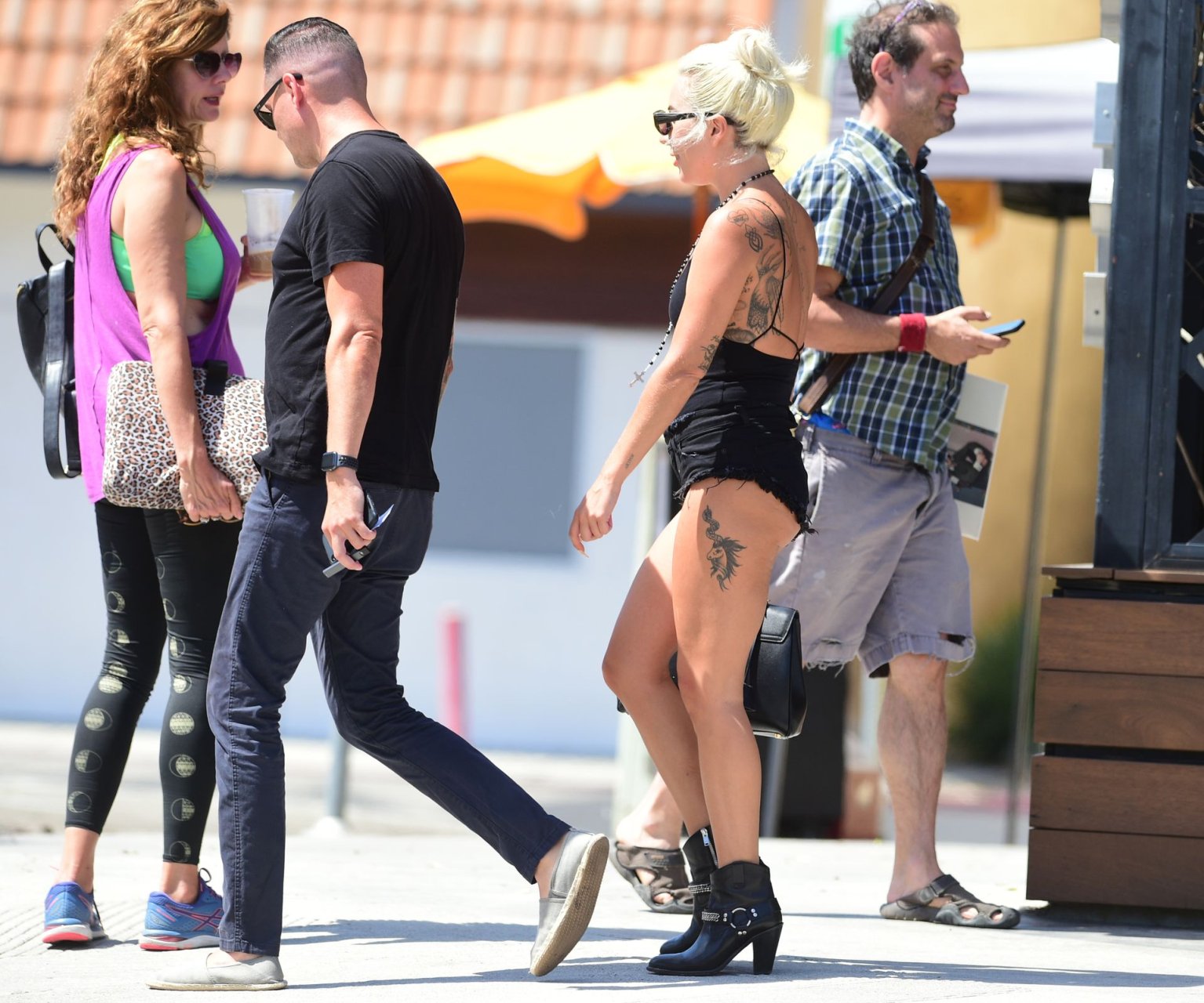 La estrella del pop de 33 años se acercó a su apuesto acompañante masculino y le dio un largo y apasionado beso en los labios. Gaga llevaba una camiseta sin mangas negra, shorts Daisy Duke reveladores y botas de cuero negro hasta el tobillo.