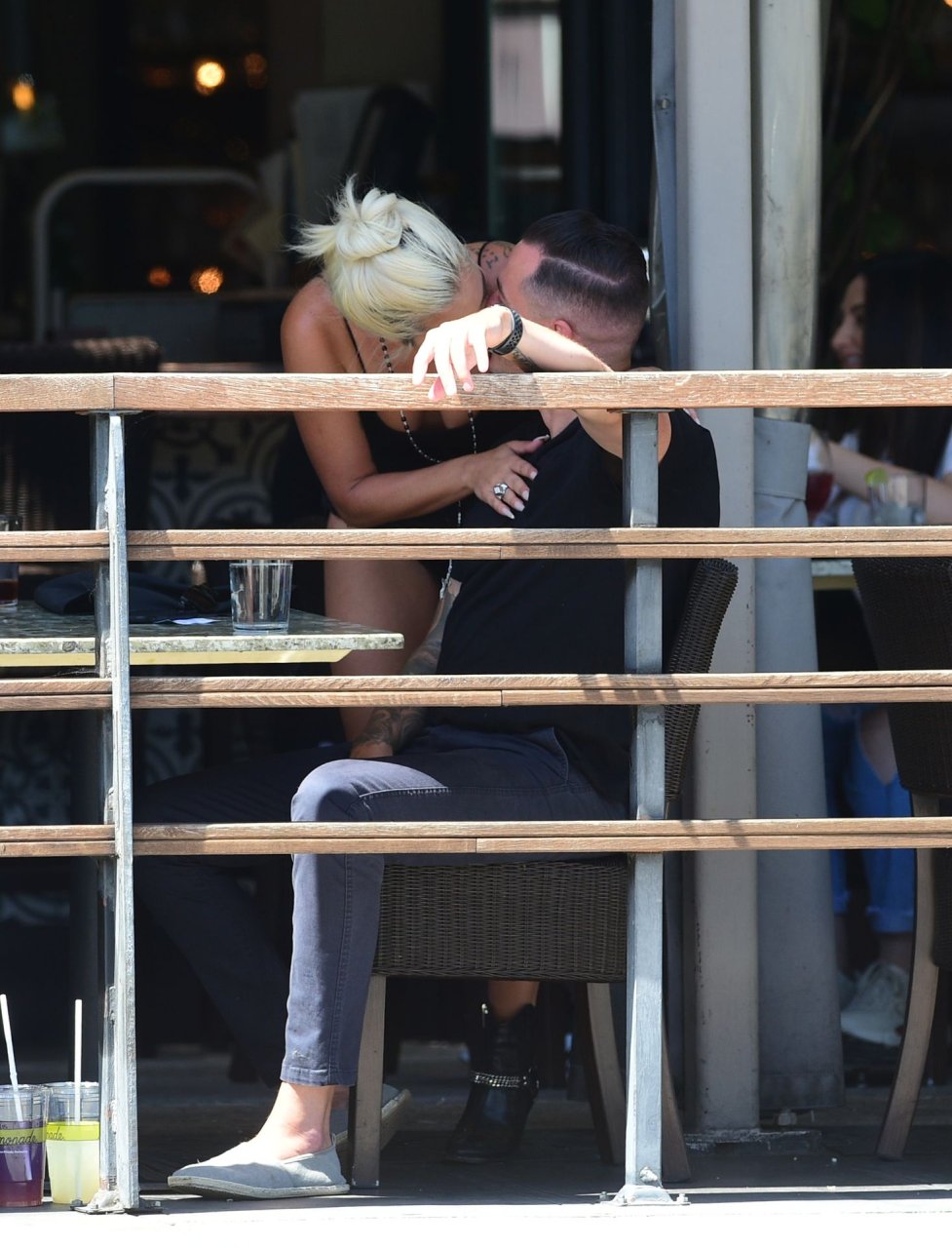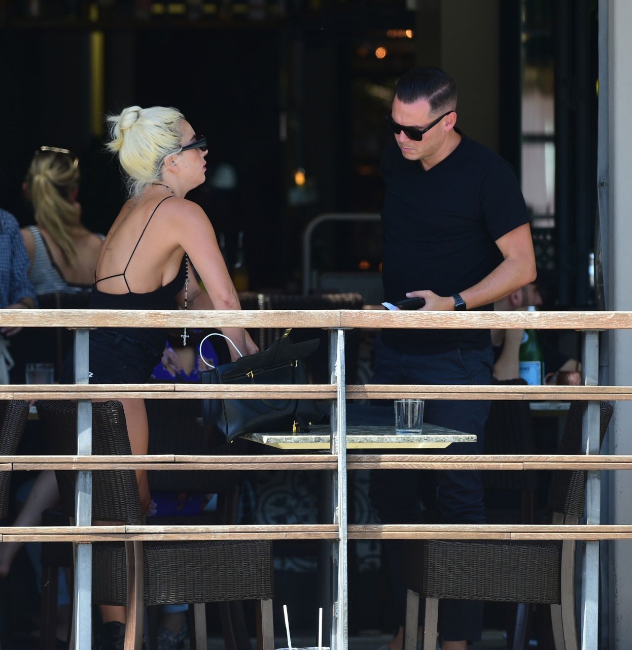 Lady Gaga muestra afecto público con el ejecutivo de la industria musical, Dan Horton, en un restaurante de Los Ángeles, 28/07/2019.