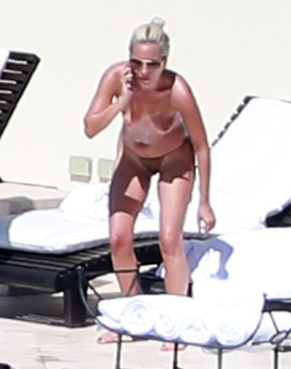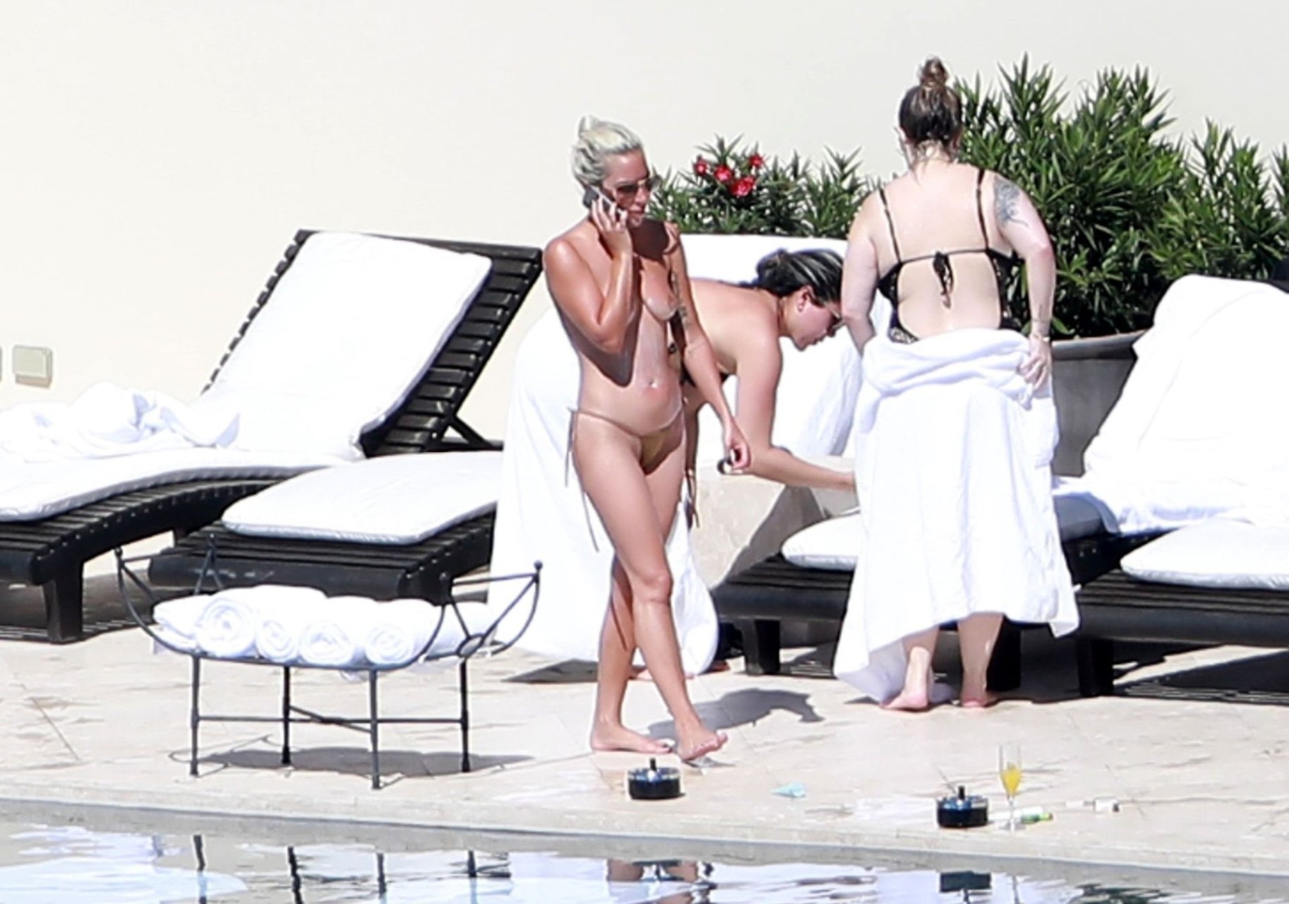 La cantante y actriz estadounidense Lady Gaga se broncea topless tomando el sol en México con amigos, 14/02/2019.