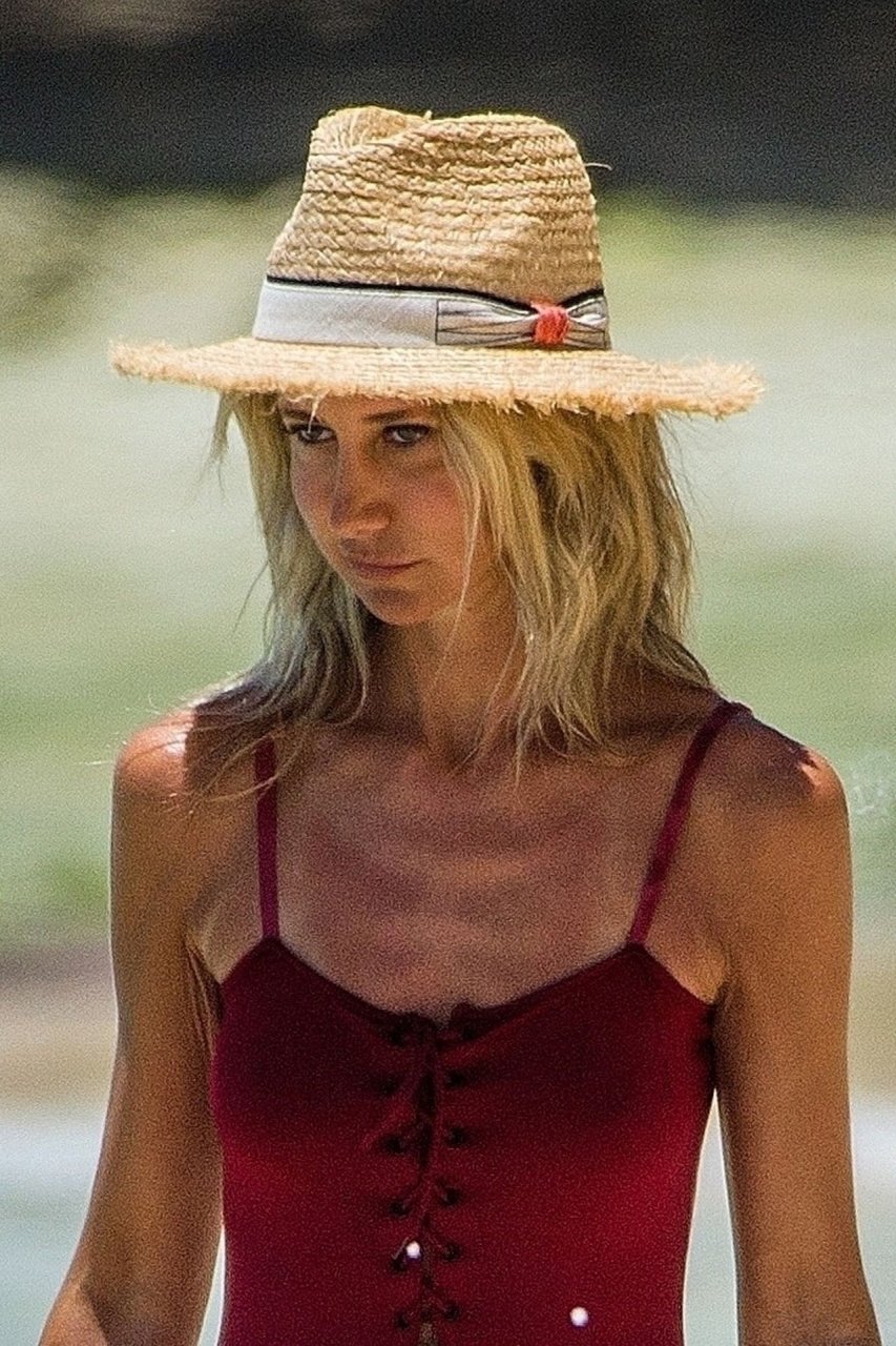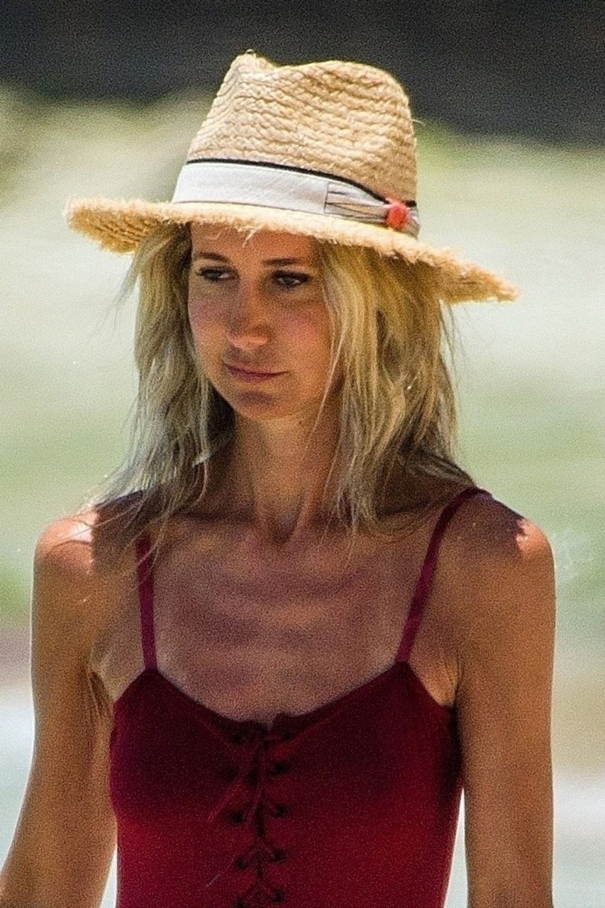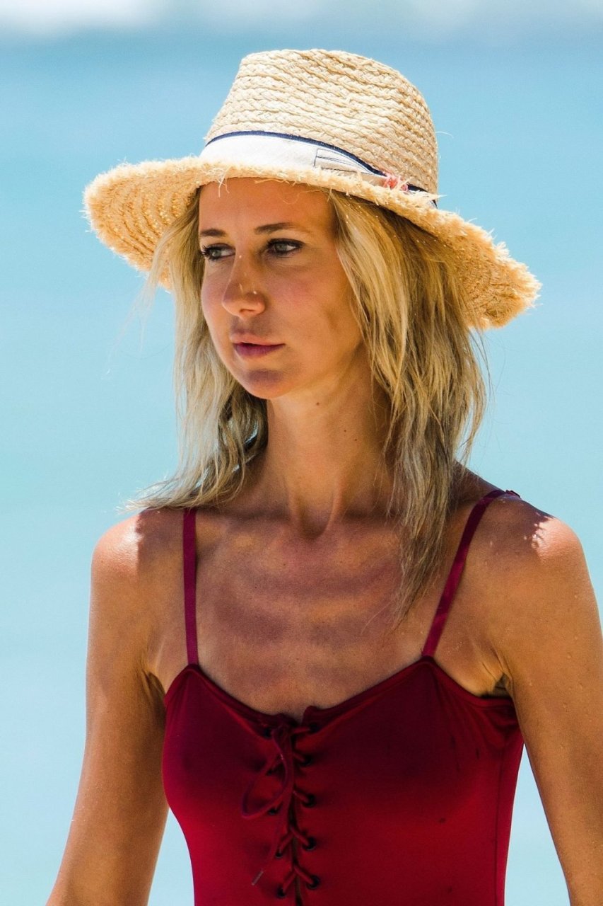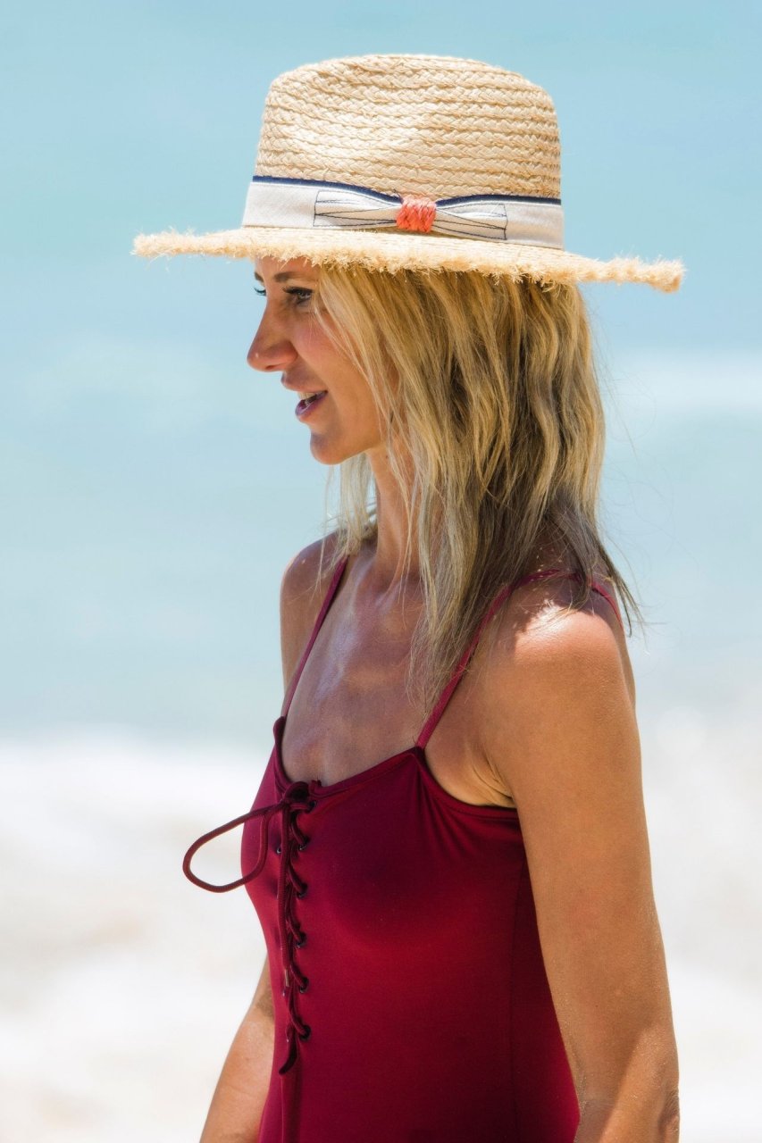 Lady Victoria Hervey luce un traje de baño rojo durante sus vacaciones en Barbados, 24/04/2019. Se la ve ajustándose el bañador antes de dirigirse a hacer paddle boarding.