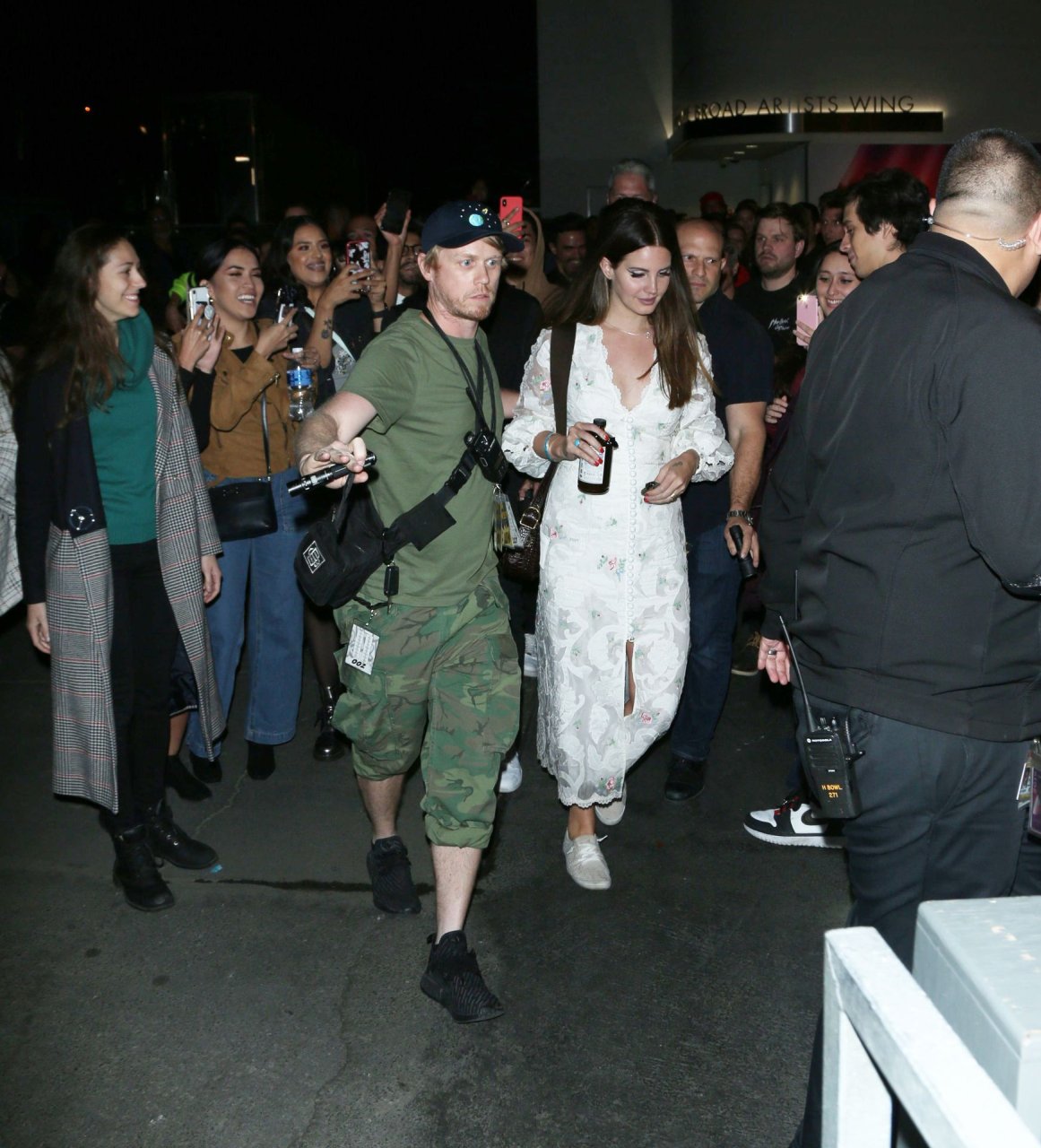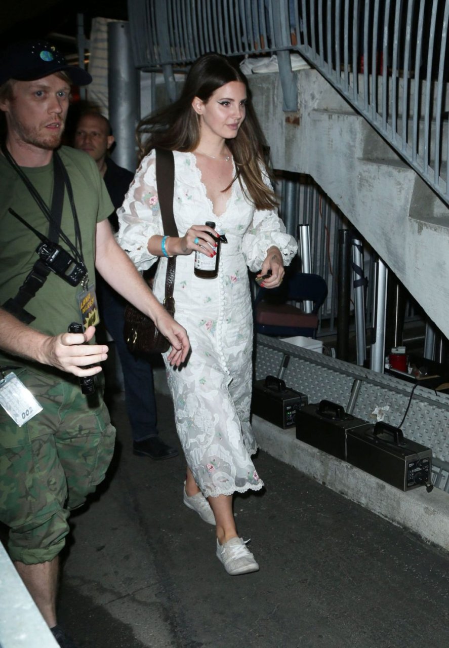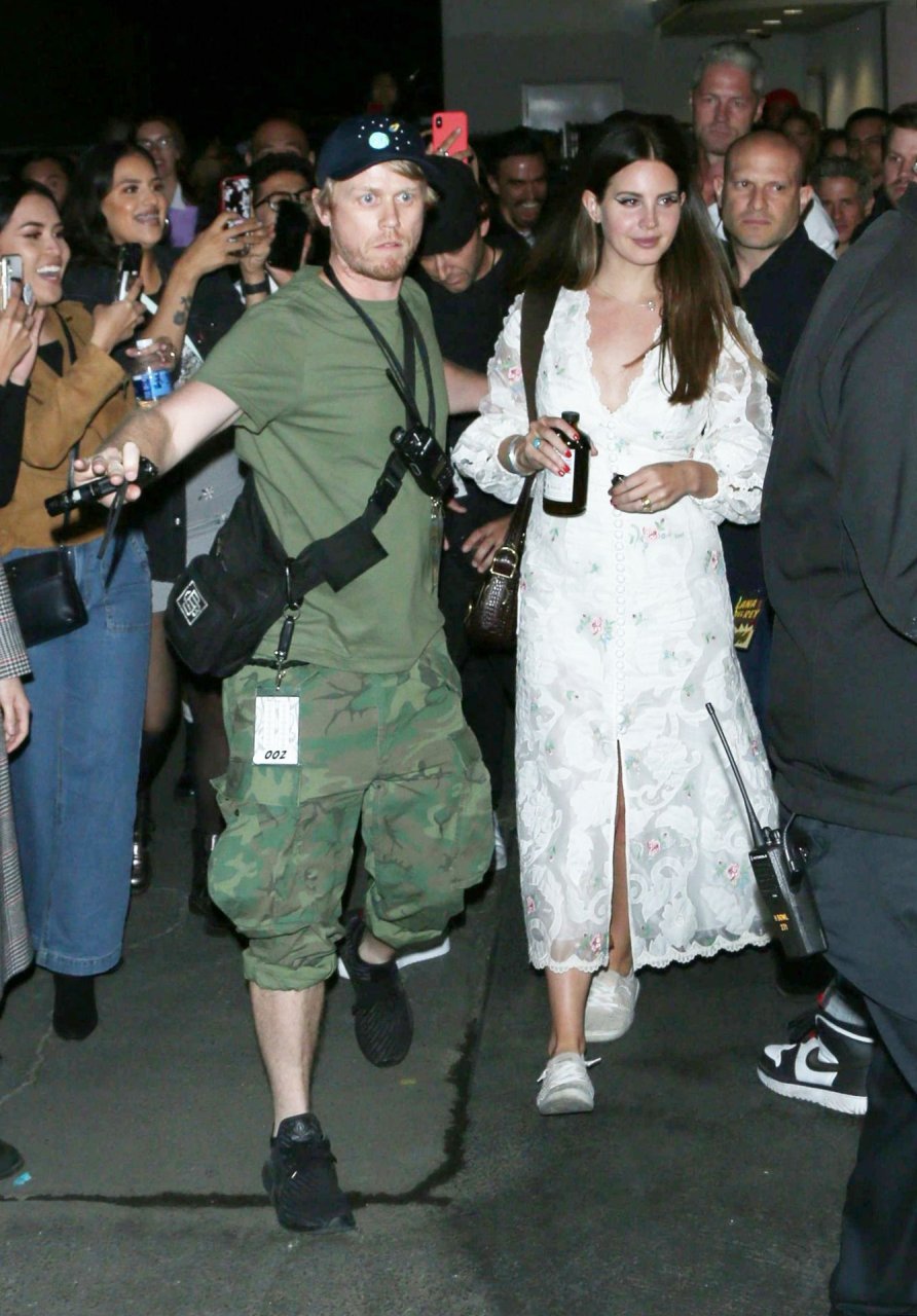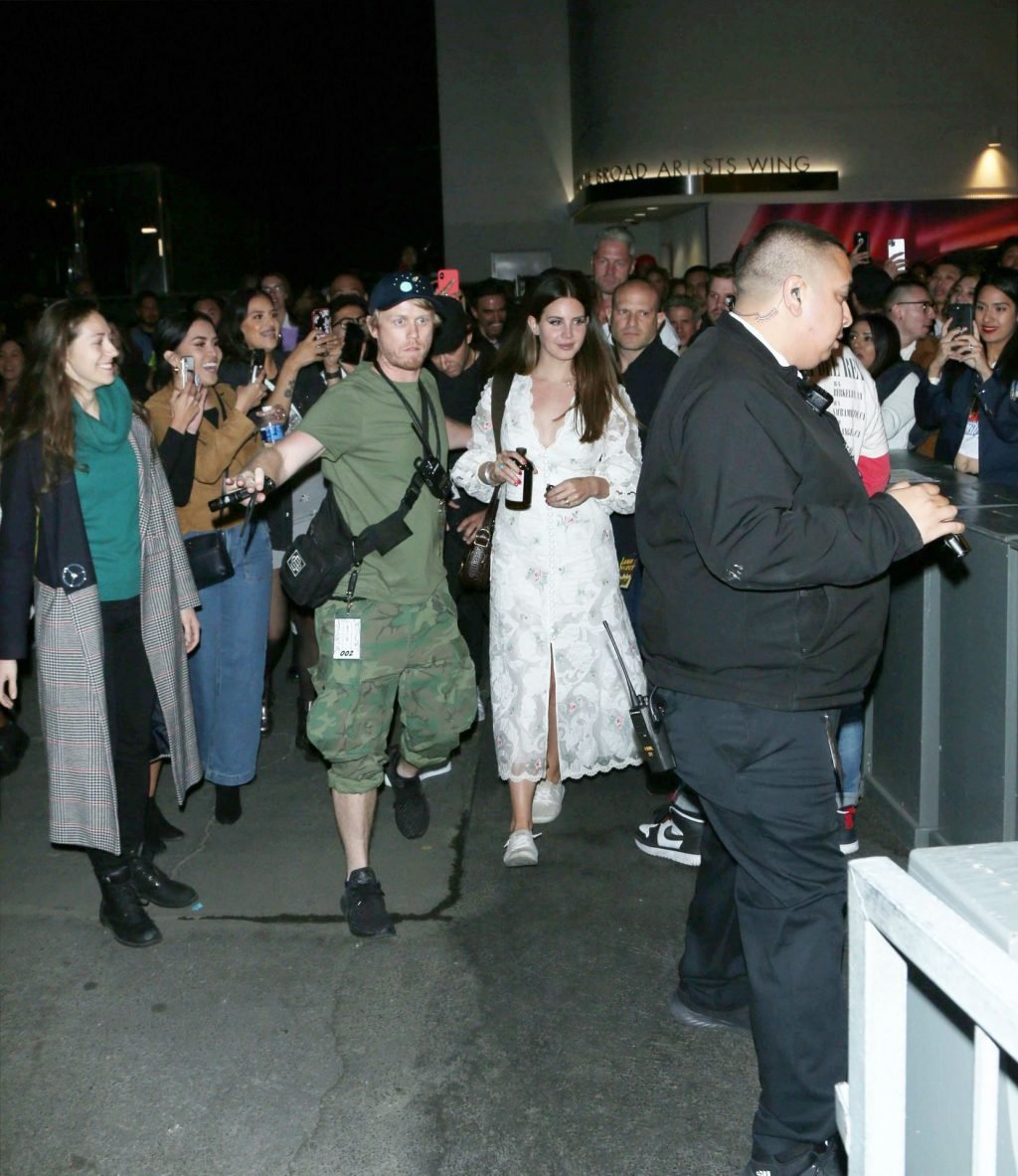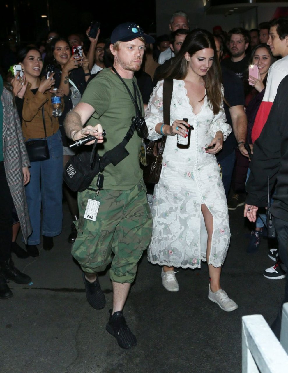 Lana Del Rey muestra un toque de escote en su elegante vestido blanco tras una actuación llena de estrellas en el Hollywood Bowl con Chris Isaak, Sean Ono Lennon, Jack Antonoff de Bleachers, Adam Cohen, Weyes Blood, Zella Day y Jesse Rutherford de The Neighbourhood, 11/10/2019. Lana se ve sosteniendo una botella del té probiótico Kombucha mientras atraviesa un mar de fans gritando.