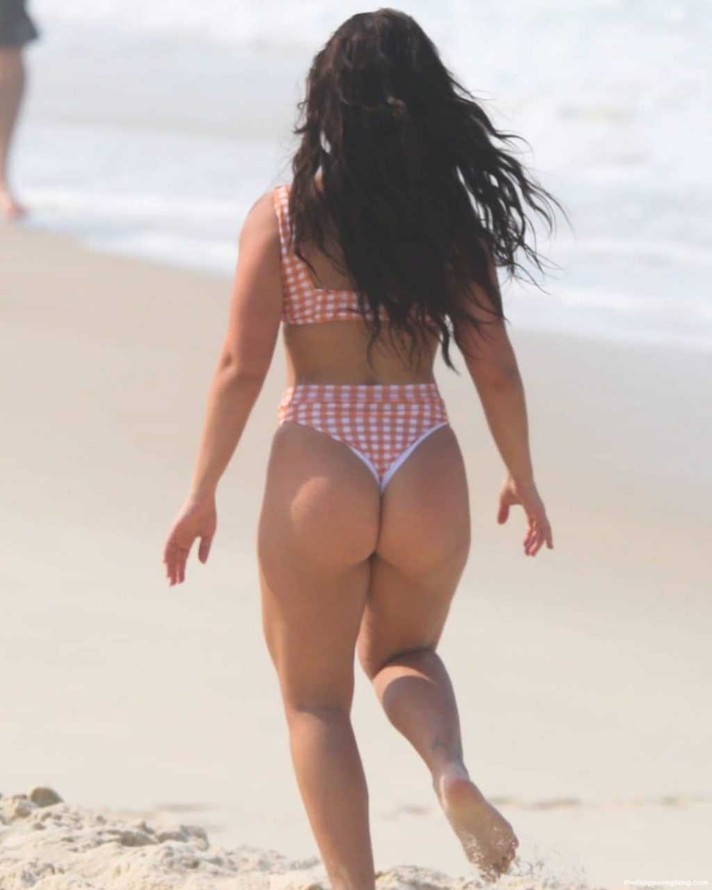 La actriz brasileña Larissa Manoela muestra su trasero con un clásico bikini de dos piezas mientras disfruta de un día en la playa con amigos.