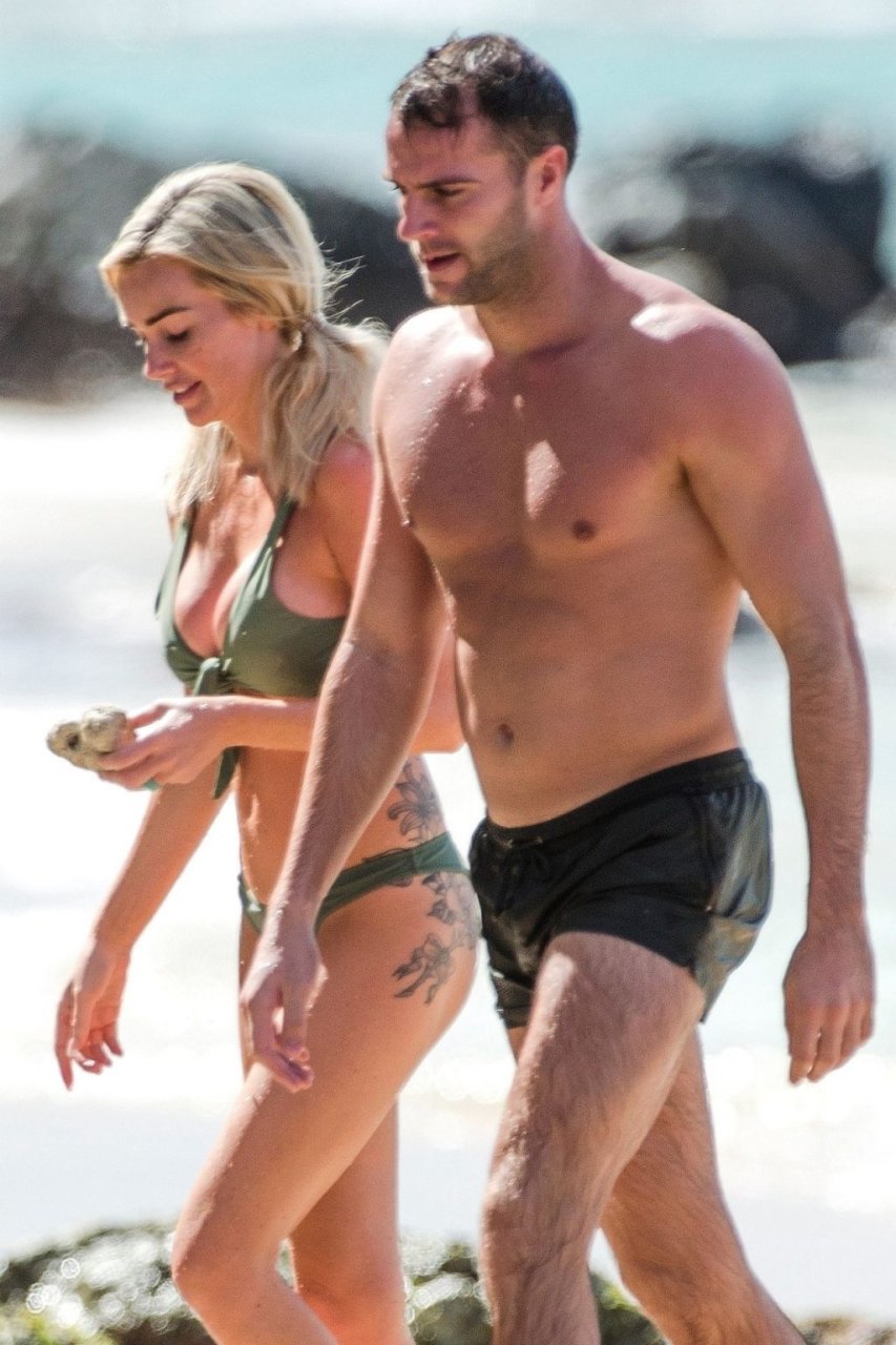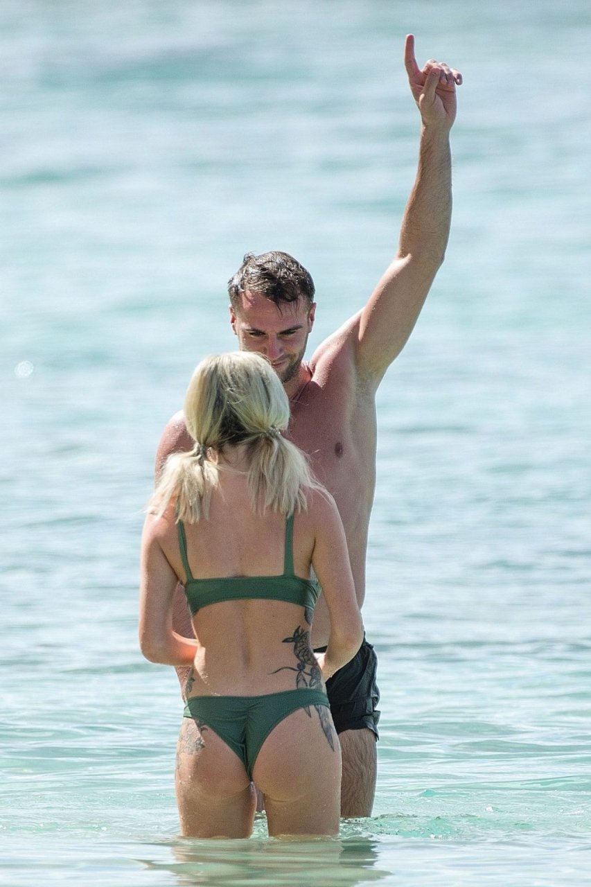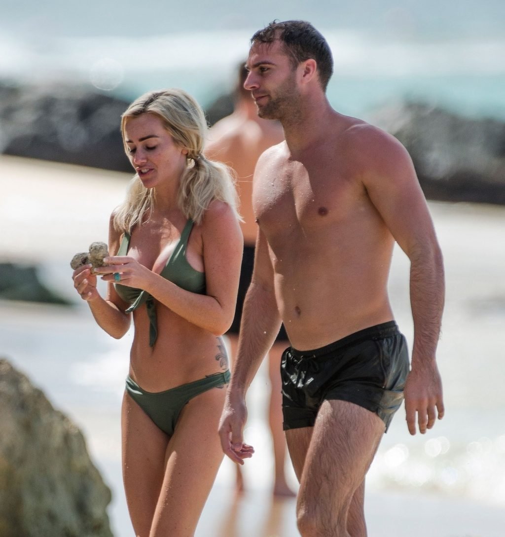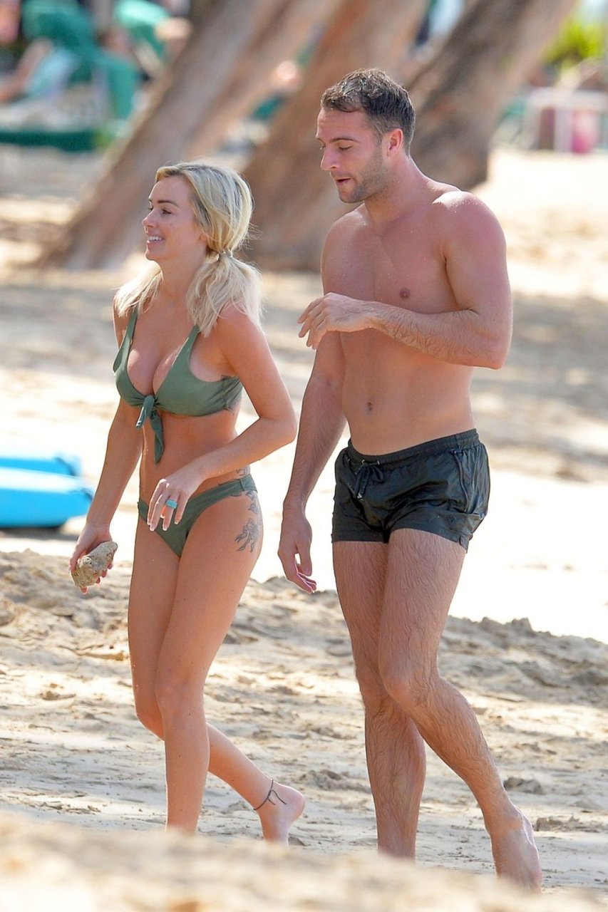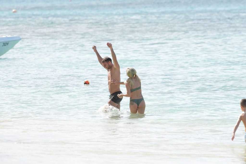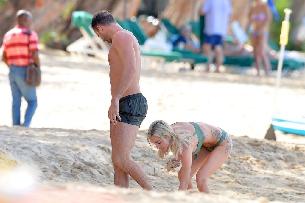 Pareja Laura Anderson y Max Morley están fotografiados en Barbados, 12/10/2018. La rubia de 29 años mostró su sexy cuerpo tatuado en bikini en la playa.
