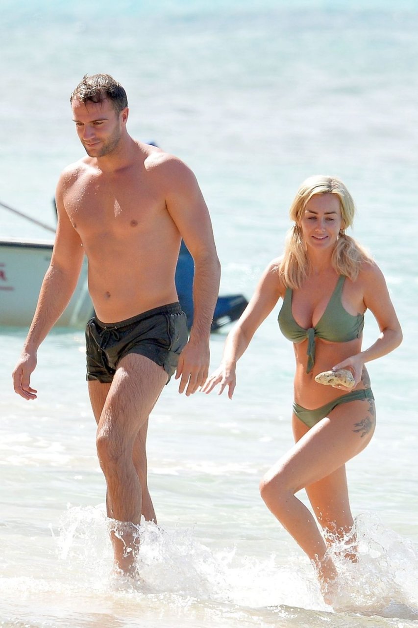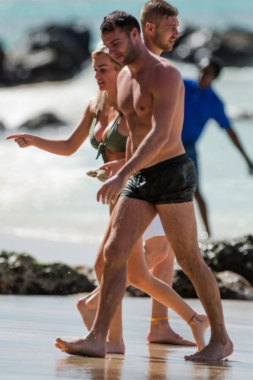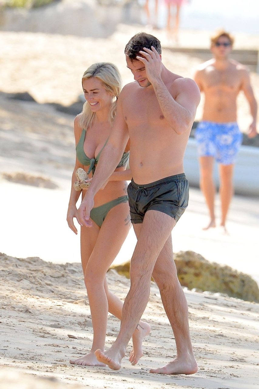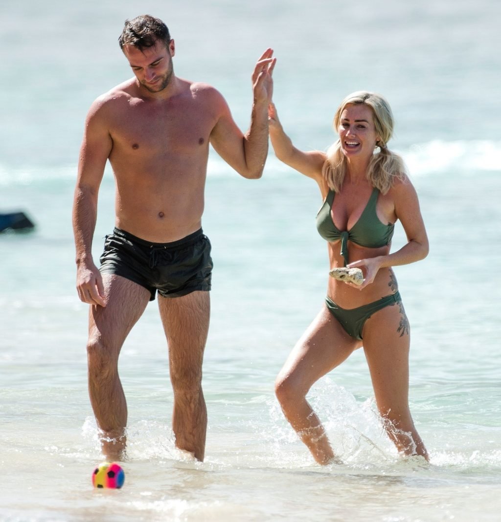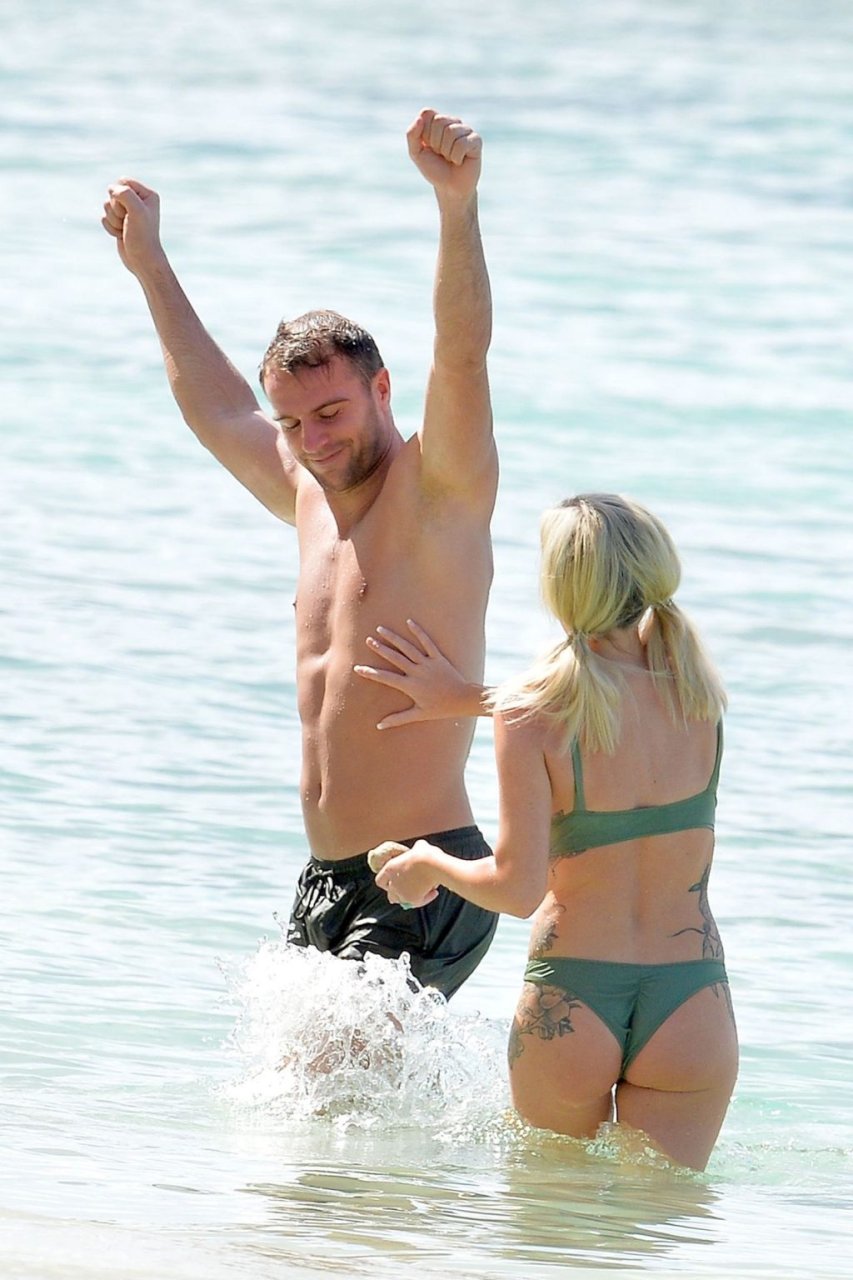Pareja Laura Anderson y Max Morley están fotografiados en Barbados, 12/10/2018. La rubia de 29 años mostró su sexy cuerpo tatuado en bikini en la playa.