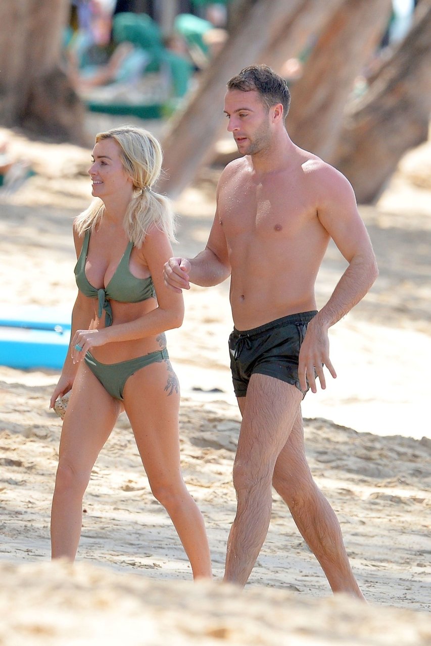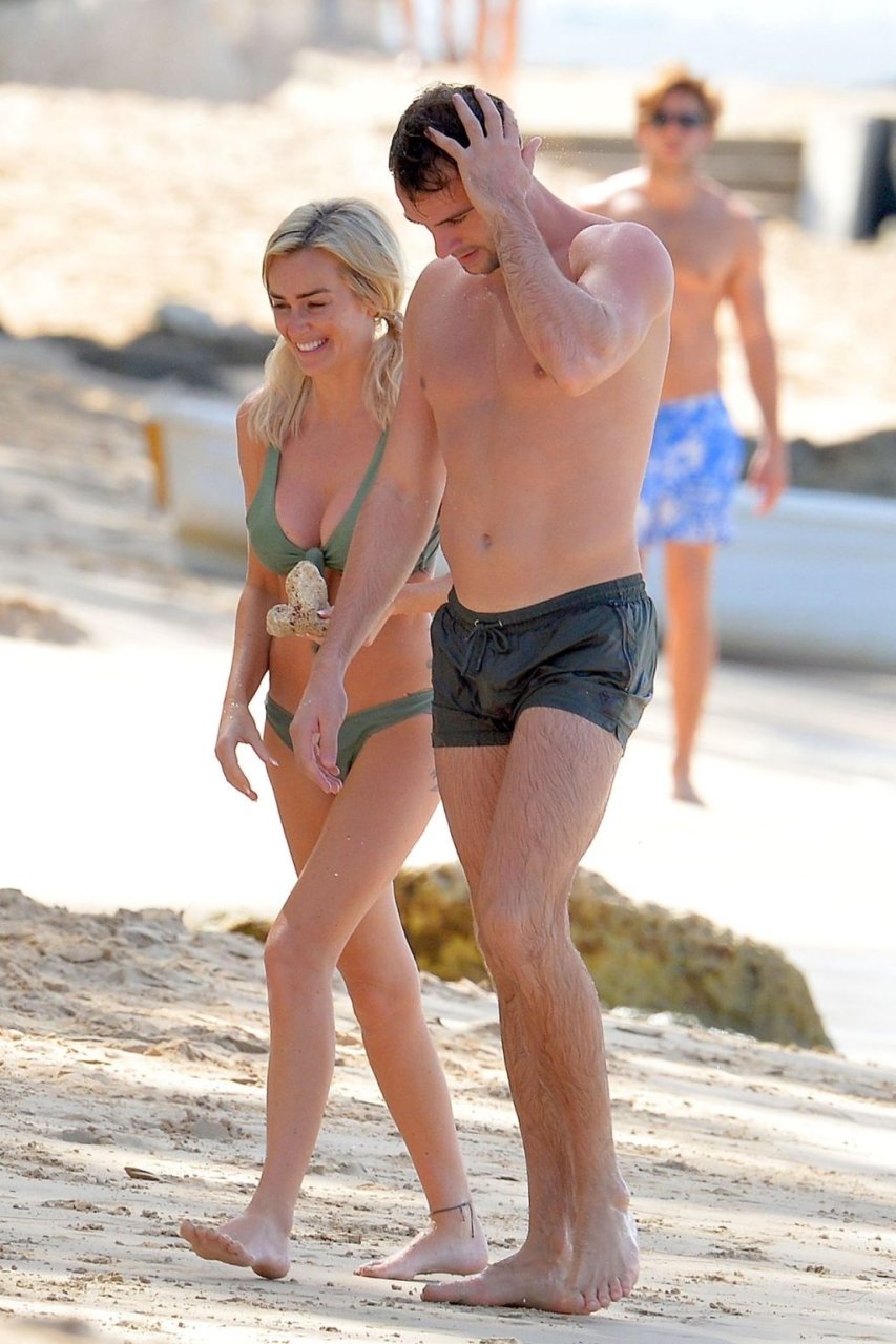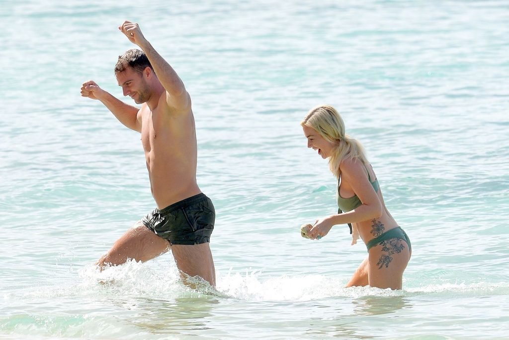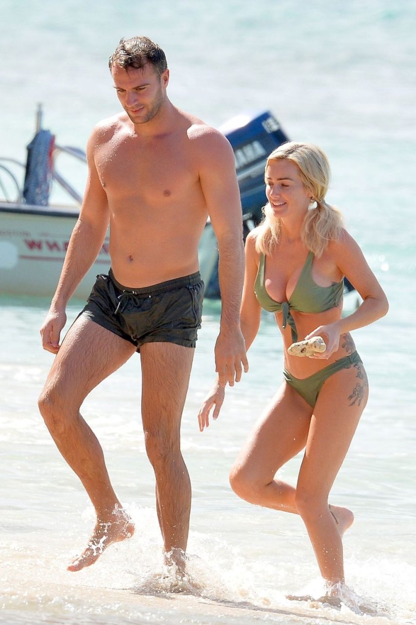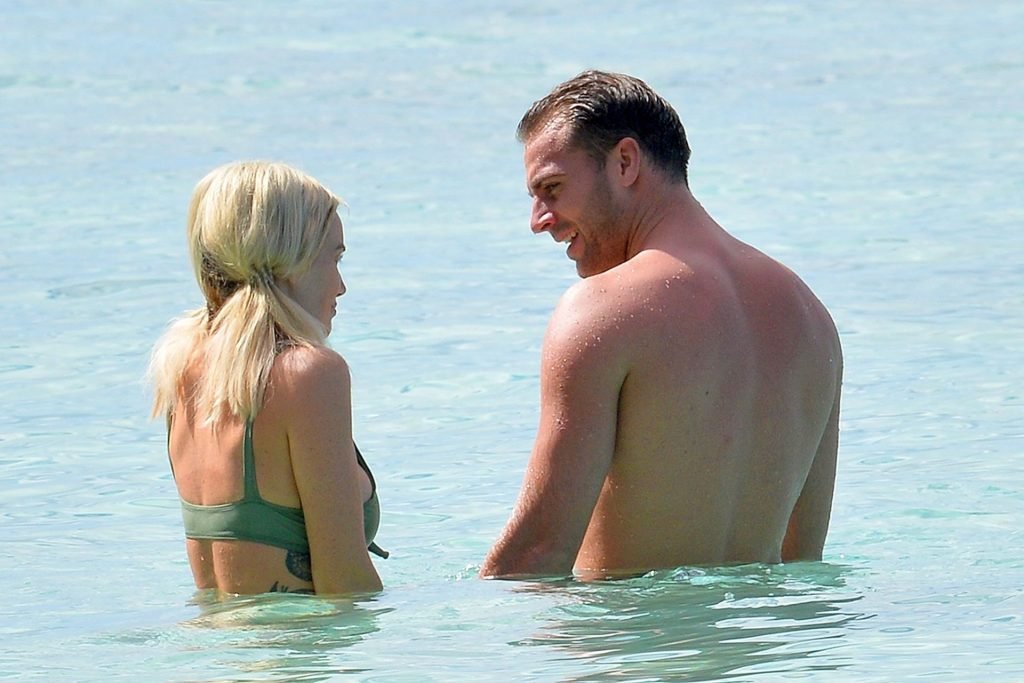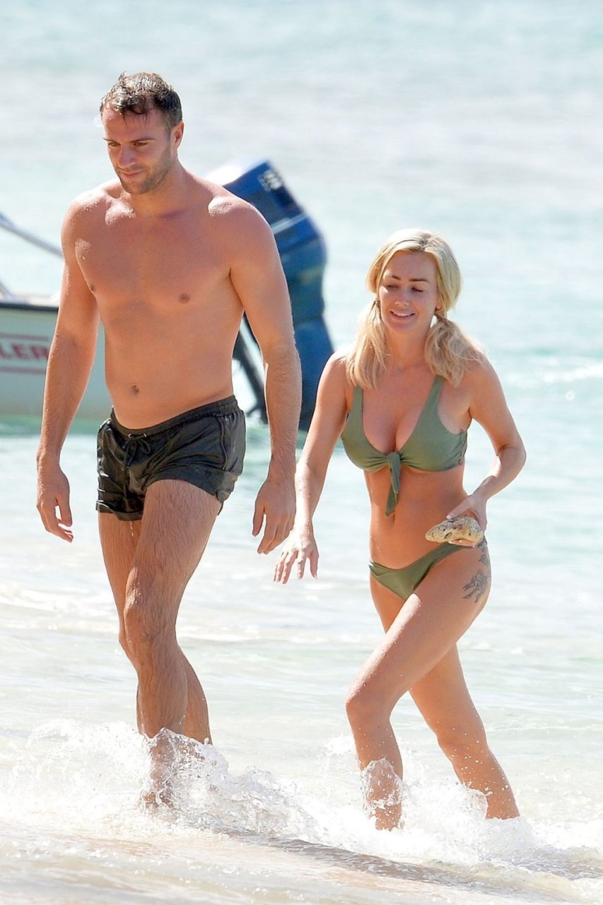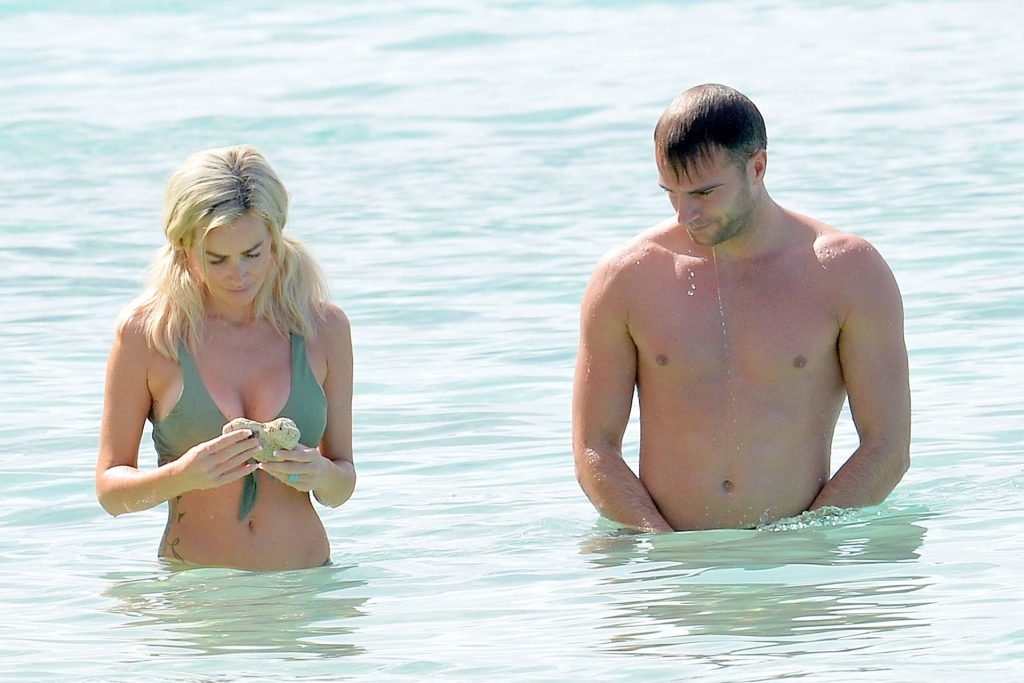 Pareja Laura Anderson y Max Morley están fotografiados en Barbados, 12/10/2018. La rubia de 29 años mostró su sexy cuerpo tatuado en bikini en la playa.