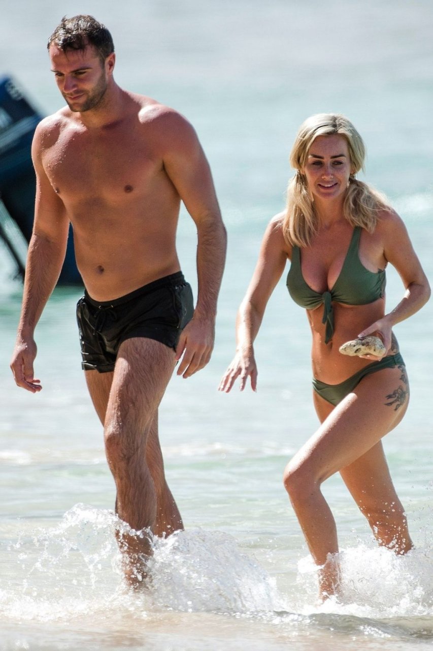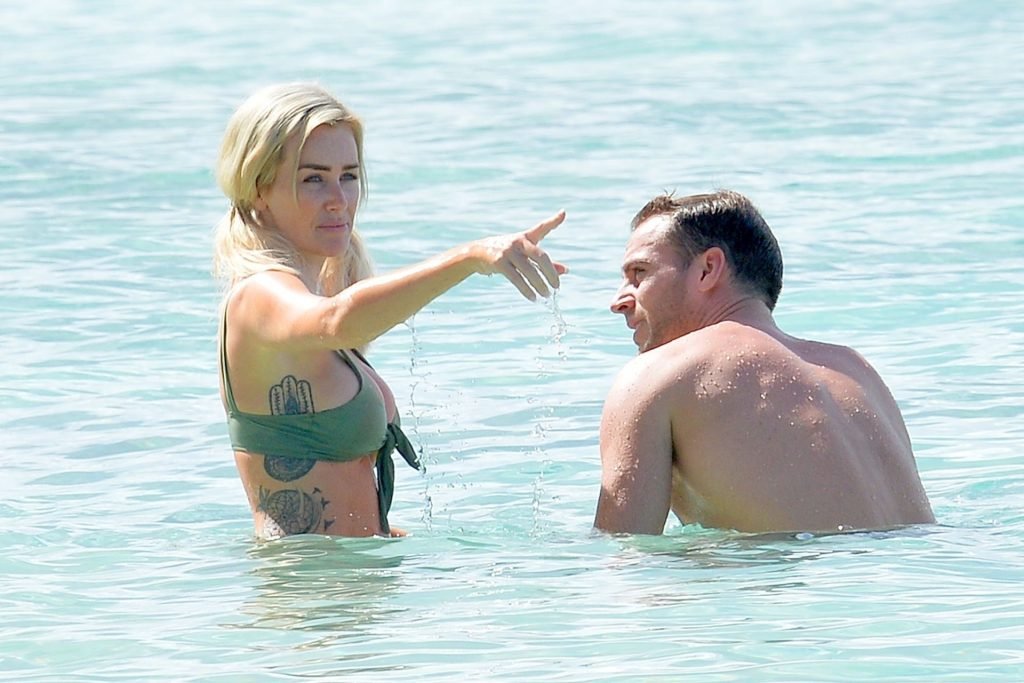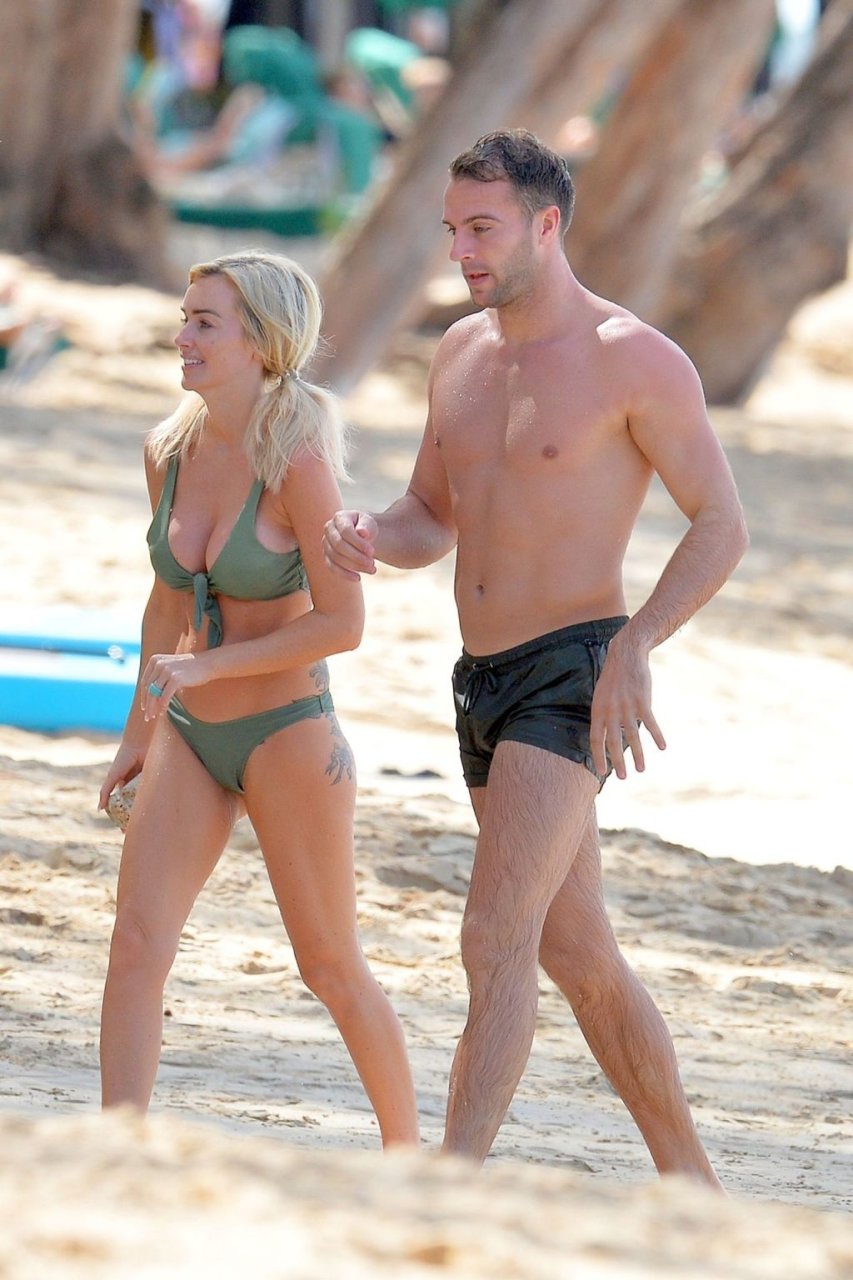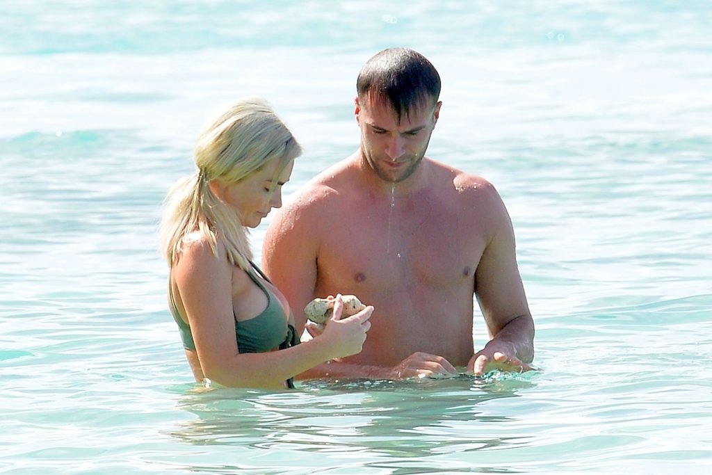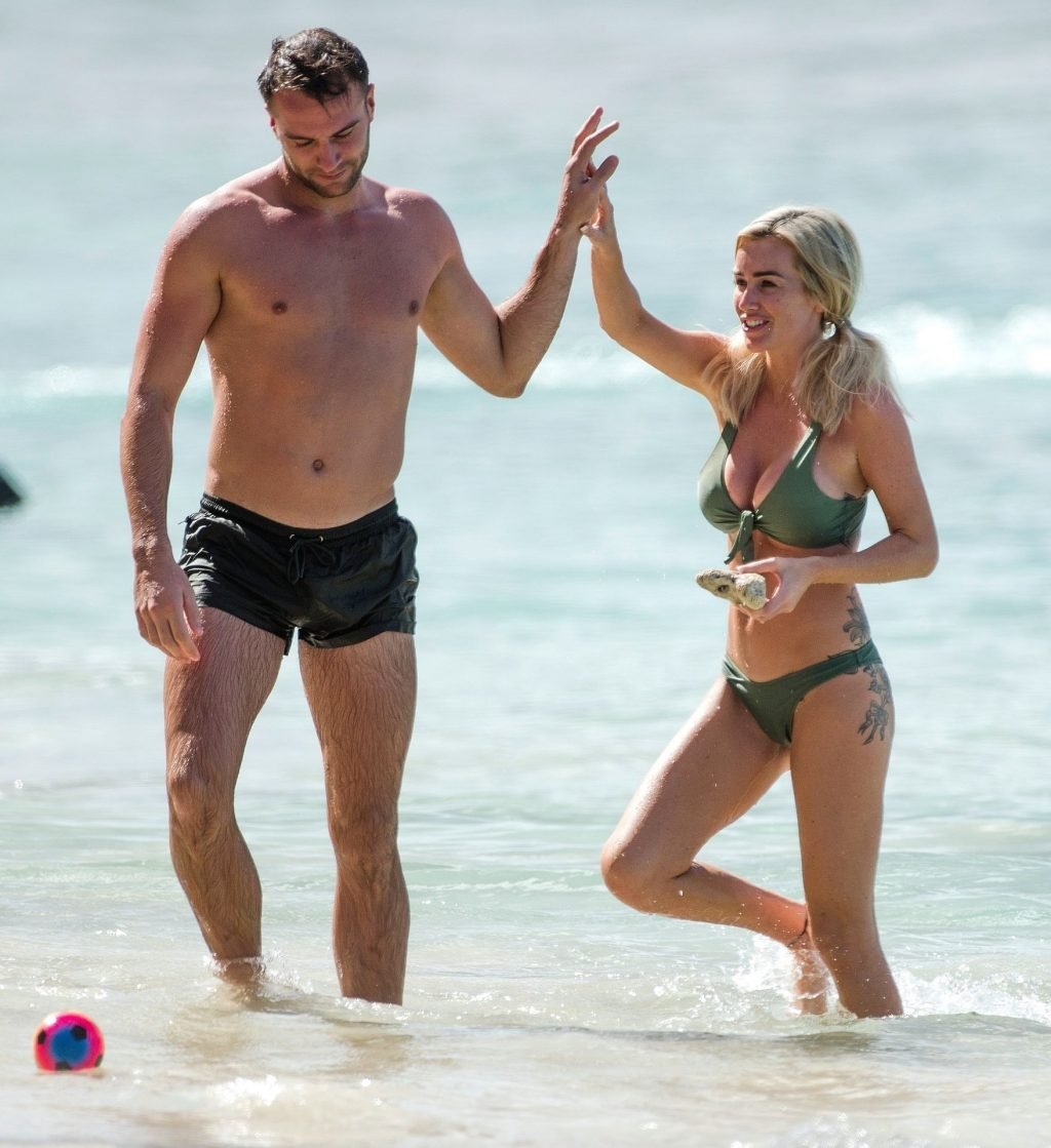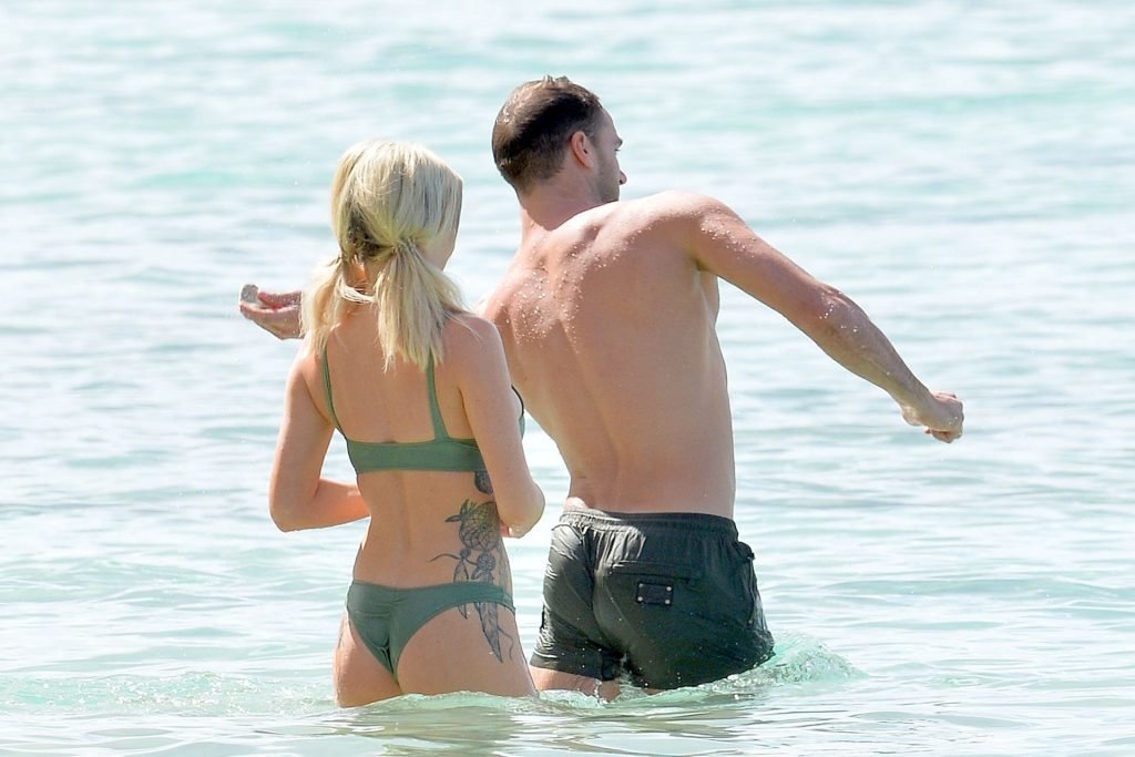 Pareja Laura Anderson y Max Morley están fotografiados en Barbados, 12/10/2018. La rubia de 29 años mostró su sexy cuerpo tatuado en bikini en la playa.