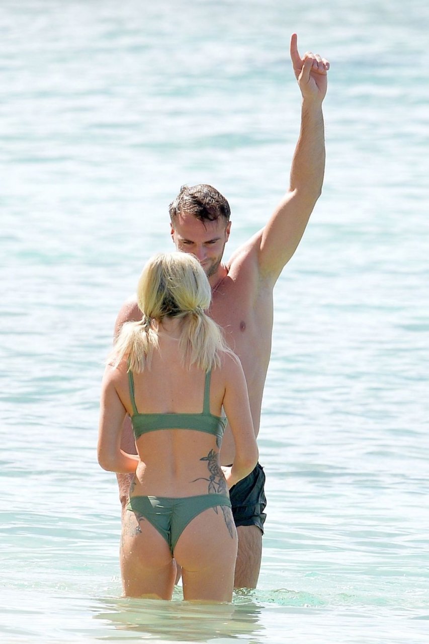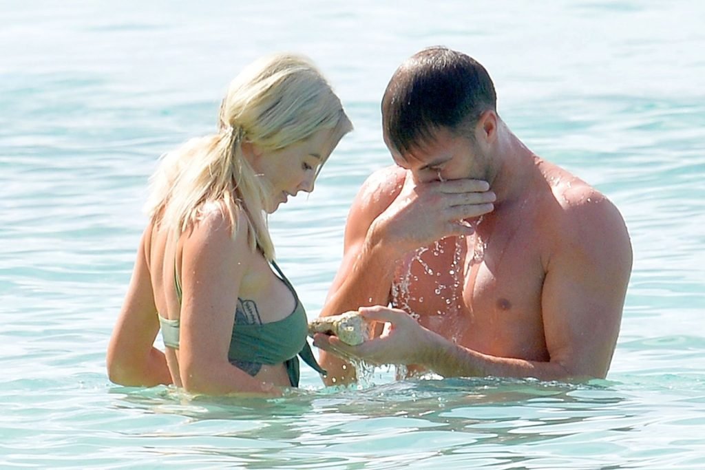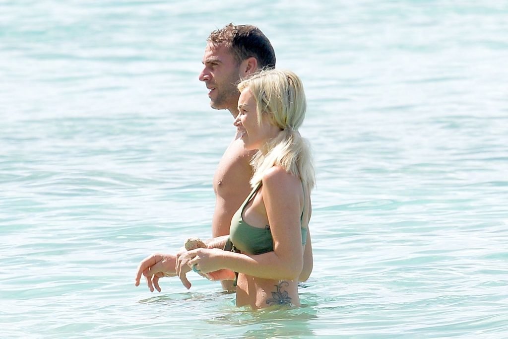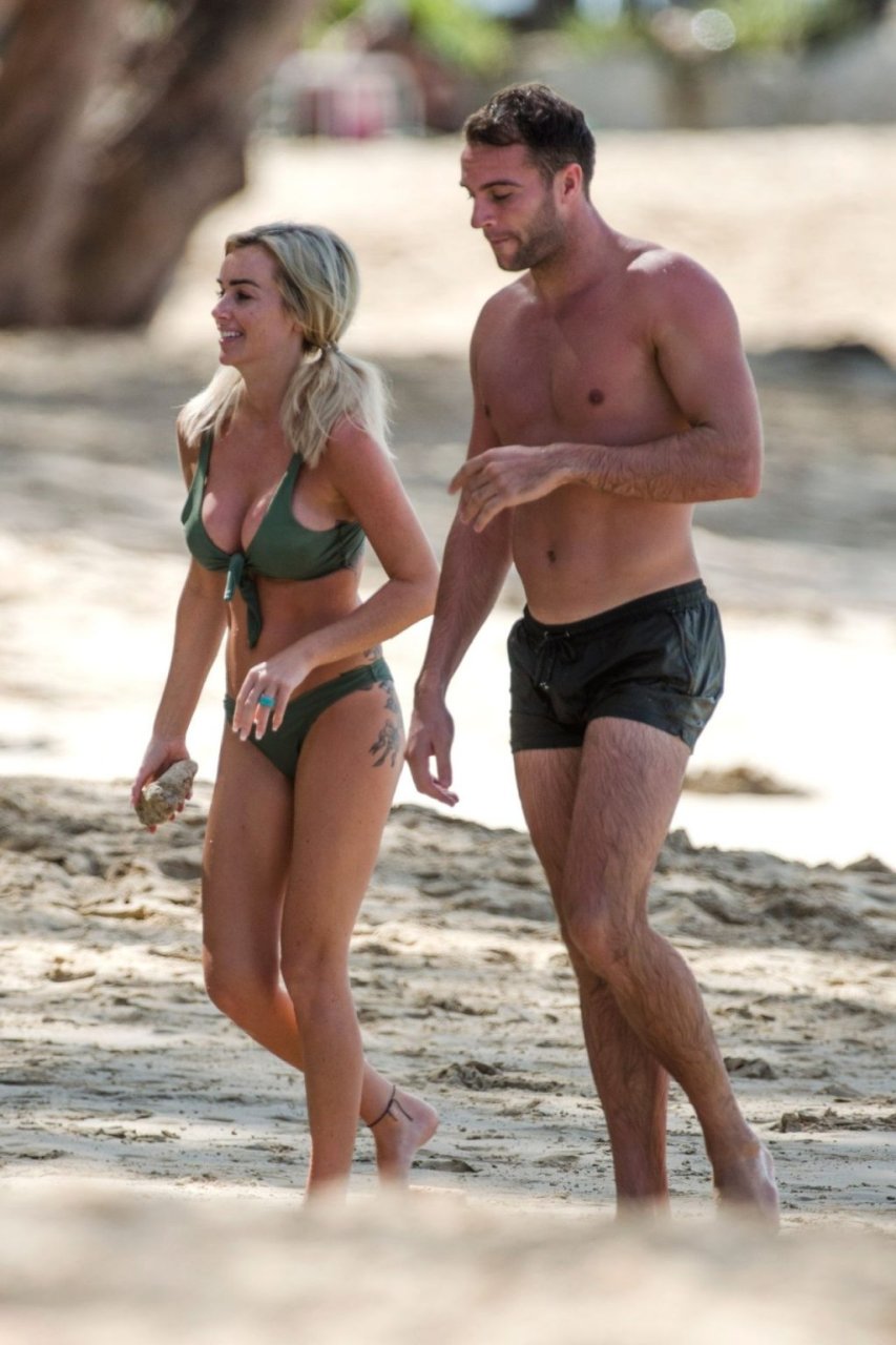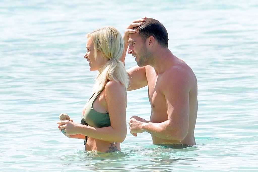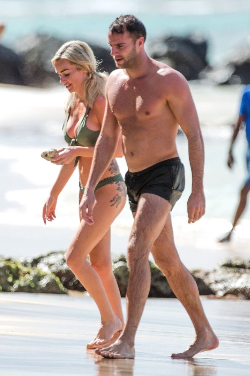 Pareja Laura Anderson y Max Morley están fotografiados en Barbados, 12/10/2018. La rubia de 29 años mostró su sexy cuerpo tatuado en bikini en la playa.