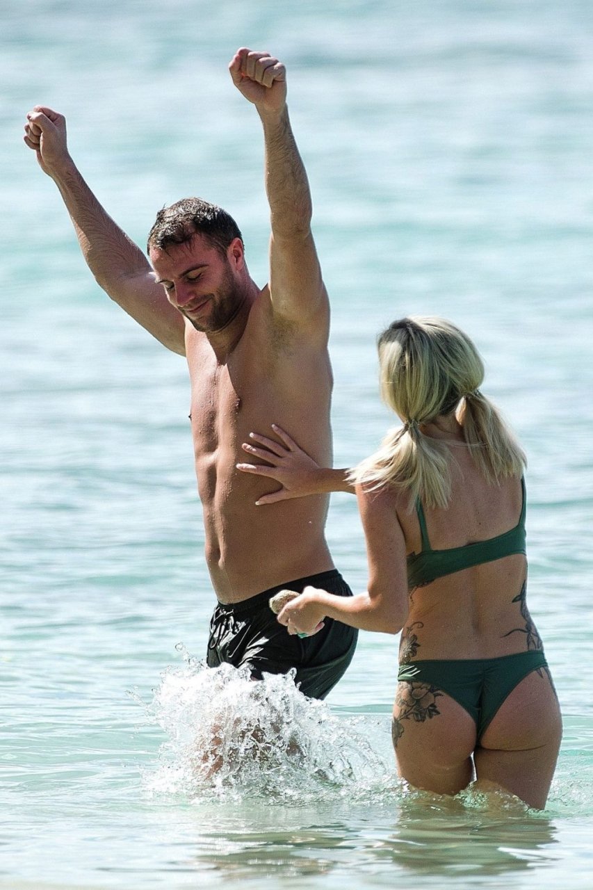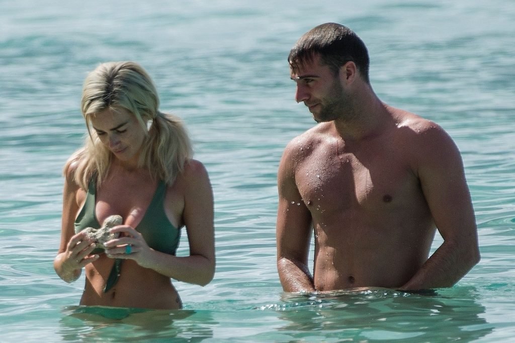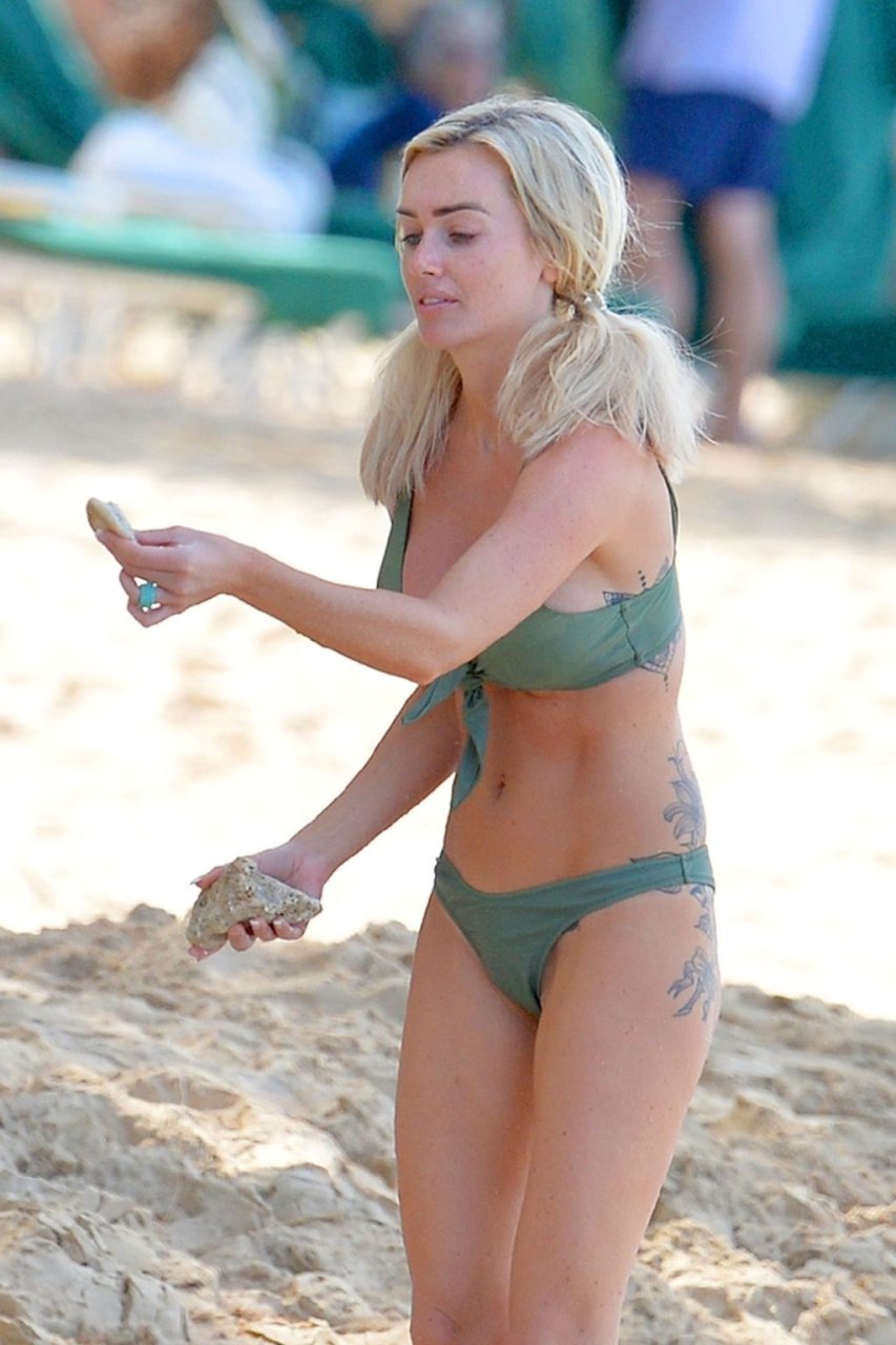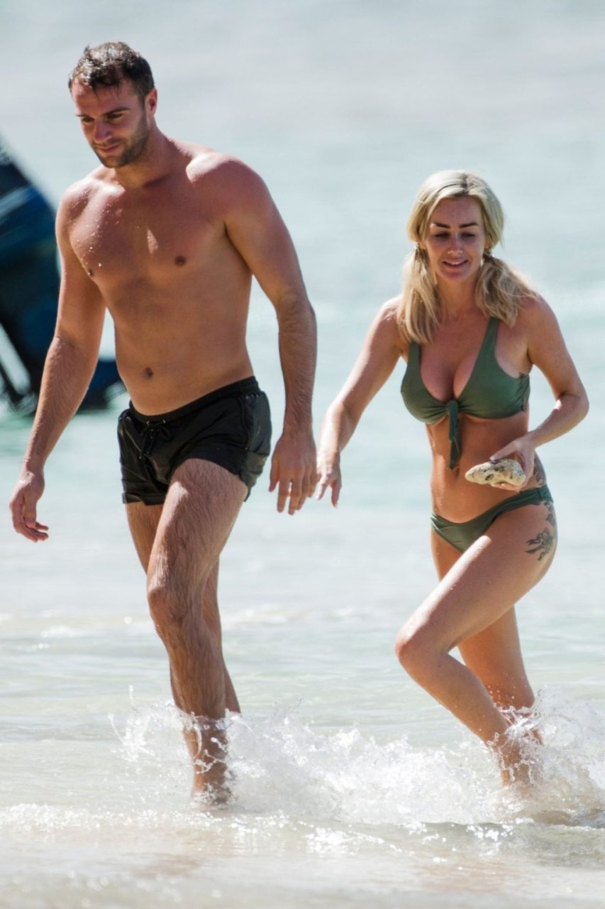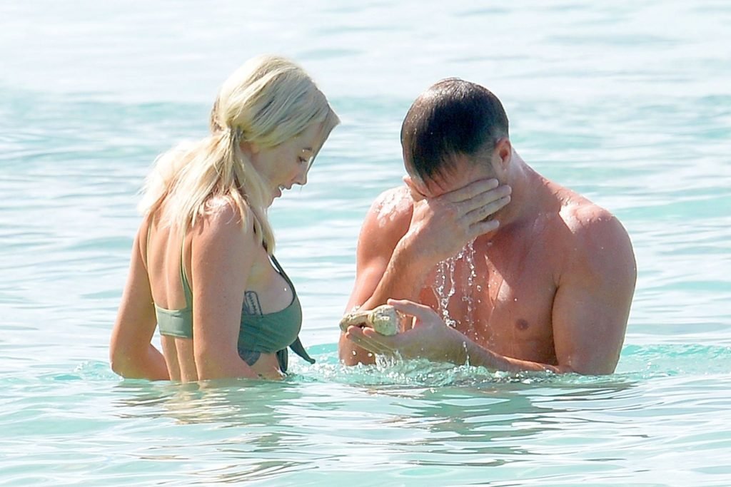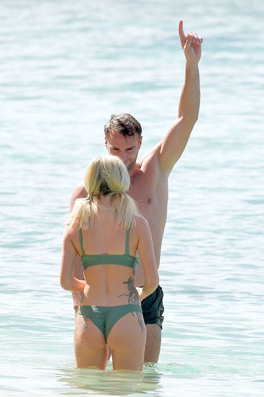 Pareja Laura Anderson y Max Morley están fotografiados en Barbados, 12/10/2018. La rubia de 29 años mostró su sexy cuerpo tatuado en bikini en la playa.
