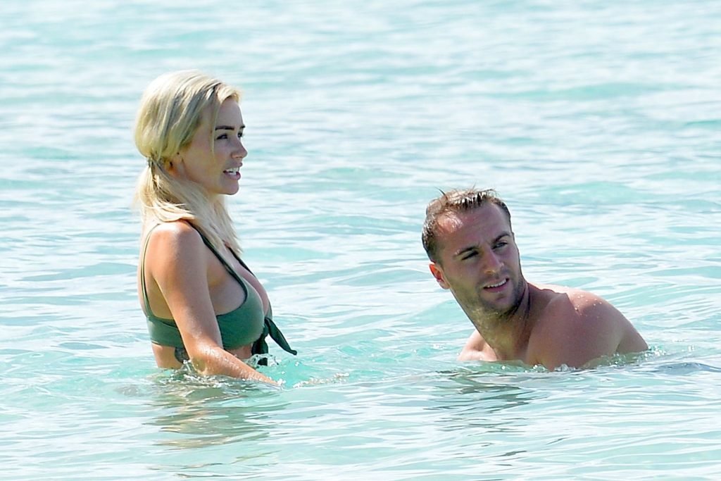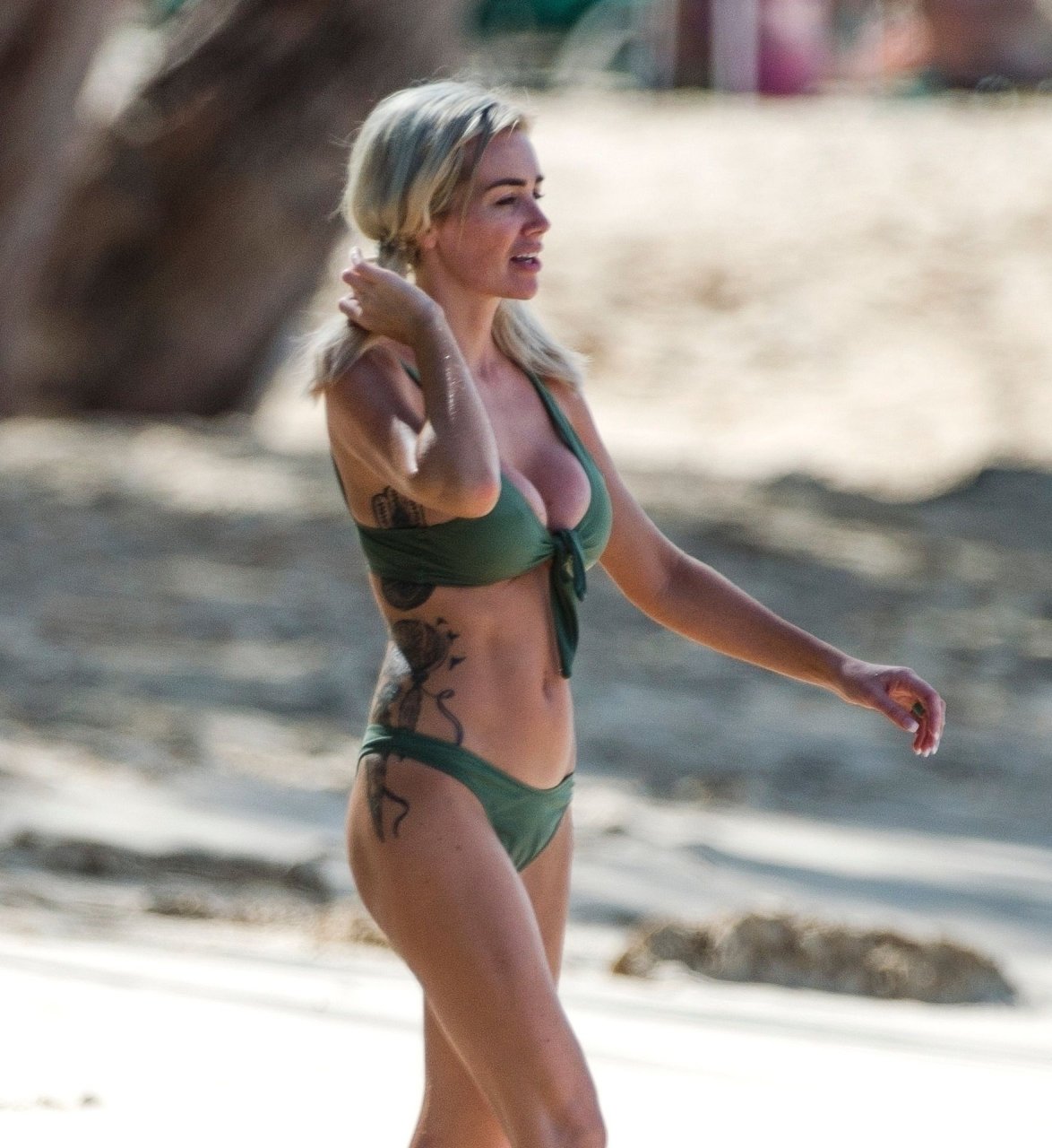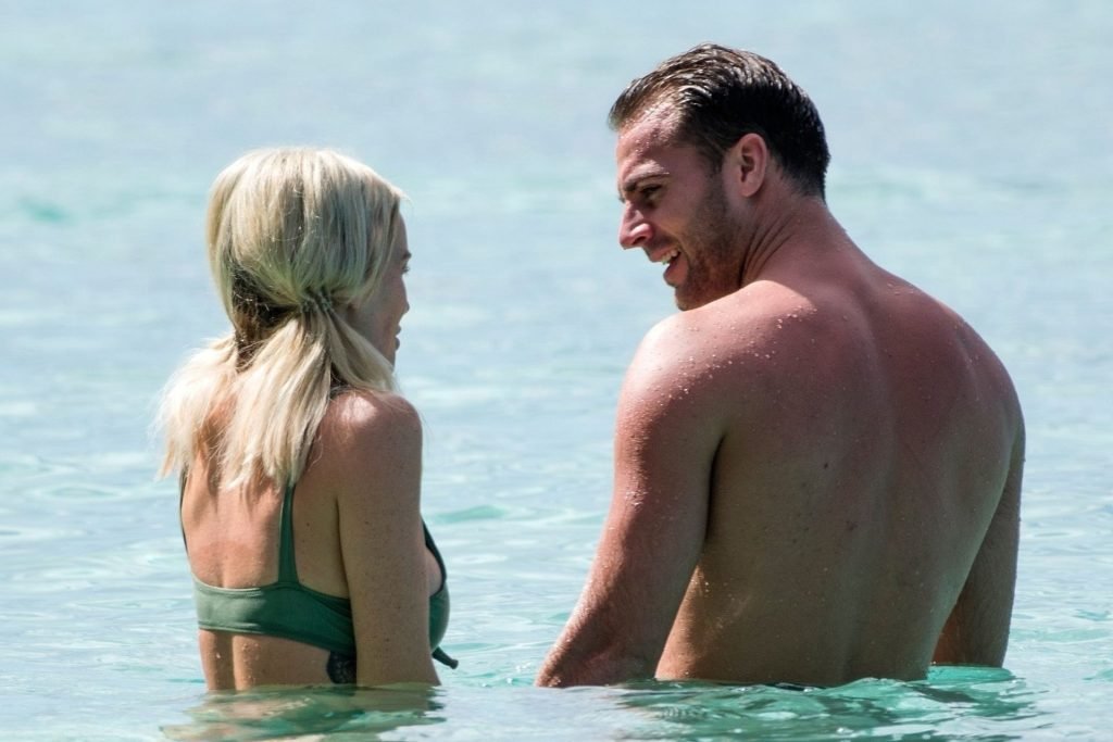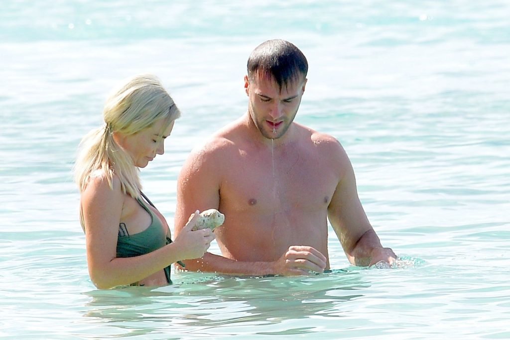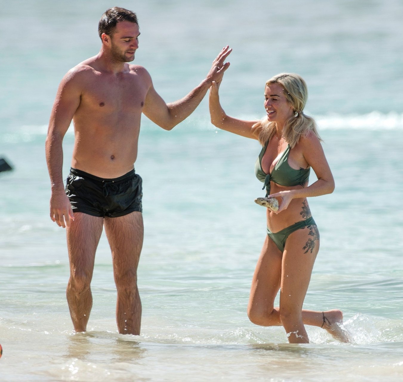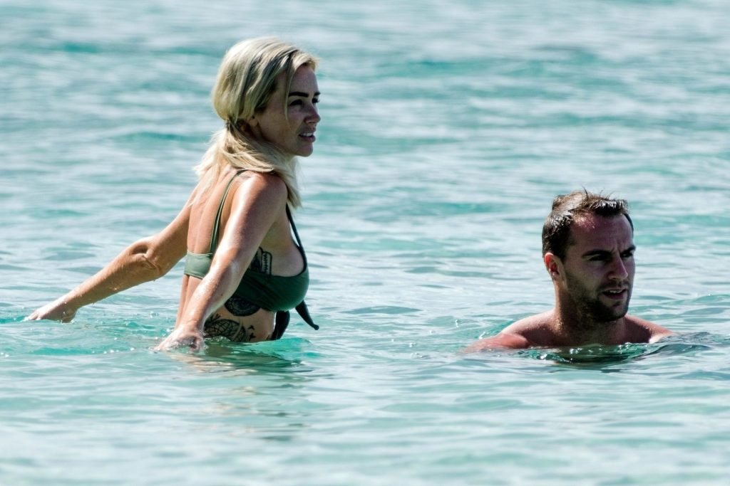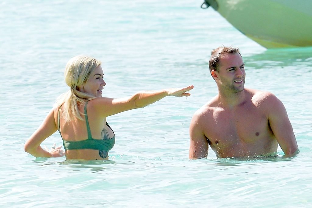 Pareja Laura Anderson y Max Morley están fotografiados en Barbados, 12/10/2018. La rubia de 29 años mostró su sexy cuerpo tatuado en bikini en la playa.