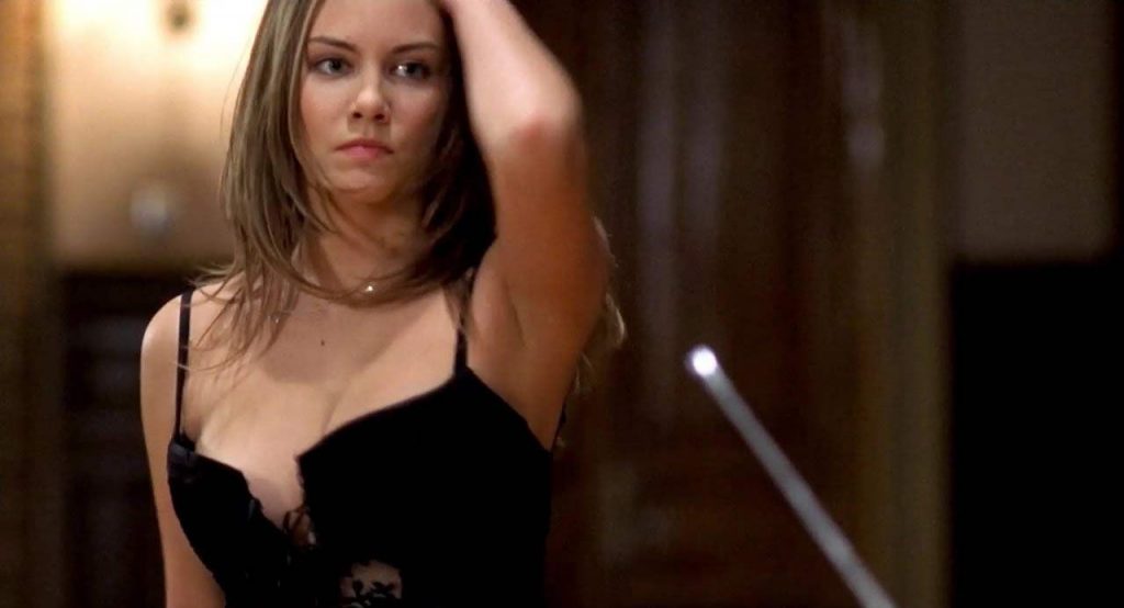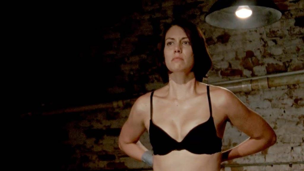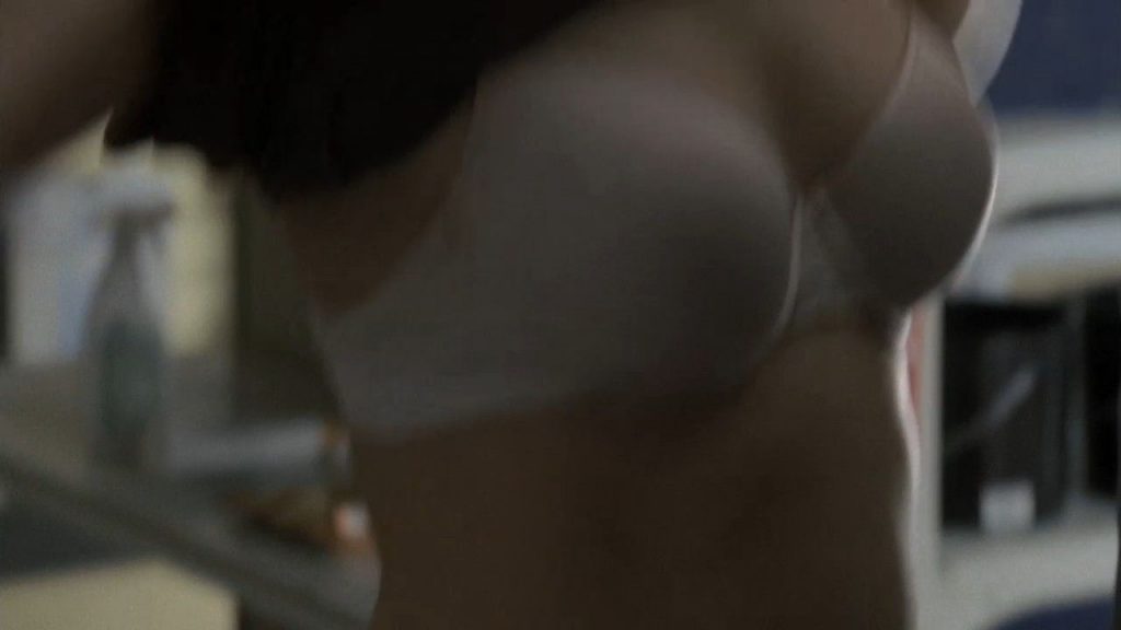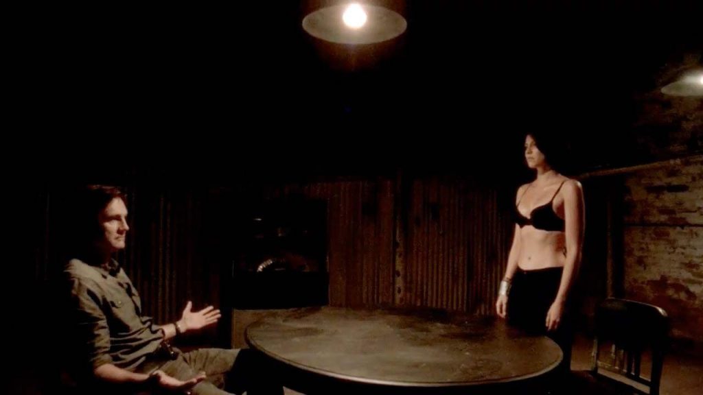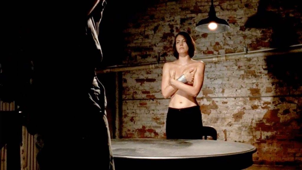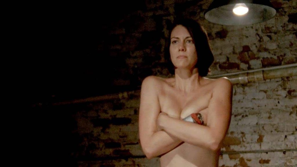 Here Lauren Cohan is standing in a room with the man. She is showing cleavage in a black bra, as the guy is sitting at a table. He tells Cohan to take it off, as the result she goes topless and covers boobs with hands. Lauren then gets angry, until finally, we see the man stands up and walks over to her. One more hot scene in a row of forced sex!