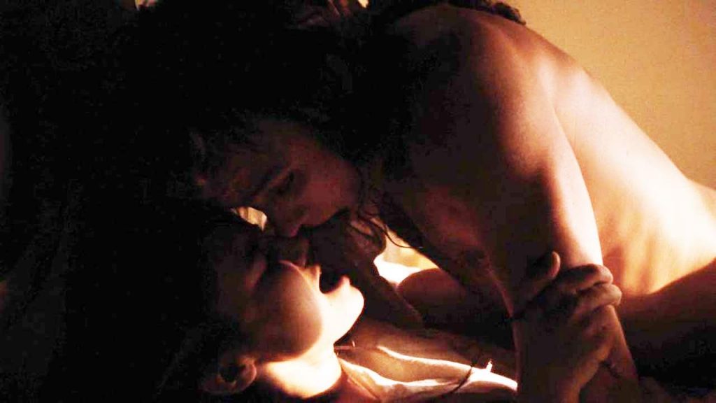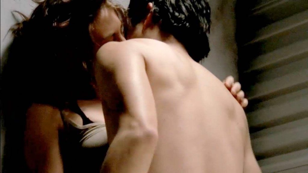 After the showering scene, we have Lauren Cohan and the same boyfriend in passionately sex scene from the same series. In the center of the scene, Lauren is wearing a black bra and a tank top, while the man is on top of her. They are making out, as he is taking her panties off to fuck her. Eventually, the scene is zooming out, and we see them on the table.