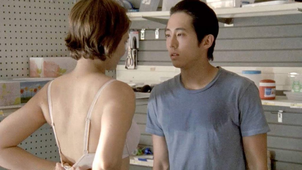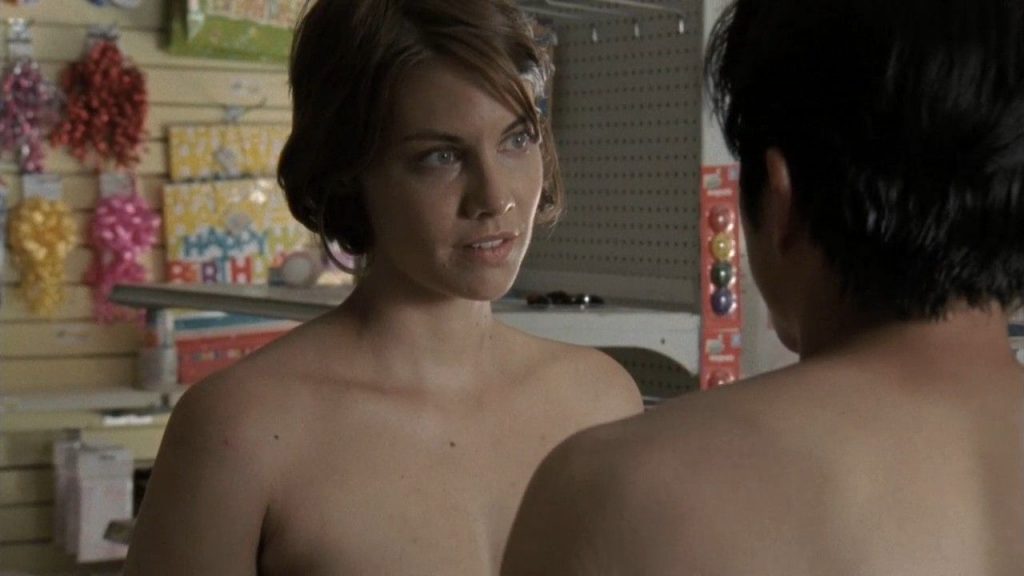 Hot brunette Lauren Cohan is here standing in a store, as she removes the black shirt. As a result, she reveals a white bra and then removing it. At the same time, she reveals the side of her right boob, before she starts kissing the guy.