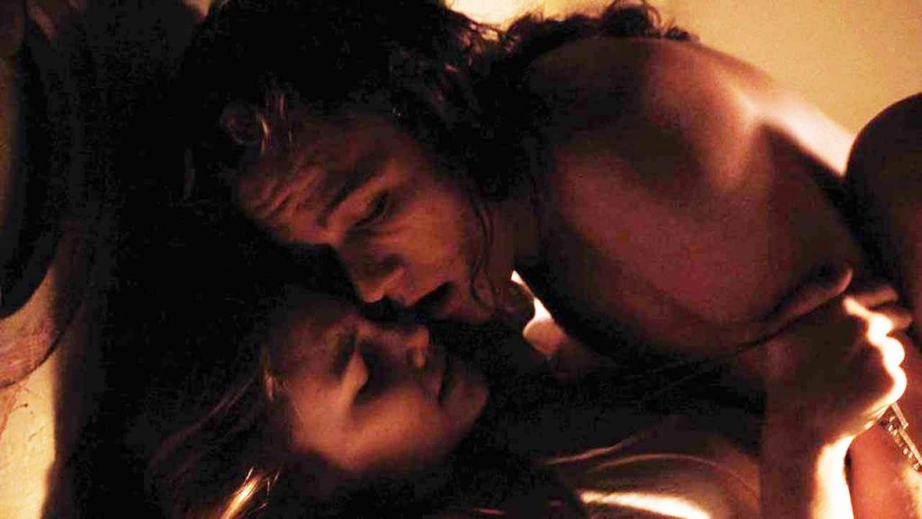 Then Lauren Cohan is seen in a sword fight with a guy! In that case, the man uses the situation and tears open Lauren’s top with his sword. He reveals the cleavage, but then Cohan is ripping his shirt open. Finally, she is tearing the man’s pants! In the same time, causing them to fall down. She is still showing deep cleavage, as they continue to sword fighting.