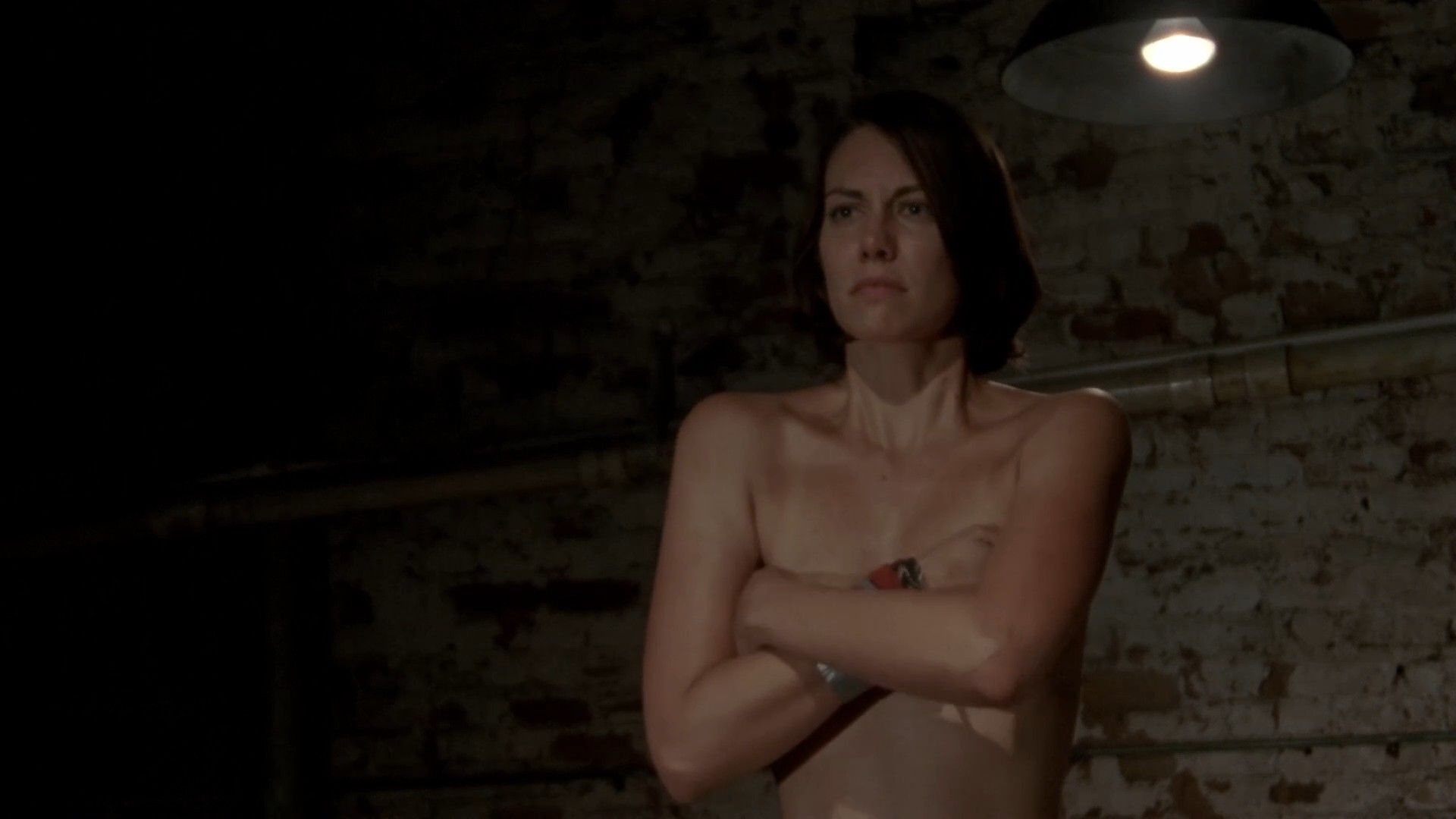 Here Lauren Cohan is standing in a room with the man. She is showing cleavage in a black bra, as the guy is sitting at a table. He tells Cohan to take it off, as the result she goes topless and covers boobs with hands. Lauren then gets angry, until finally, we see the man stands up and walks over to her. One more hot scene in a row of forced sex!