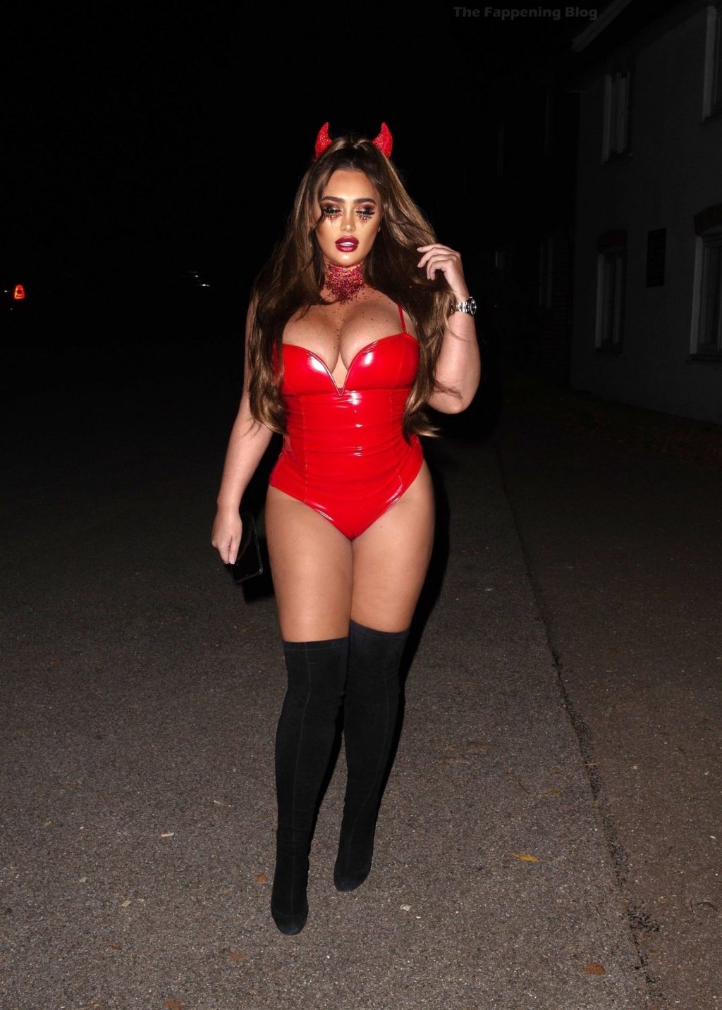 Lauren Goodger se mete en el espíritu de Halloween mientras se la ve saliendo en Essex anoche. La estrella de reality muestra su increíble trasero y escote con un ajustado disfraz de diablo rojo.