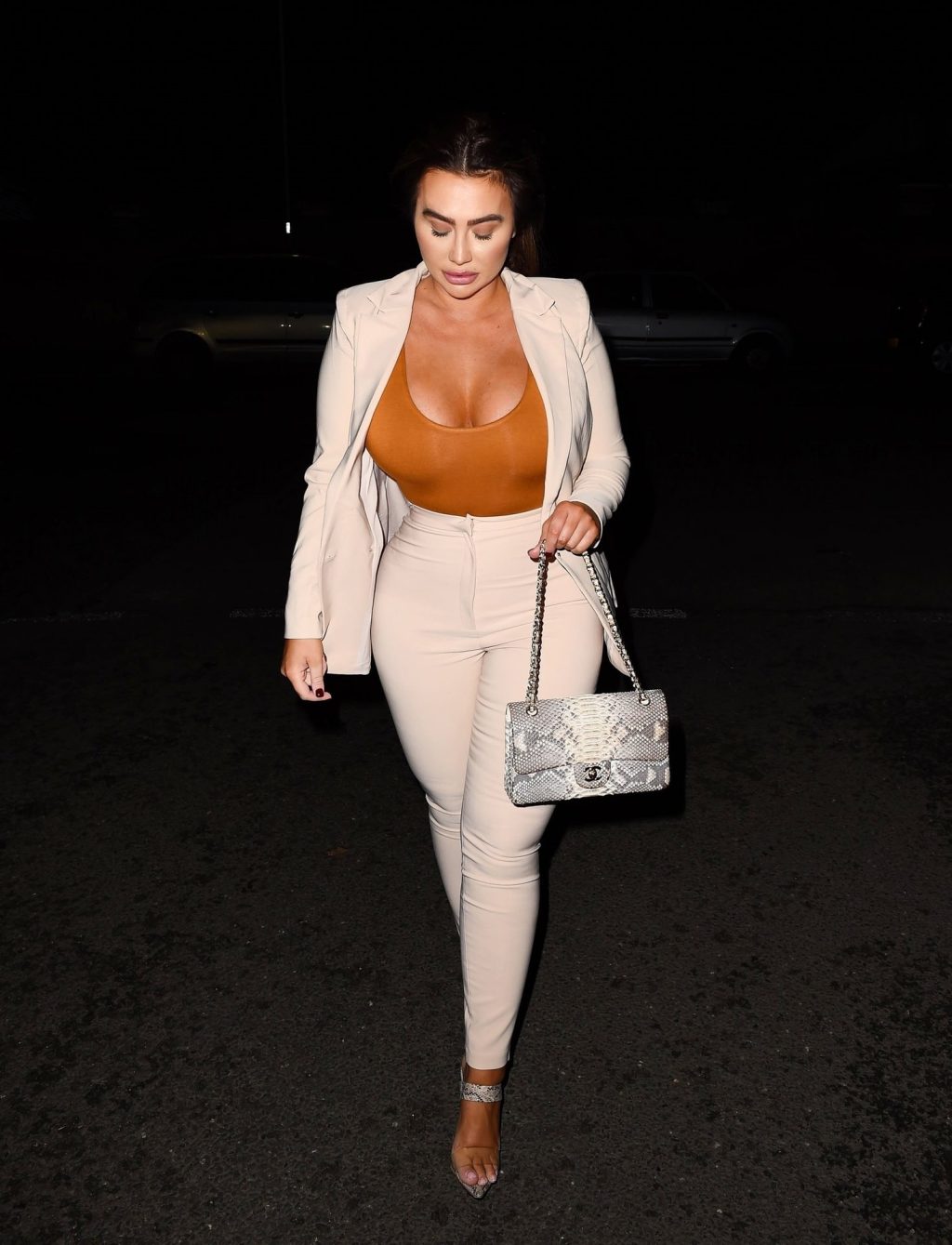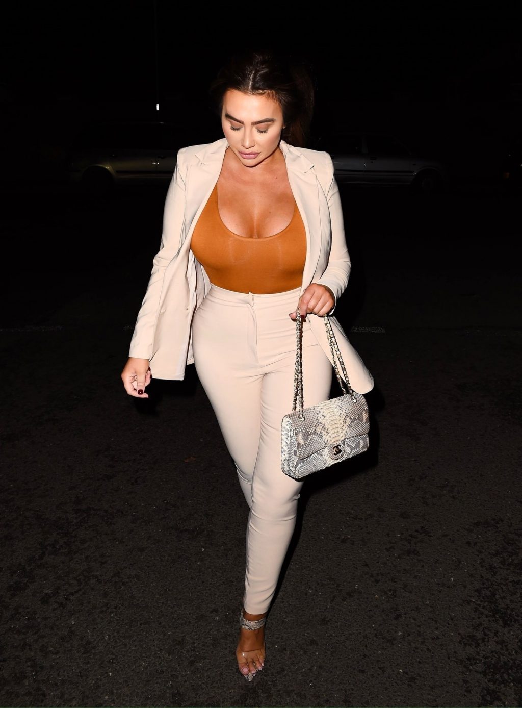 La estrella de reality parecía de buen ánimo a pesar de su reciente escándalo relacionado con productos dietéticos. La chica de Essex muestra su trasero curvilíneo con un traje blanco y una blusa marrón mientras se dirige al restaurante.