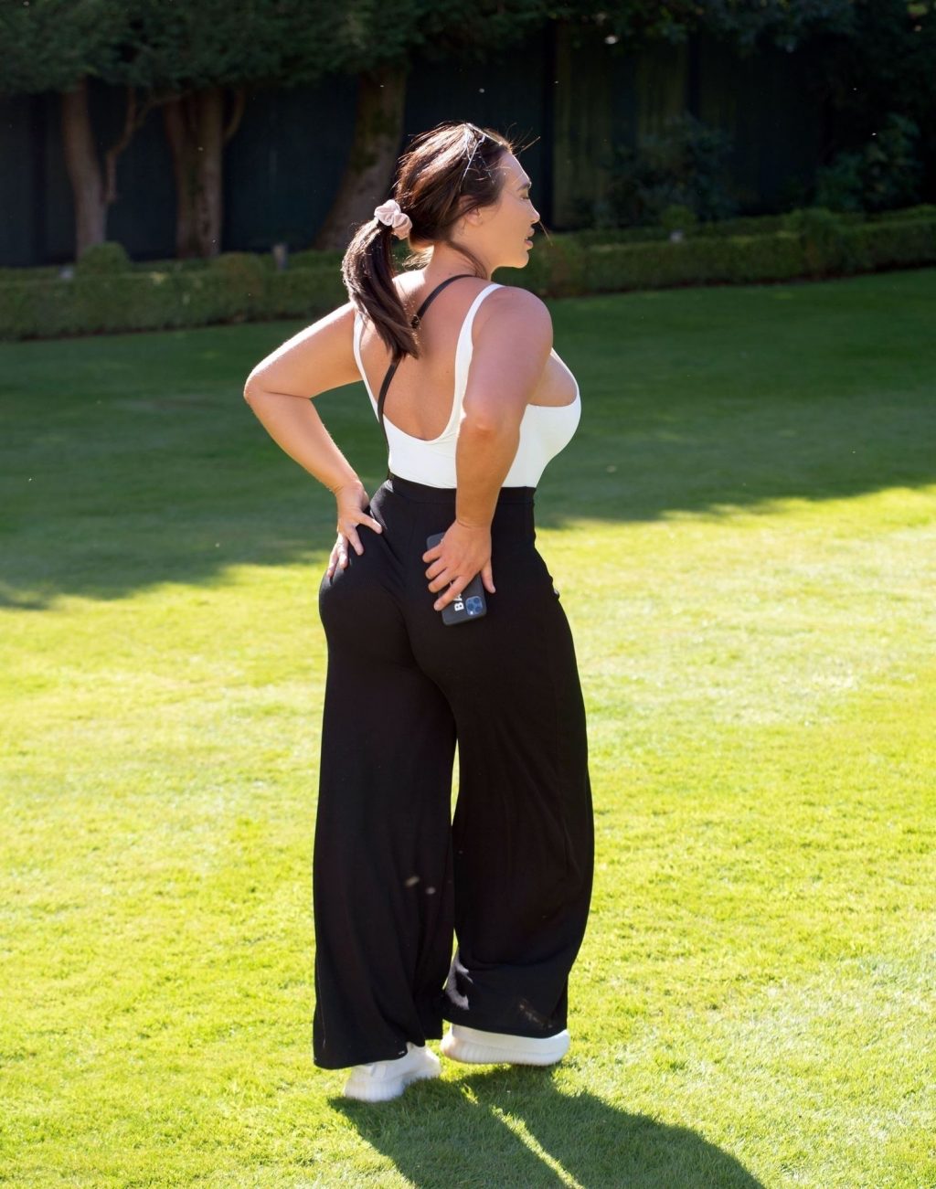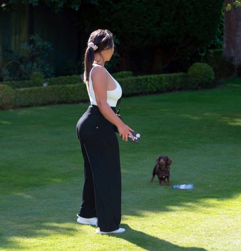 Lauren Goodger se ve en su parque local en Essex, 20/05/2020. La estrella de TOWIE aparece con una camiseta blanca sin mangas y pantalones negros mientras juega con un perro salchicha.