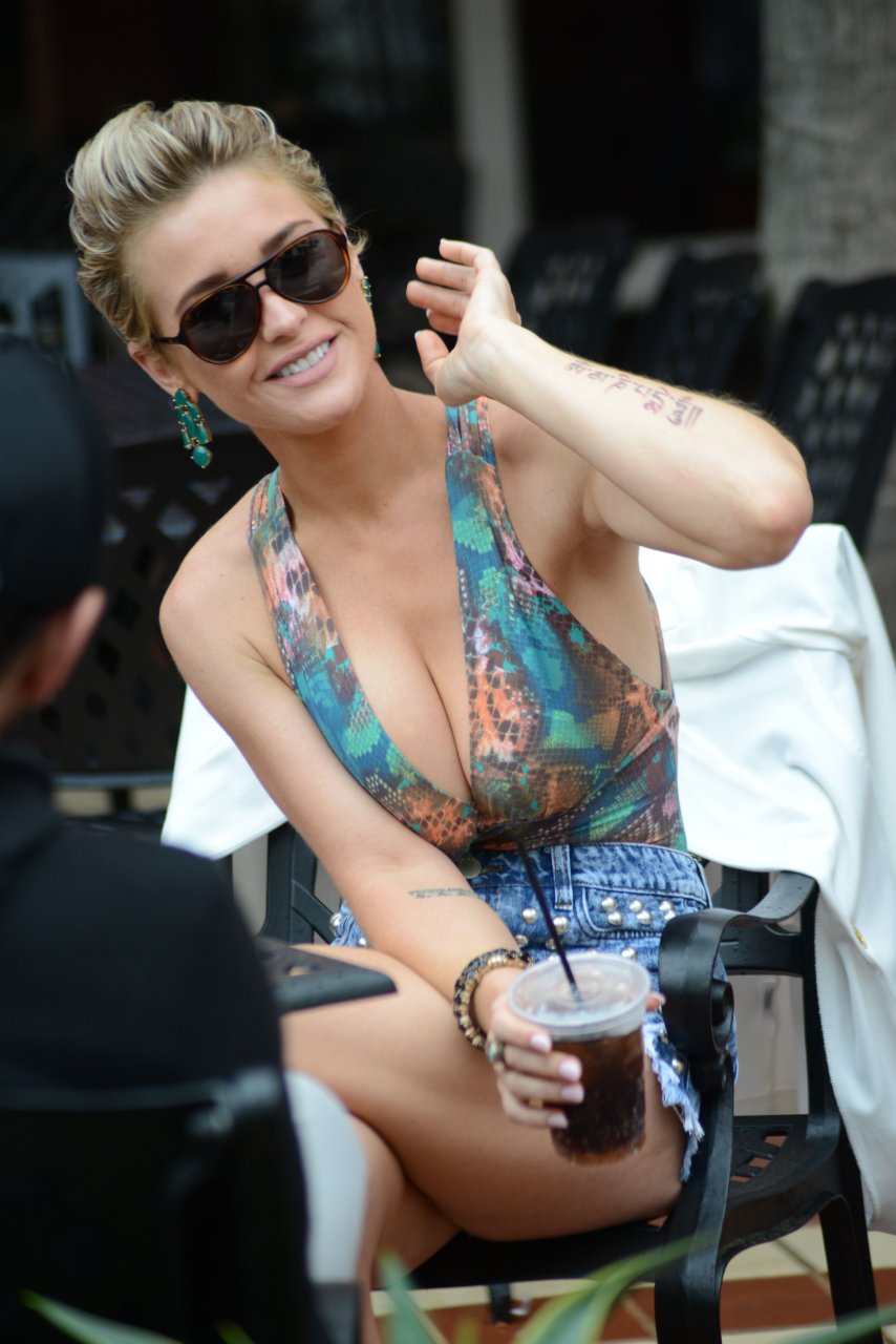 Modelo de Home Shopping Network Lauren Hubbard es vista de compras en Miami, 12/02/2018. La doble de Sharon Stone estaba acompañada por su pareja/novio. Luciendo impresionante con un par de shorts cortos y una blusa escotada que apenas contiene sus pechos naturales.