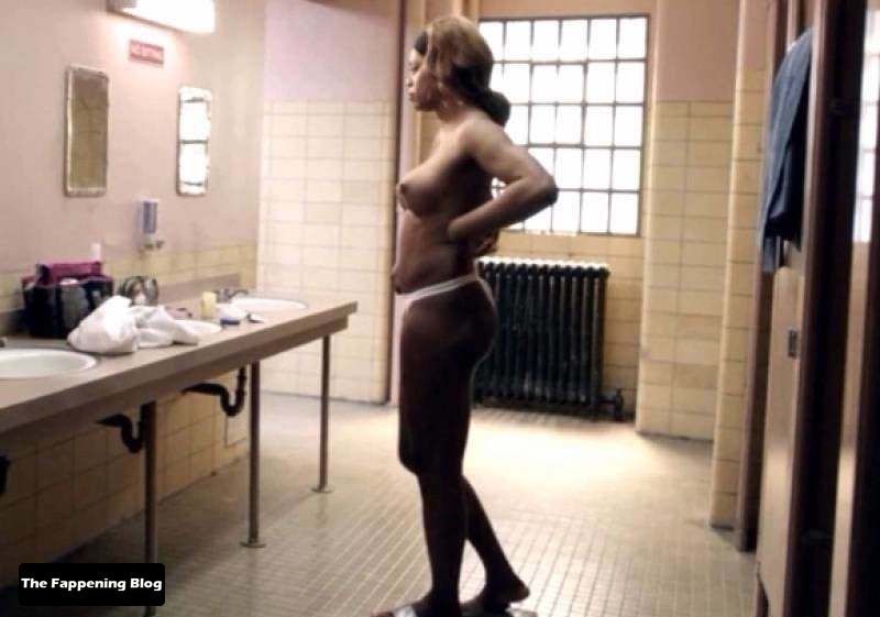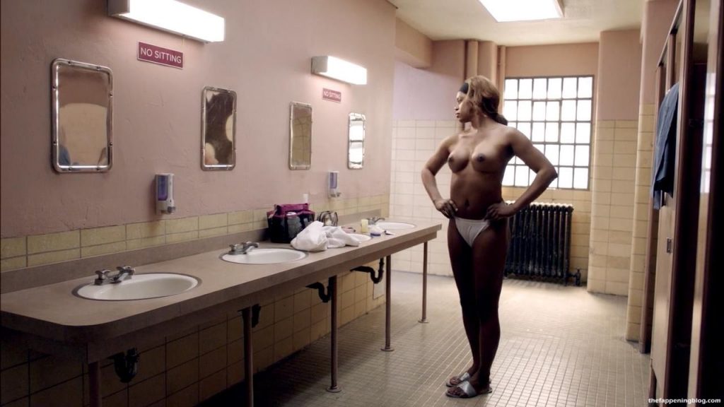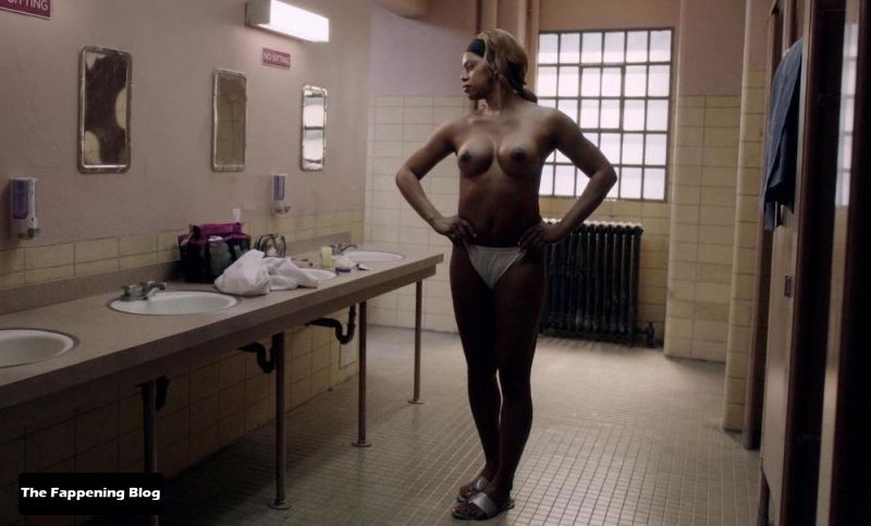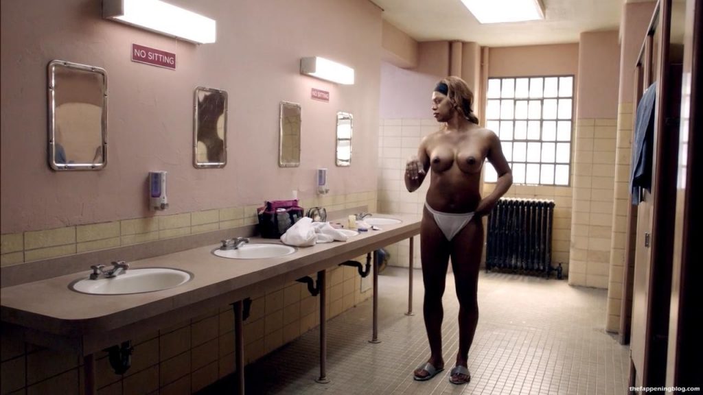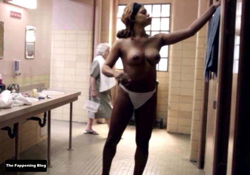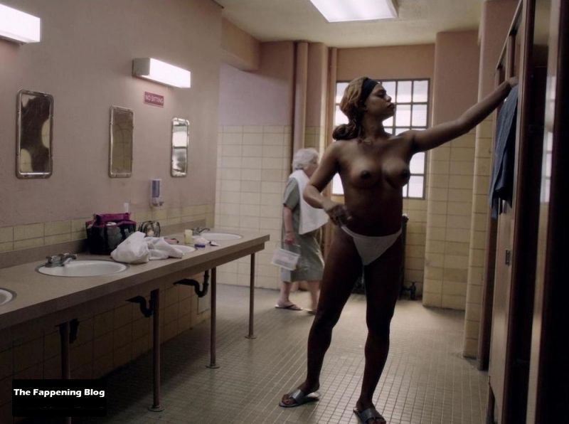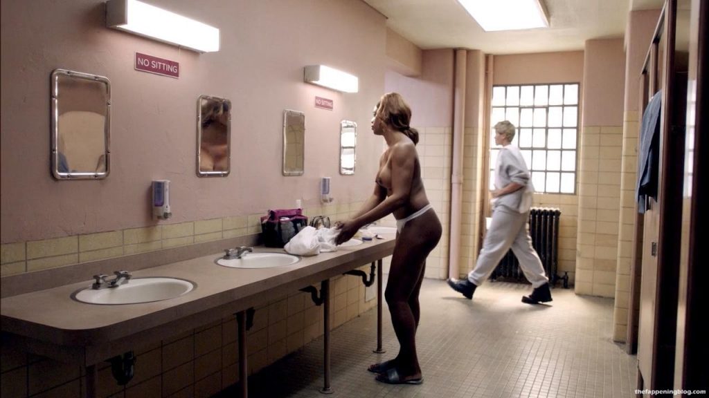Laverne Cox is seen topless in a prison bathroom, wearing white thong panties as she looks at her reflection in a mirror and turns from side to side.