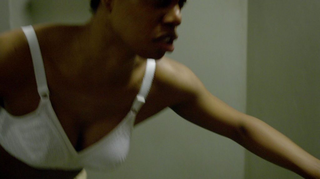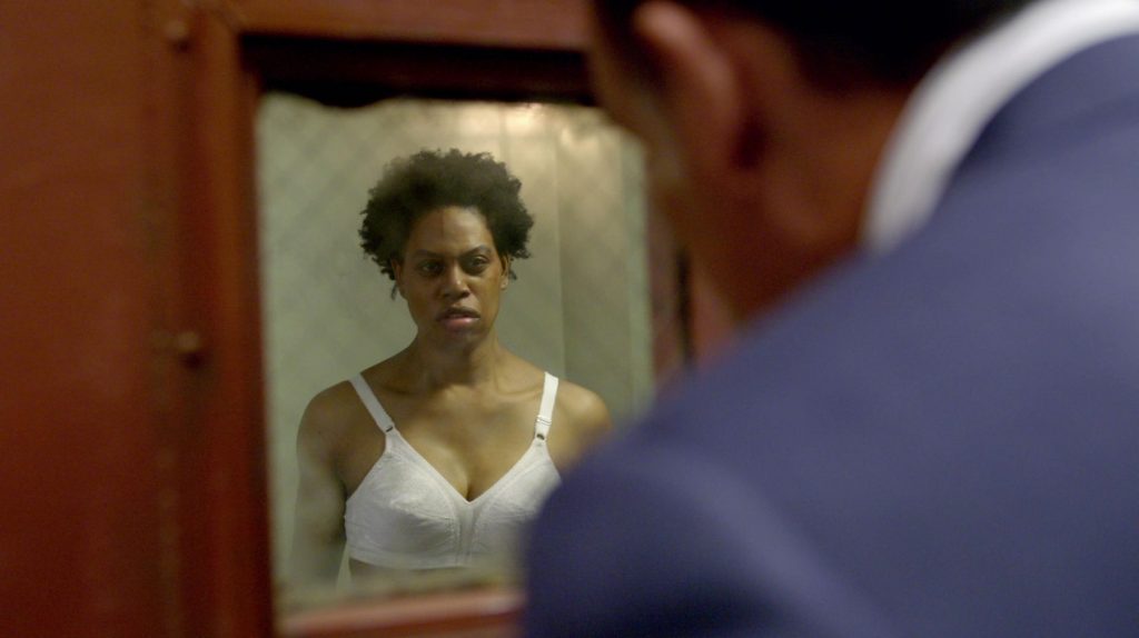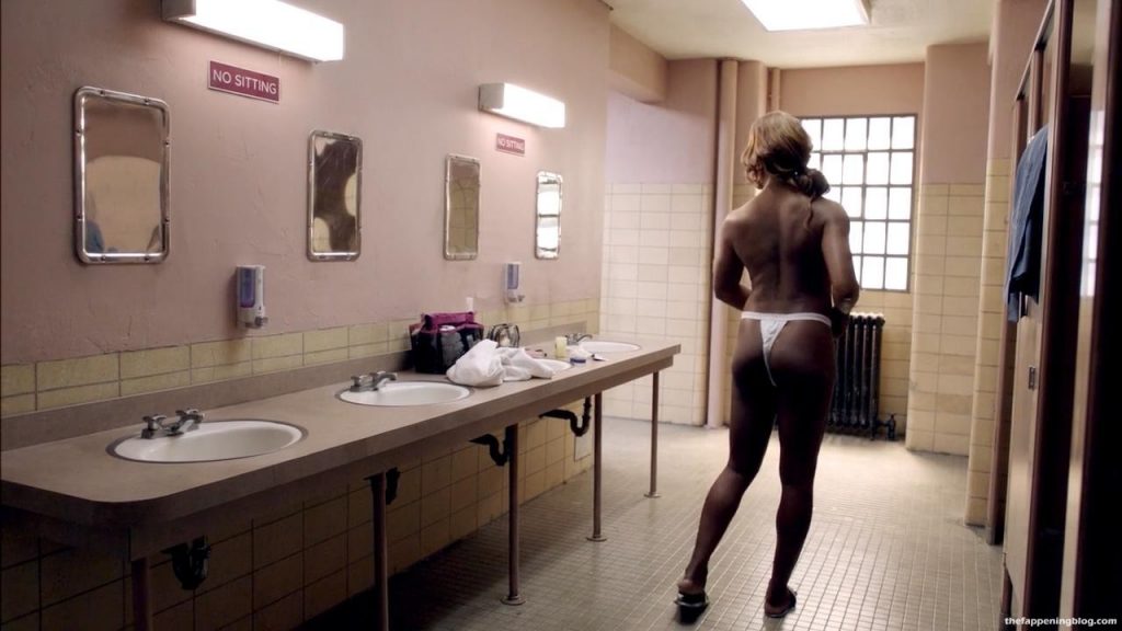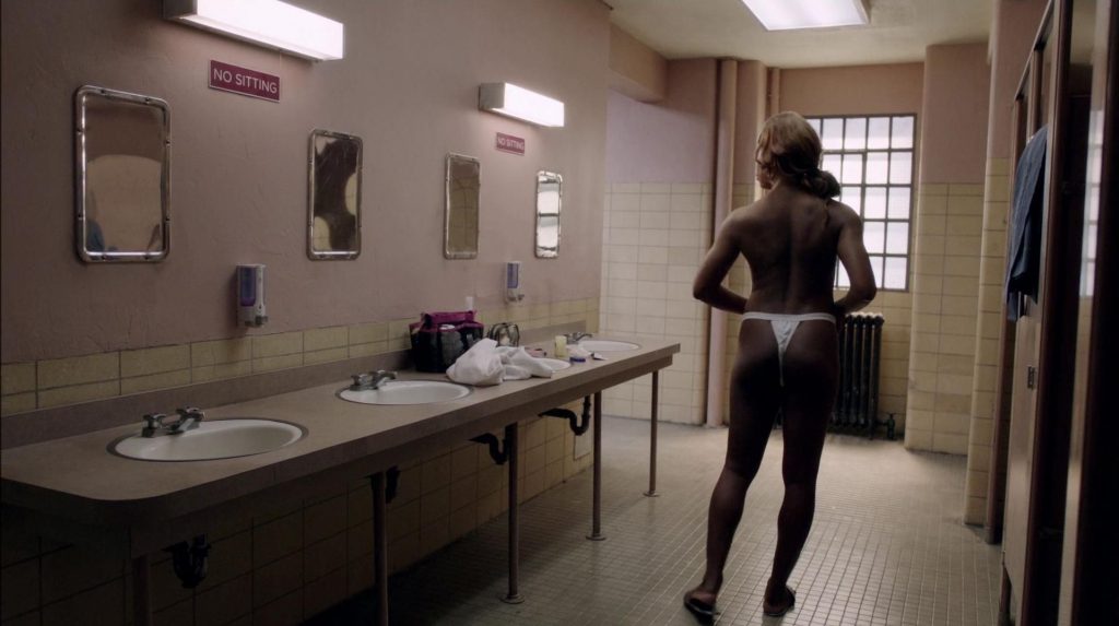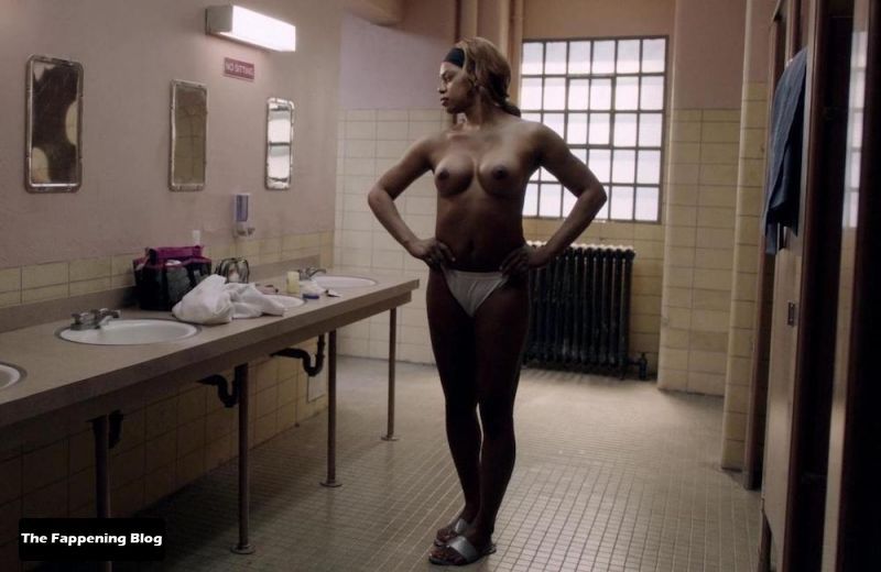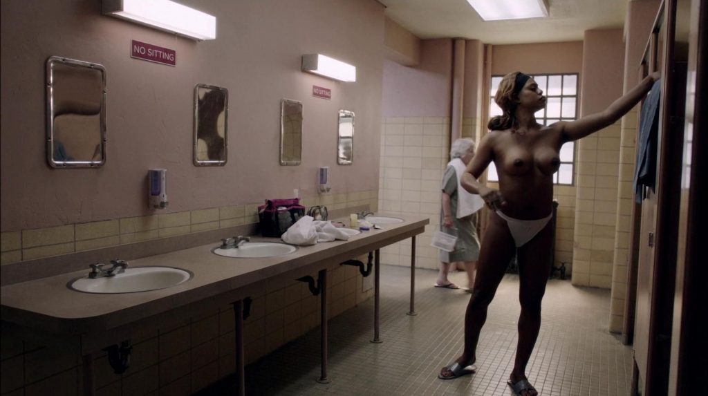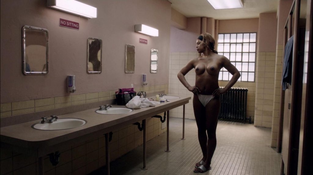 Laverne Cox is seen topless in a prison bathroom, wearing white thong panties as she looks at her reflection in a mirror and turns from side to side.