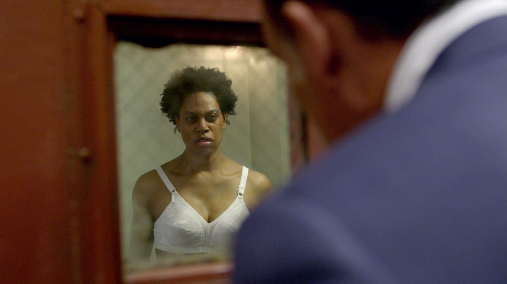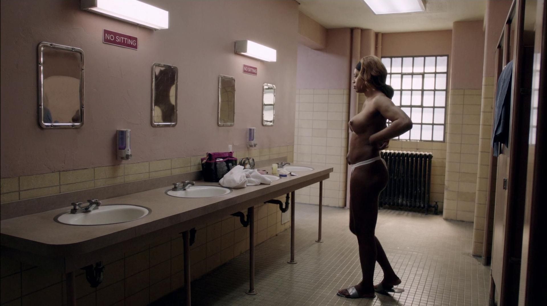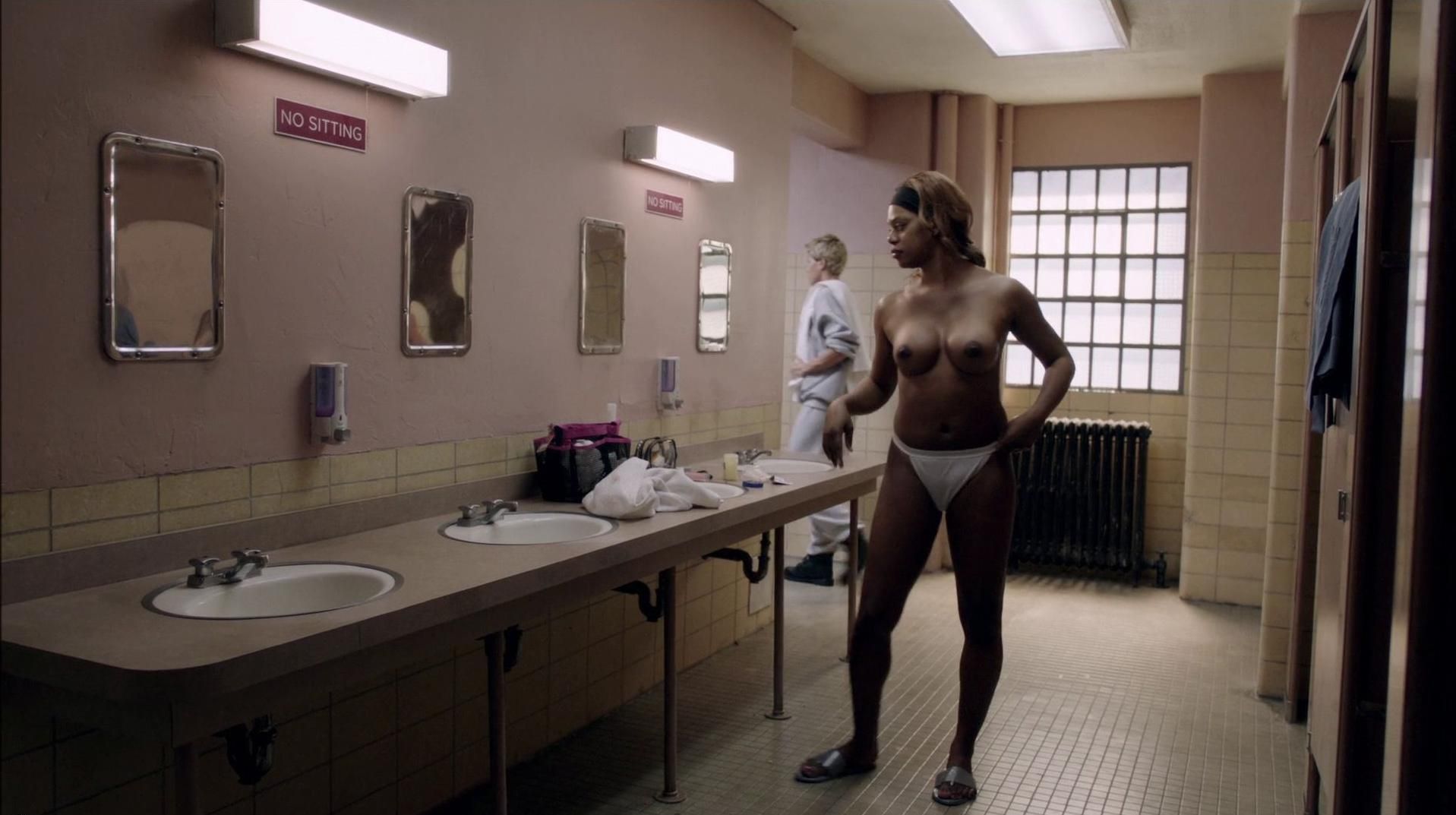 Laverne Cox is seen topless in a prison bathroom, wearing white thong panties as she looks at her reflection in a mirror and turns from side to side.