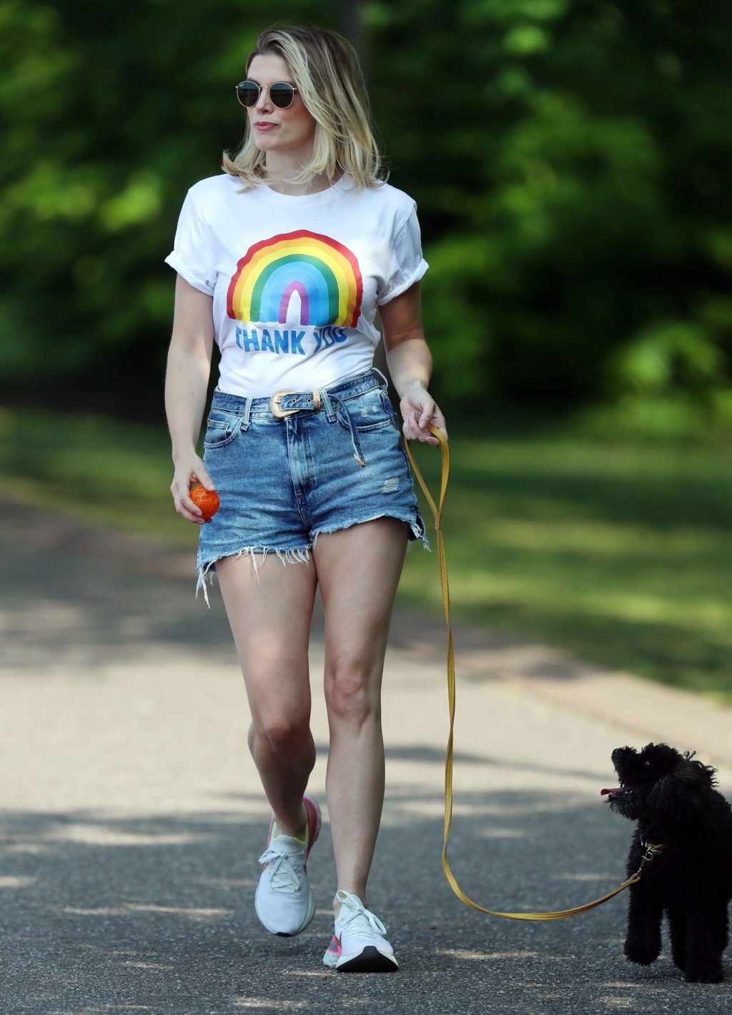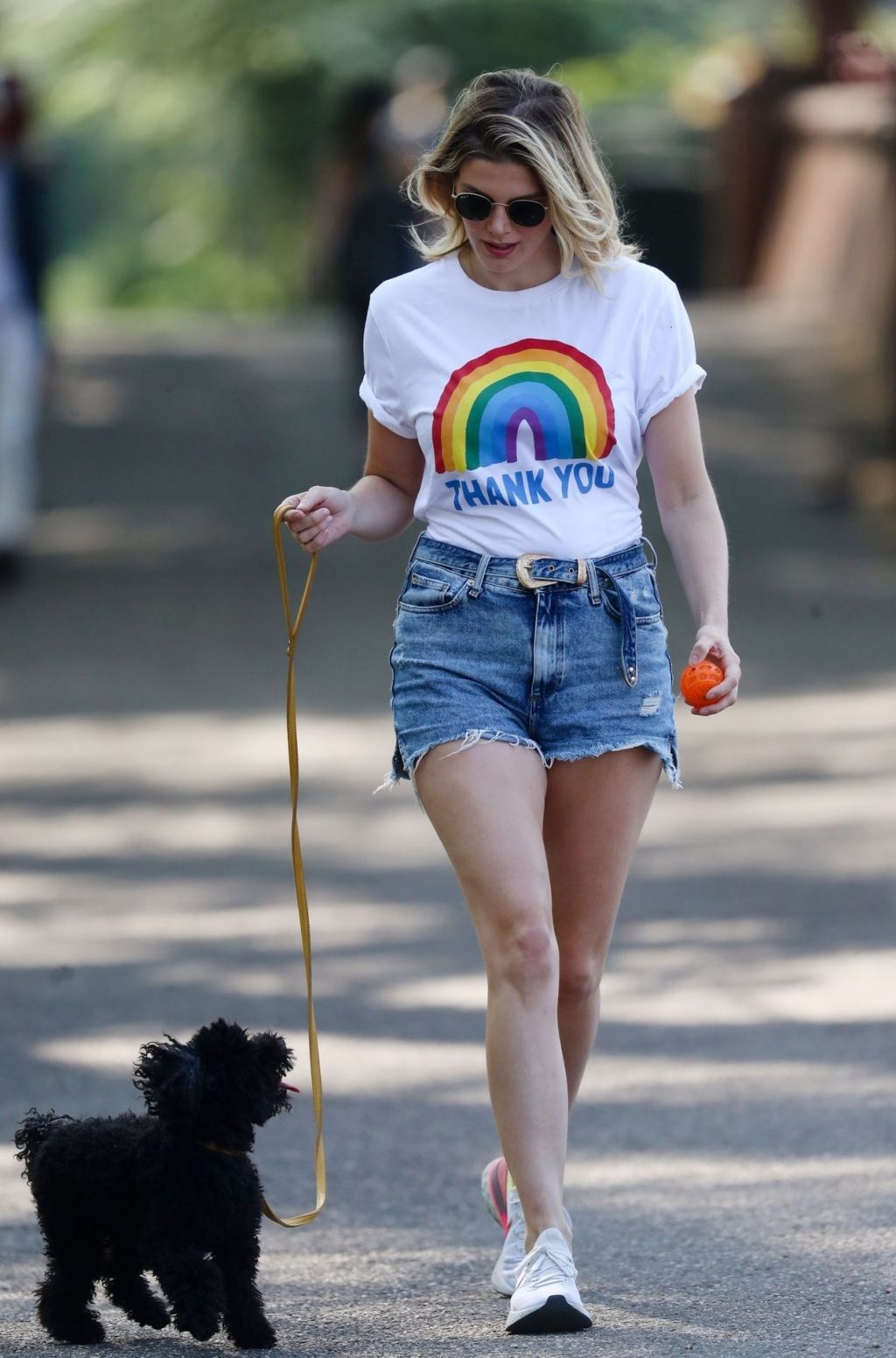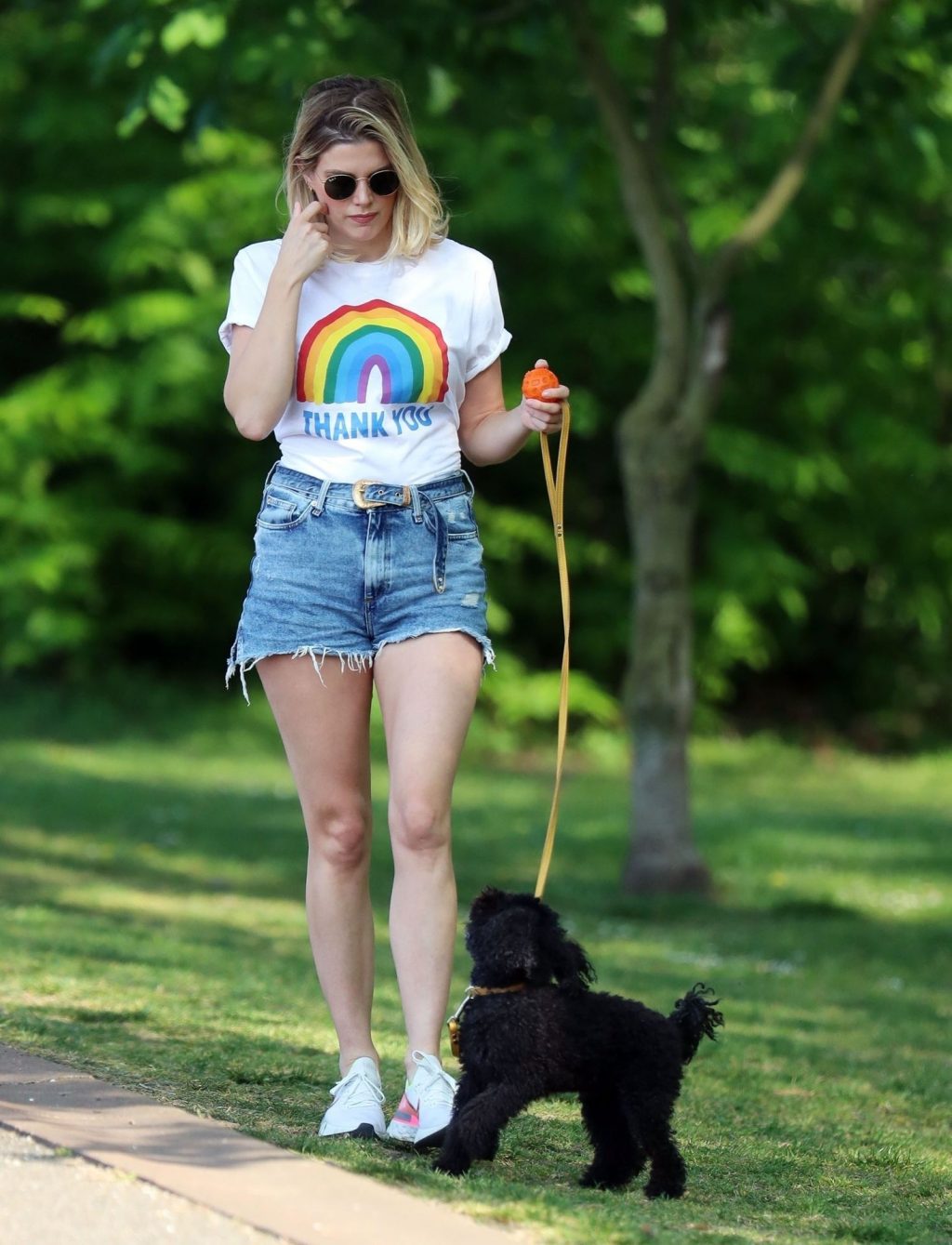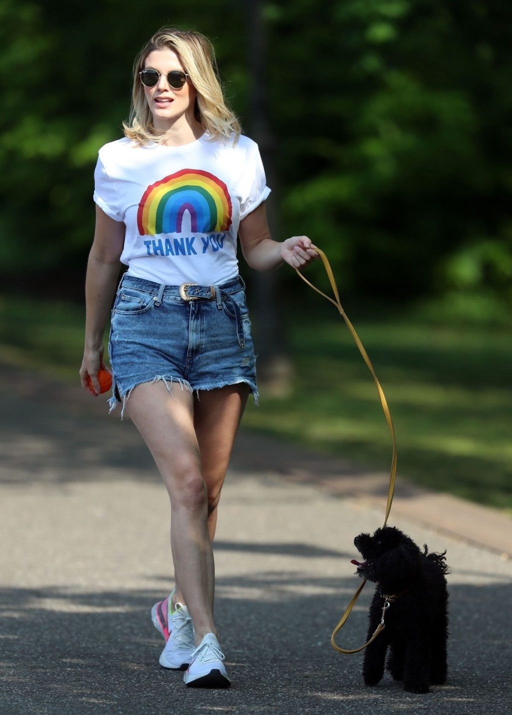 La presentadora de televisión y DJ Ashley James fue fotografiada luciendo genial con los shorts de mezclilla estilo ‘Daisy Duke’ mientras apoyaba al NHS con una camiseta, disfrutando de un paseo con su perro en un parque local de Londres, 24/04/2020.