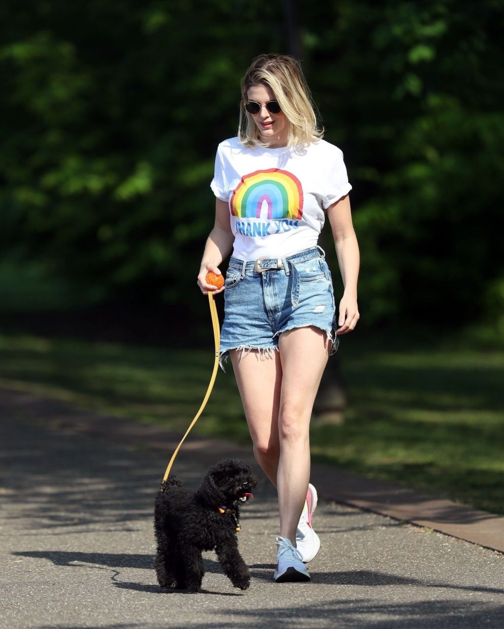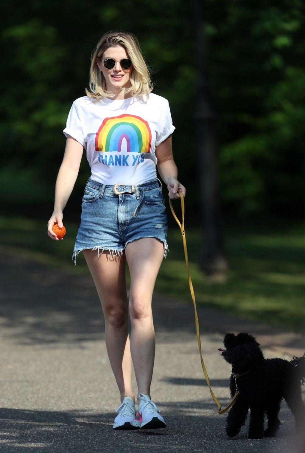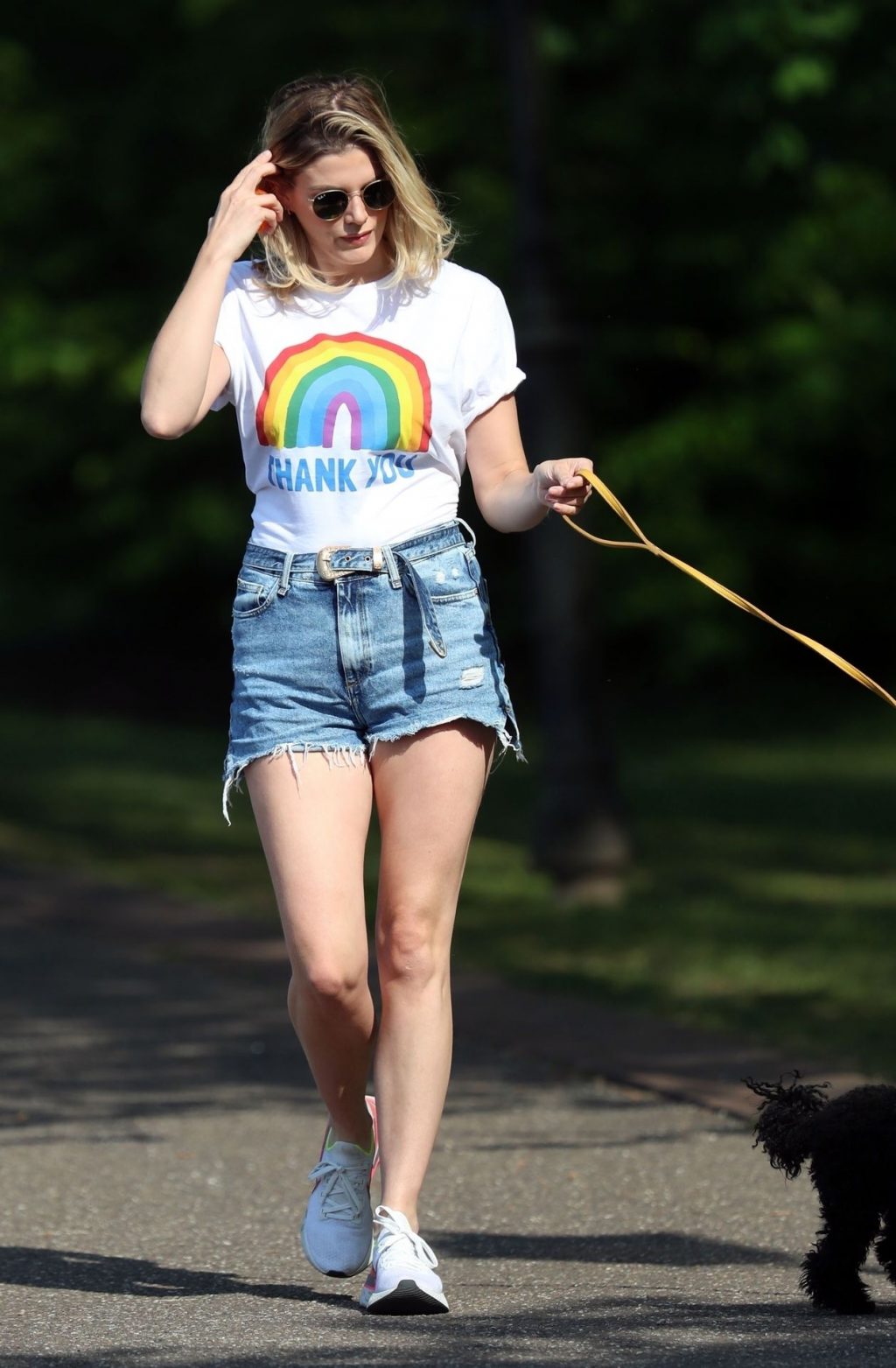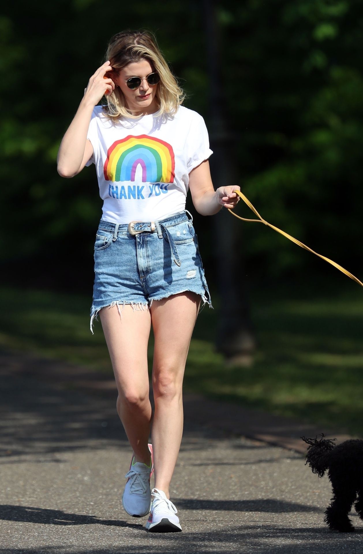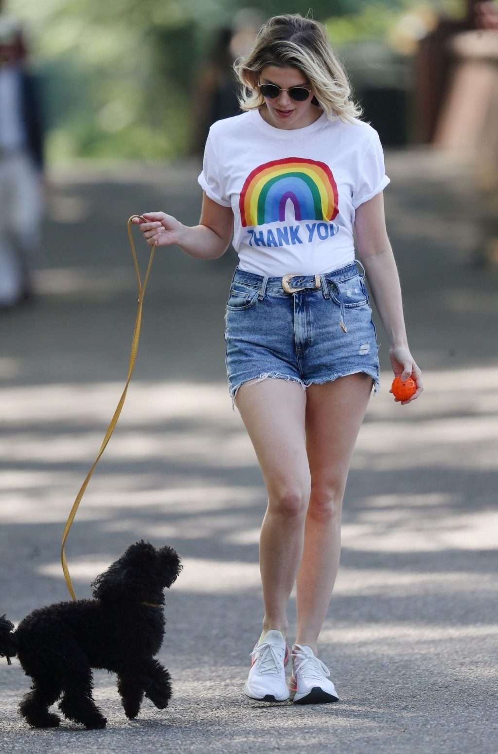 La presentadora de televisión y DJ Ashley James fue fotografiada luciendo genial con los shorts de mezclilla estilo ‘Daisy Duke’ mientras apoyaba al NHS con una camiseta, disfrutando de un paseo con su perro en un parque local de Londres, 24/04/2020.
