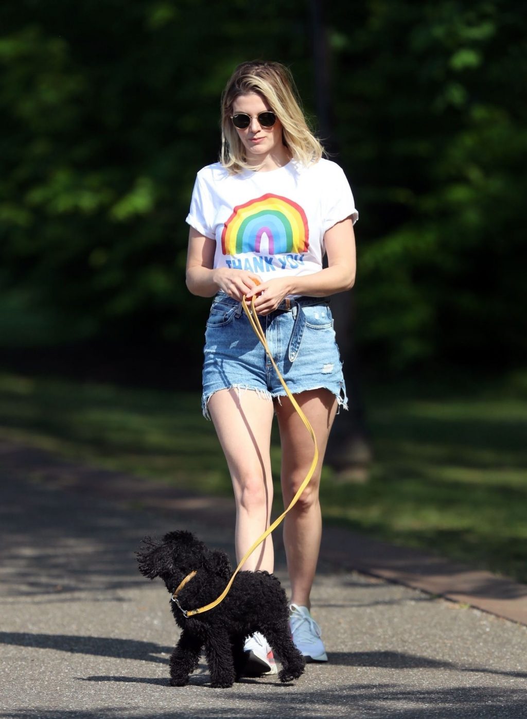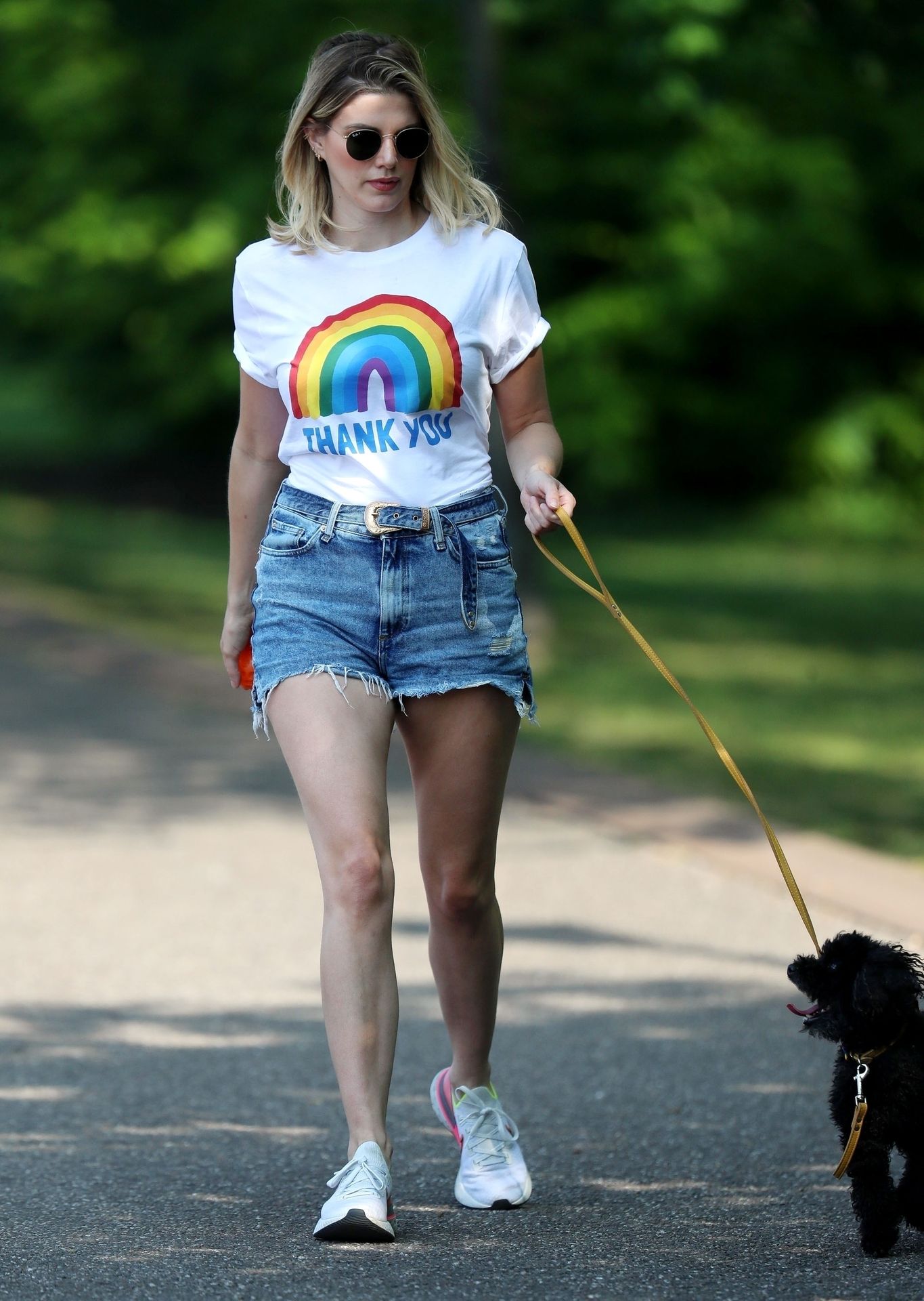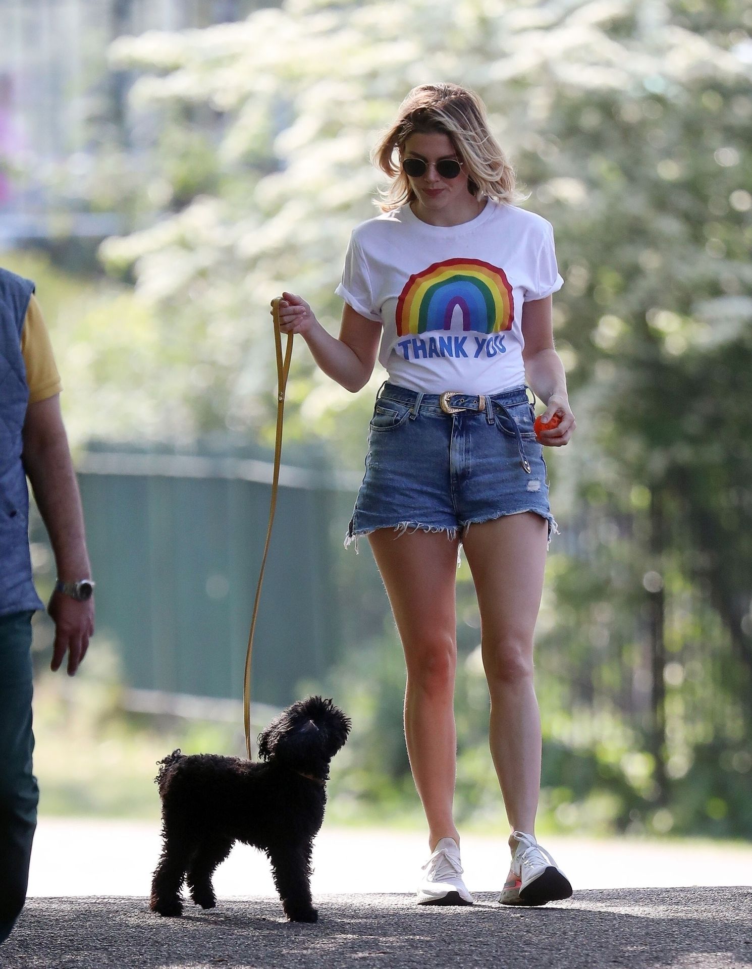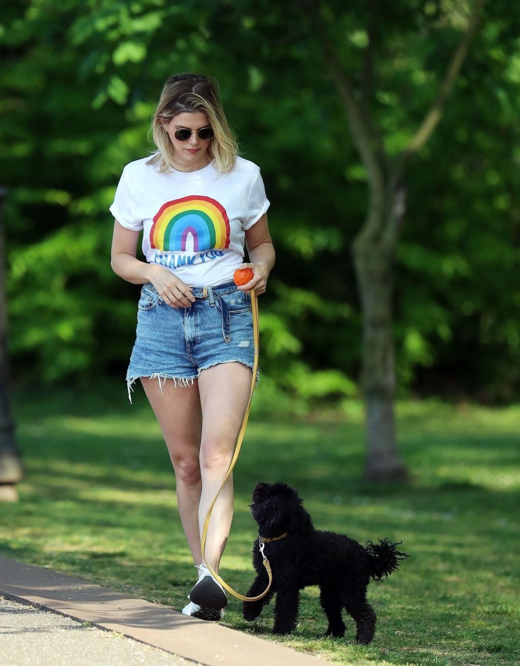La presentadora de televisión y DJ Ashley James fue fotografiada luciendo genial con los shorts de mezclilla estilo ‘Daisy Duke’ mientras apoyaba al NHS con una camiseta, disfrutando de un paseo con su perro en un parque local de Londres, 24/04/2020.