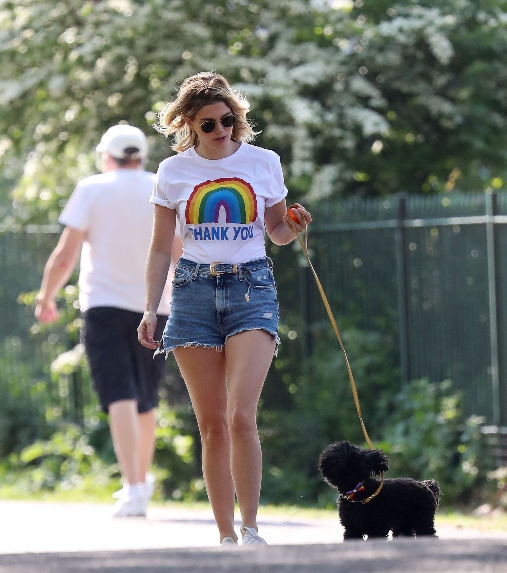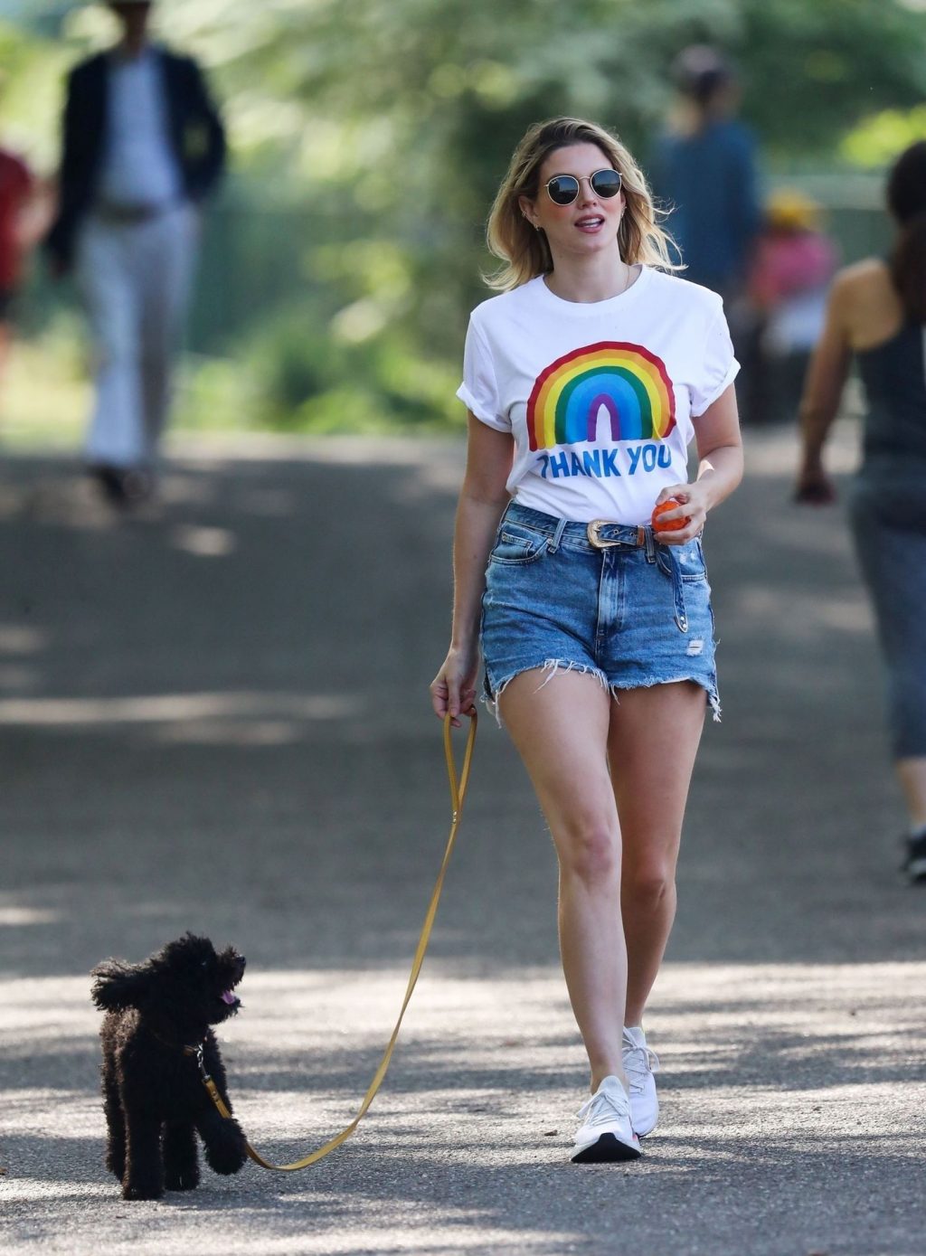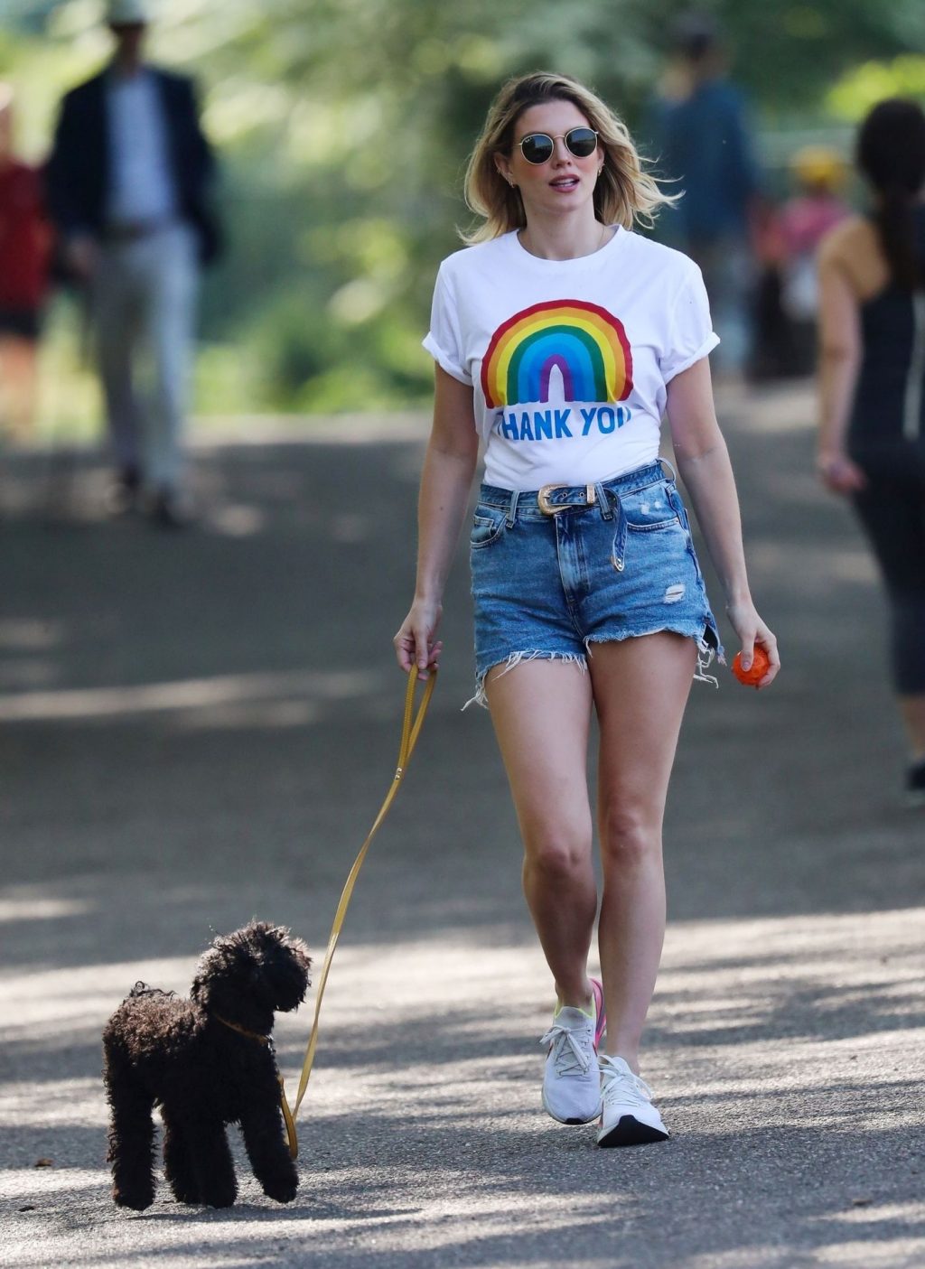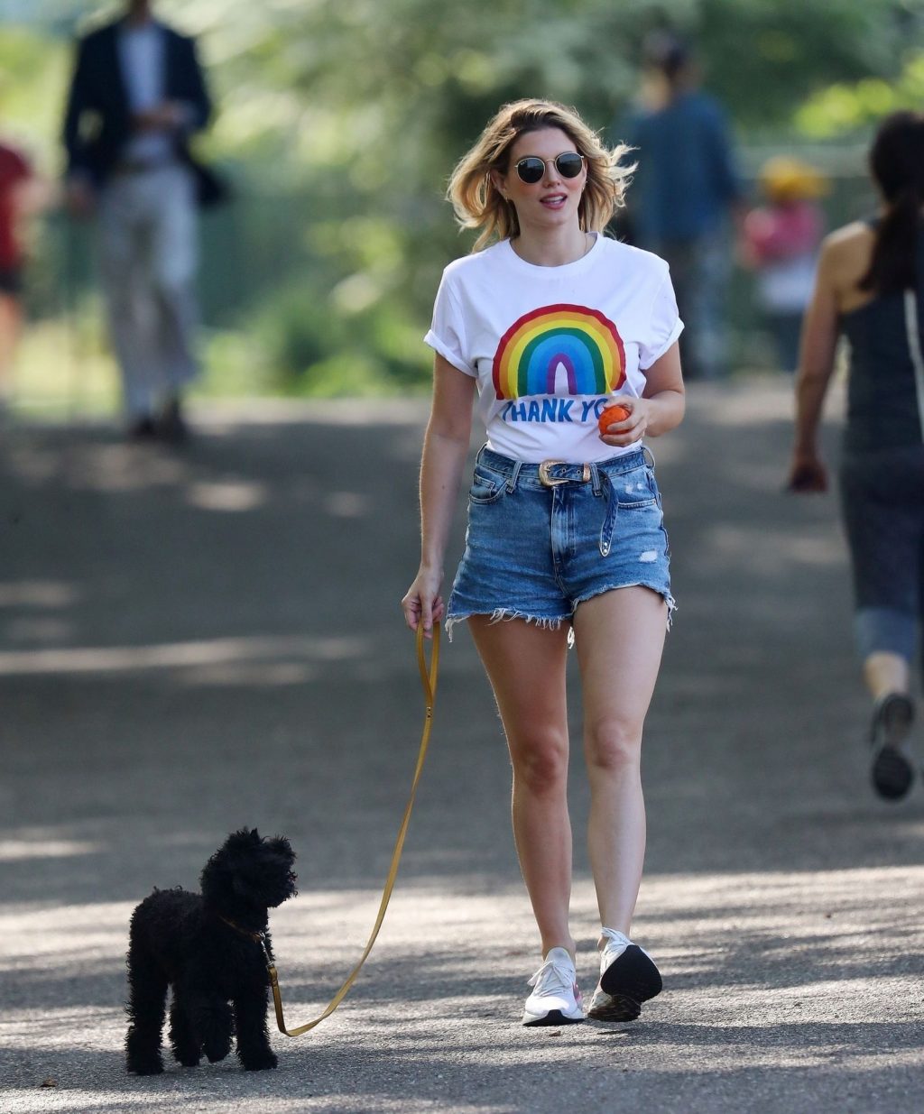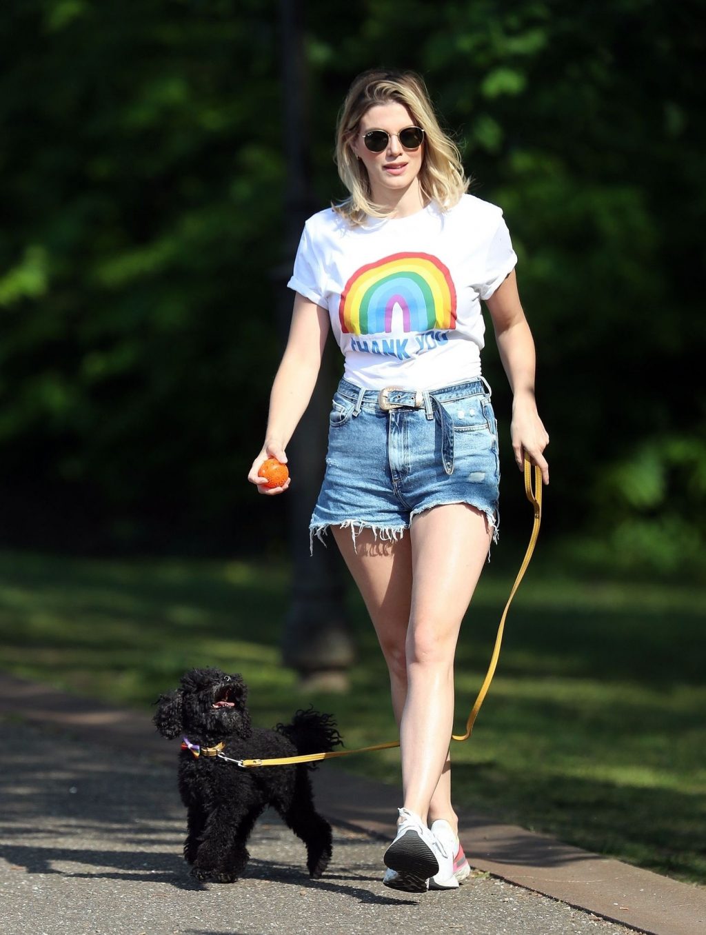 La presentadora de televisión y DJ Ashley James fue fotografiada luciendo genial con los shorts de mezclilla estilo ‘Daisy Duke’ mientras apoyaba al NHS con una camiseta, disfrutando de un paseo con su perro en un parque local de Londres, 24/04/2020.