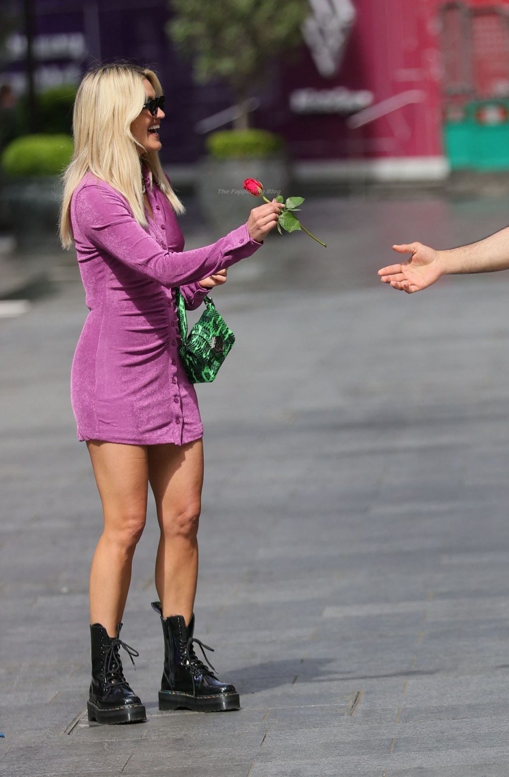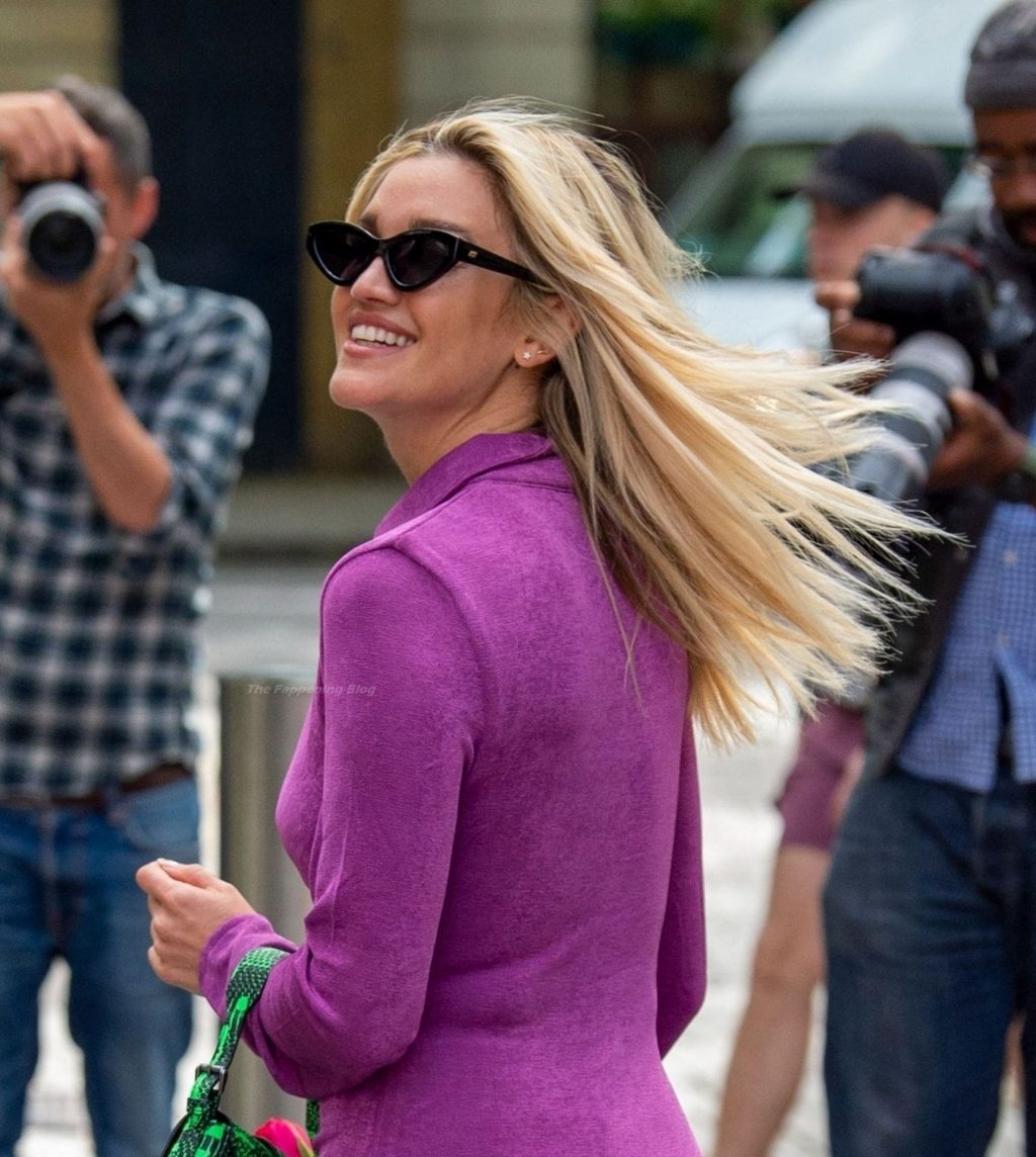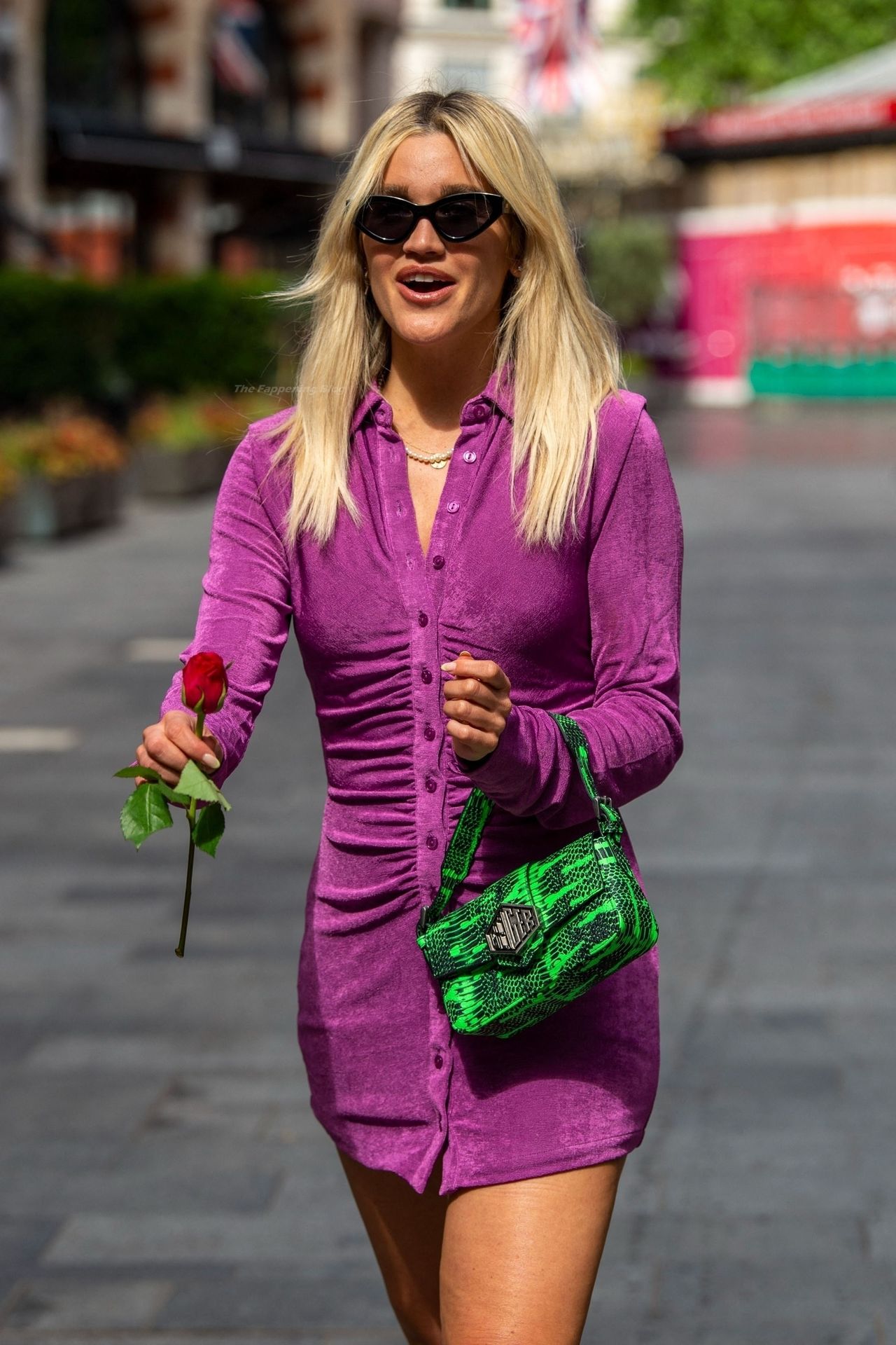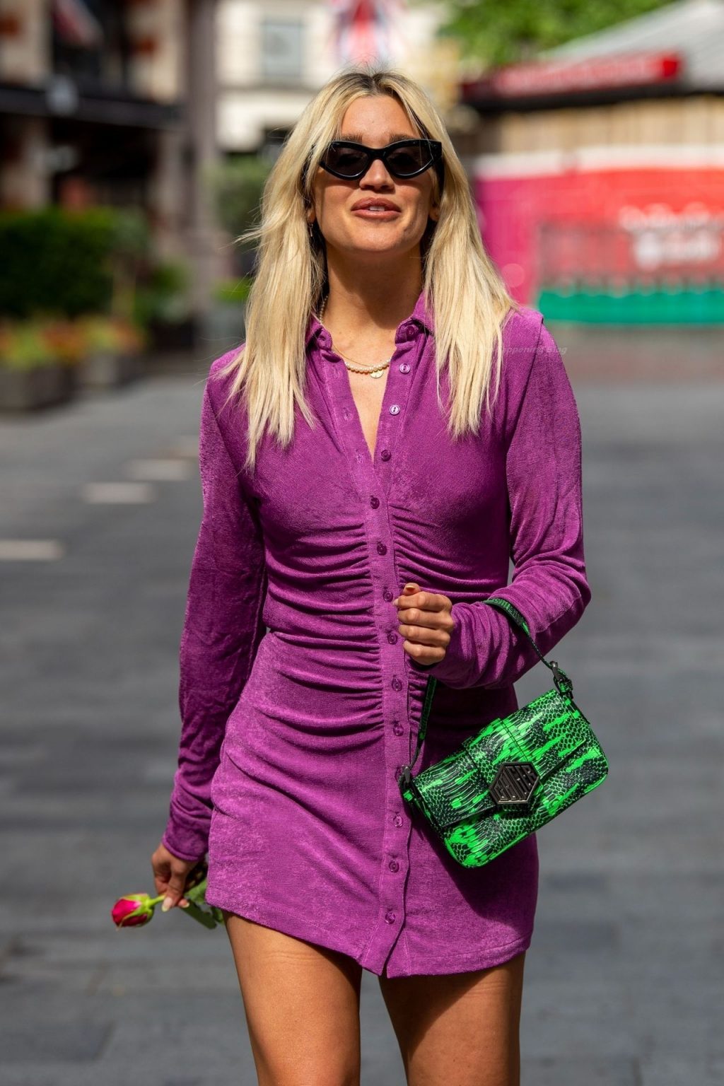 La presentadora de radio y ex Pussycat Doll Ashley Roberts aparece con un precioso mini vestido morado, botas Dr. Martens y un bolso de patrón de serpiente verde brillante mientras se dirige a los estudios de Heart Radio en Londres, 07/06/2021.