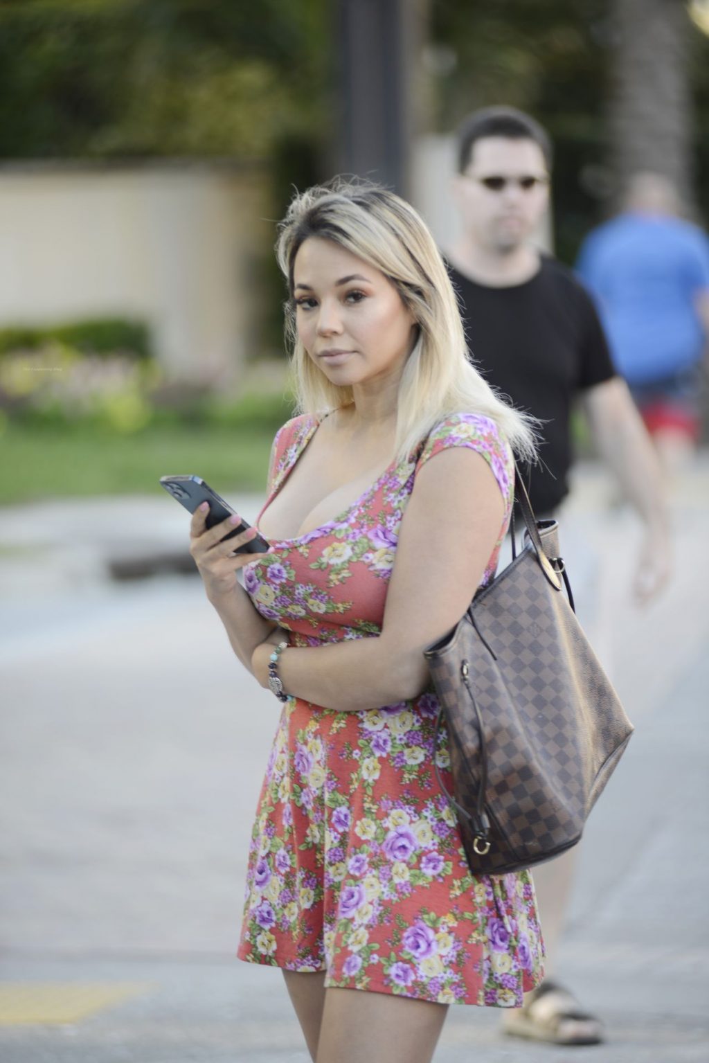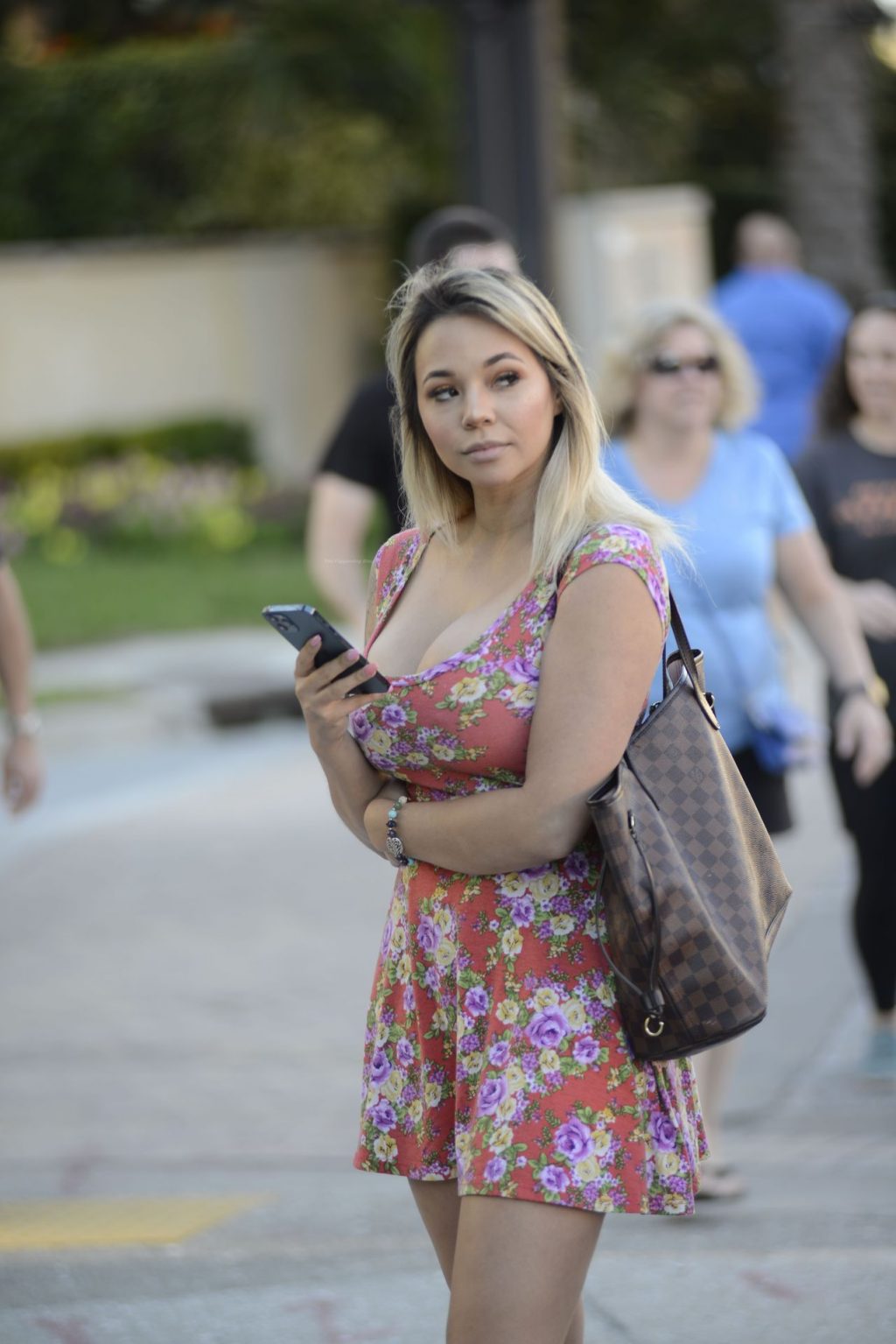 Bombshell con busto y piernas largas paseando por un día en Miami, 01/04/2021.