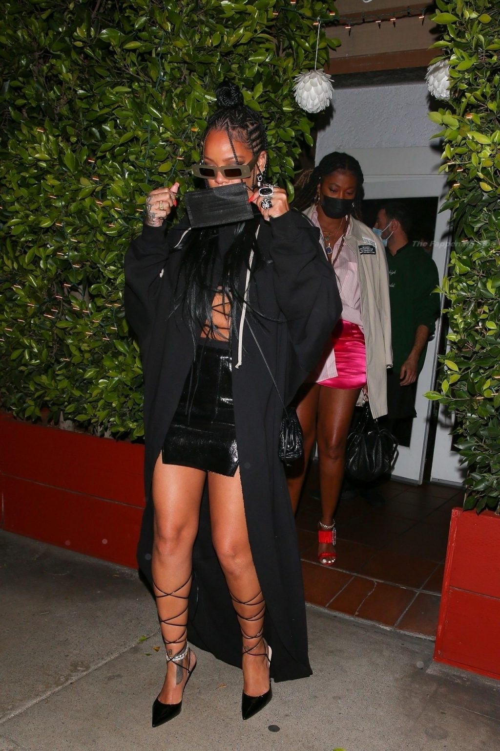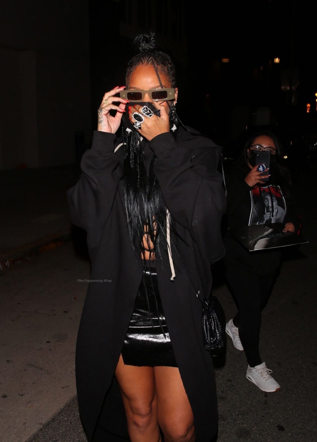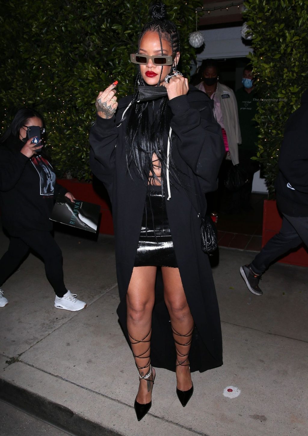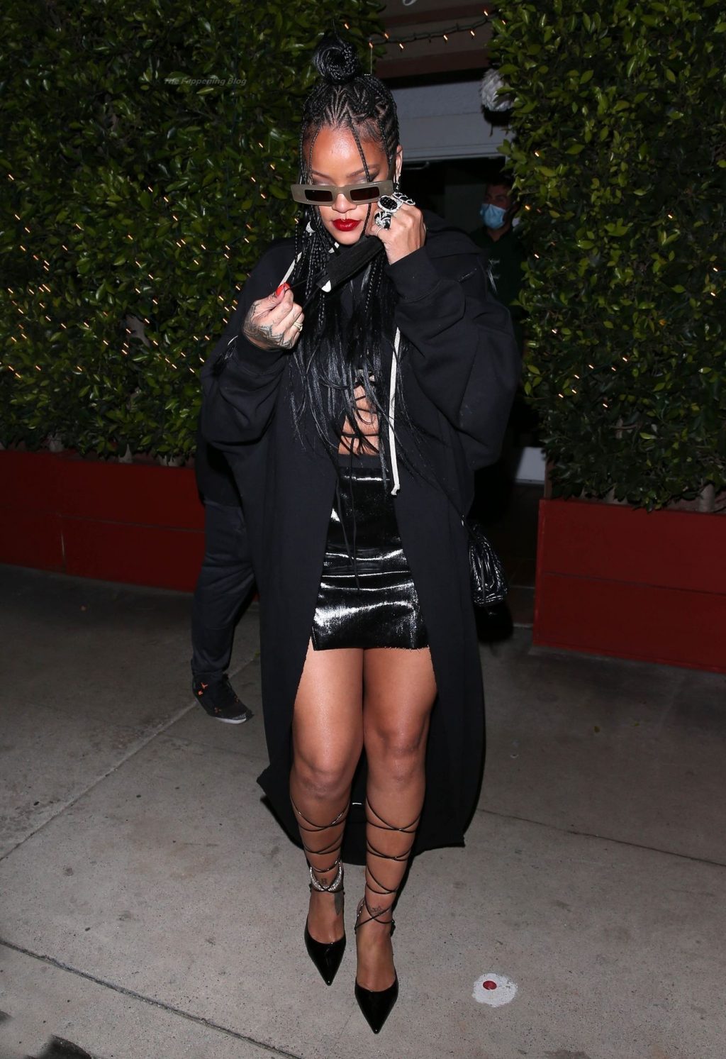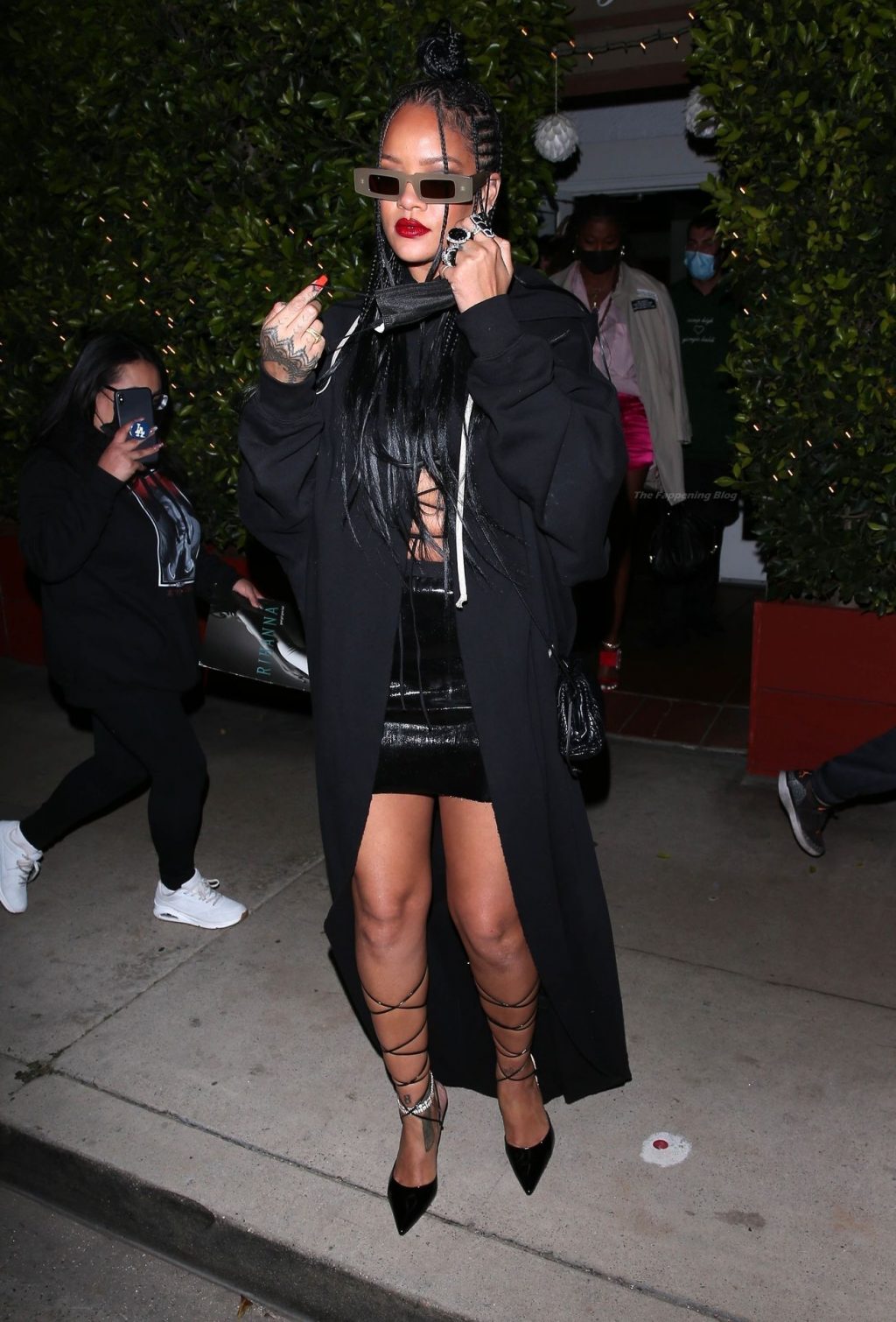 La estrella barbadense del Fappening llamó la atención al lucir sus largas piernas con una minifalda corta, un top revelador y un largo abrigo negro.