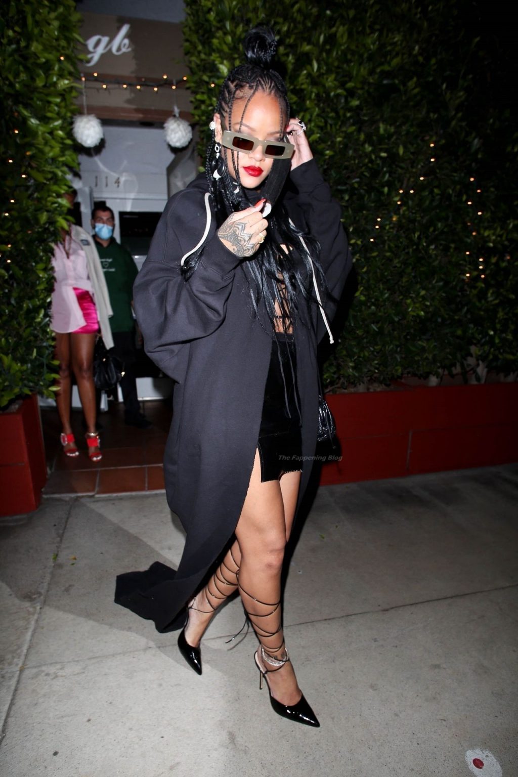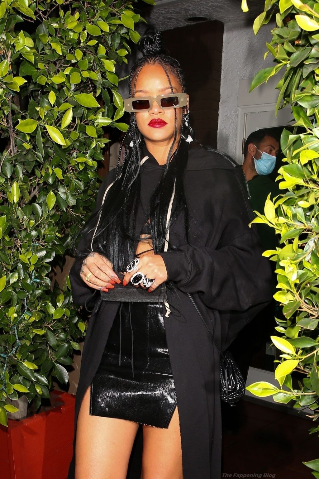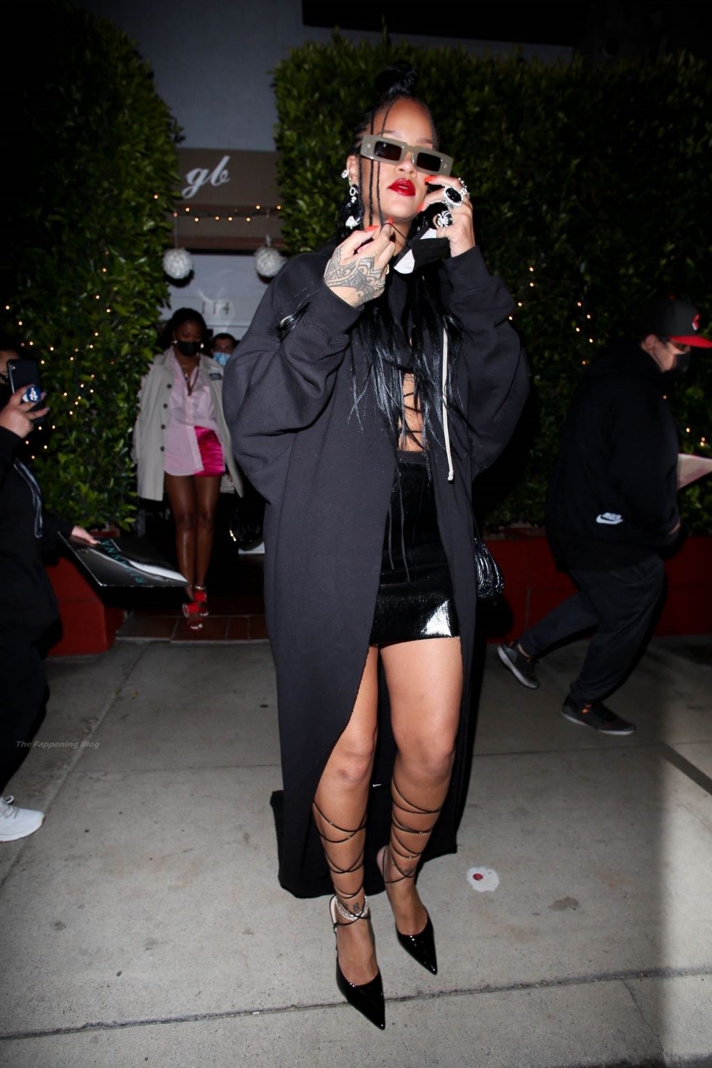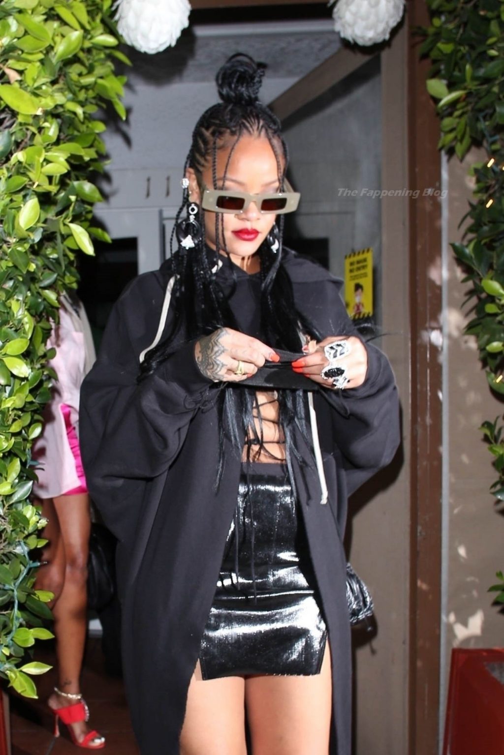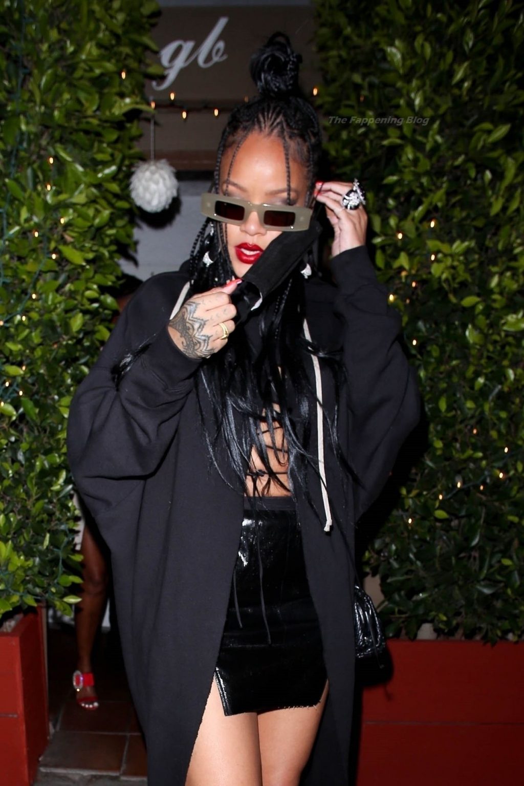 La estrella barbadense del Fappening llamó la atención al lucir sus largas piernas con una minifalda corta, un top revelador y un largo abrigo negro.