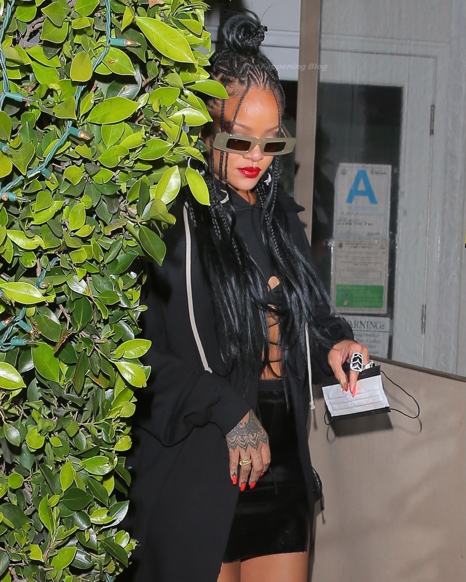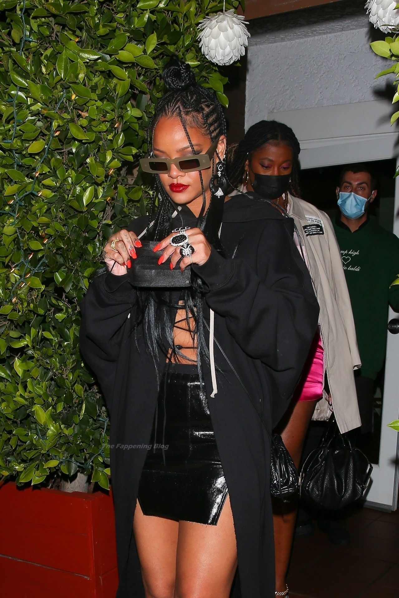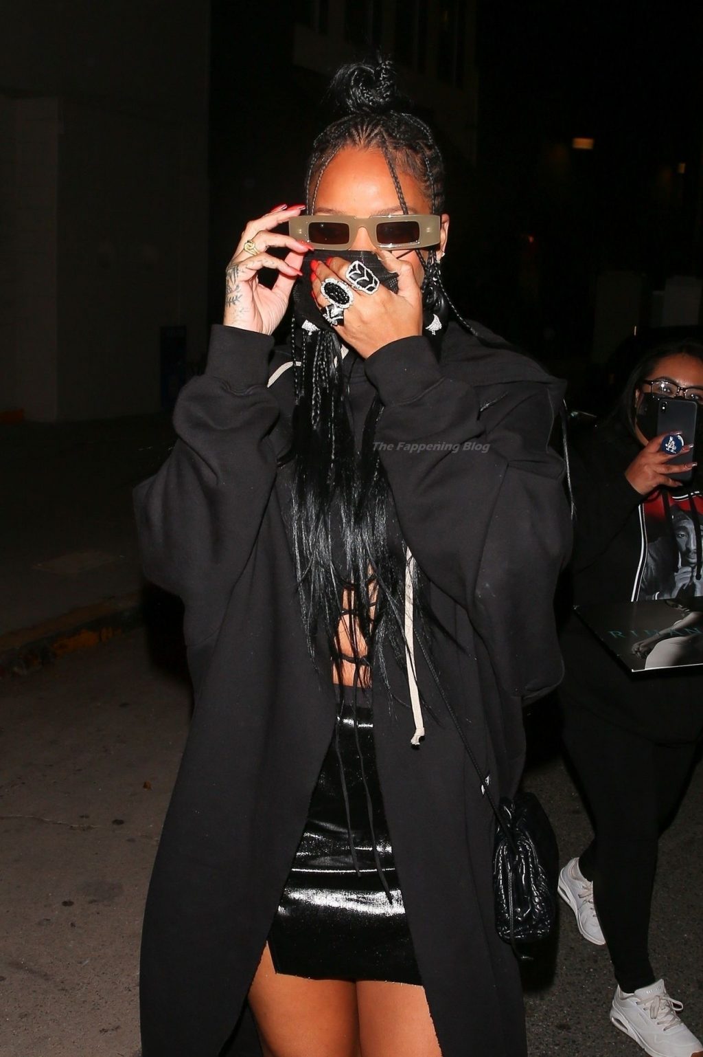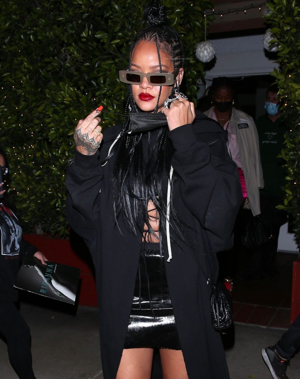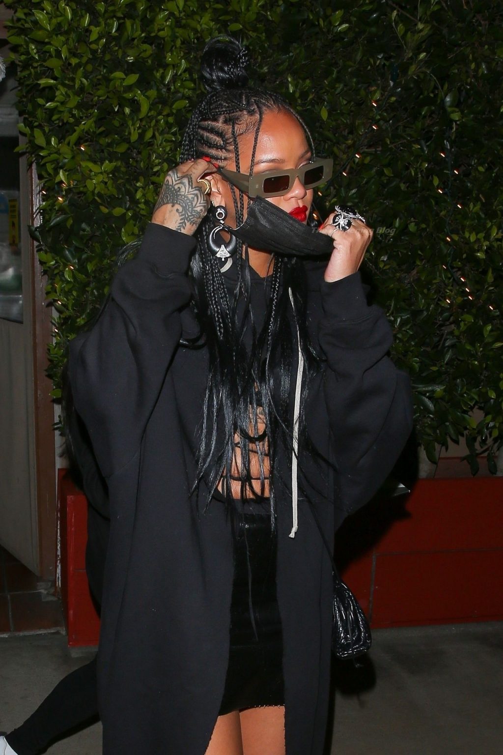 La estrella barbadense del Fappening llamó la atención al lucir sus largas piernas con una minifalda corta, un top revelador y un largo abrigo negro.