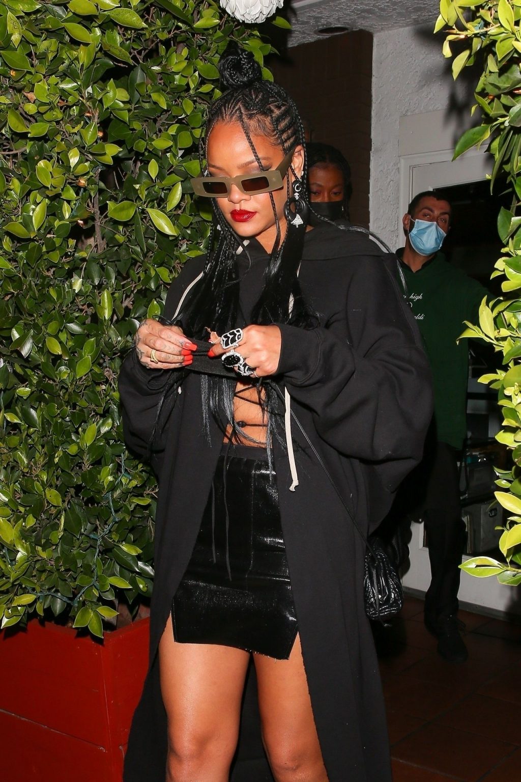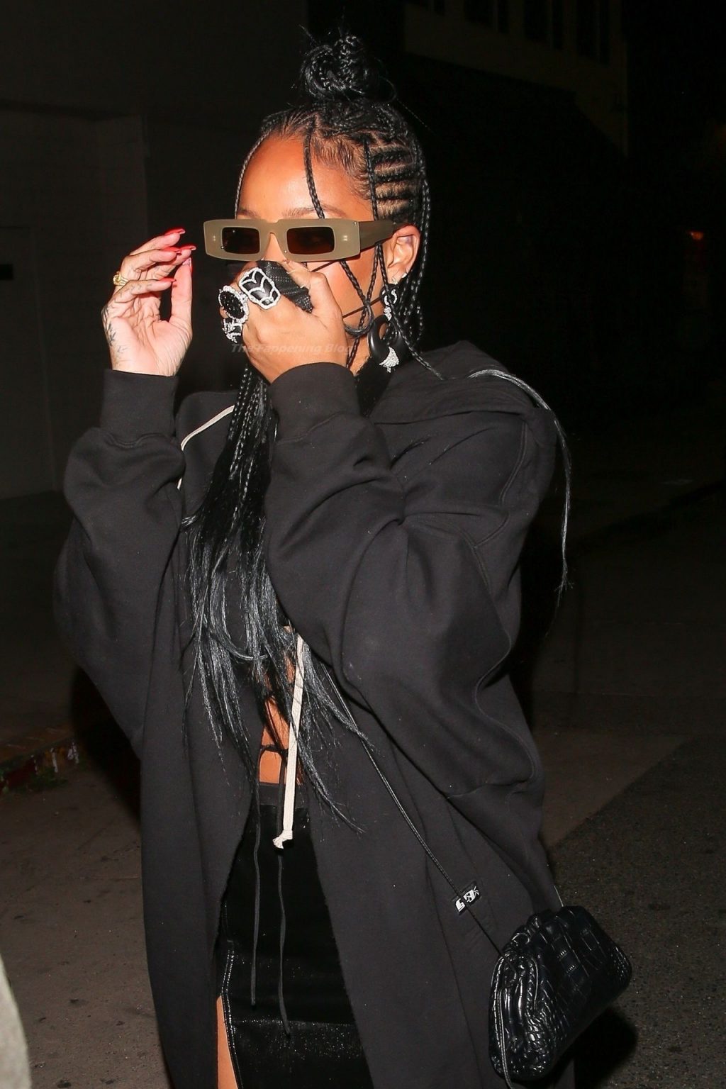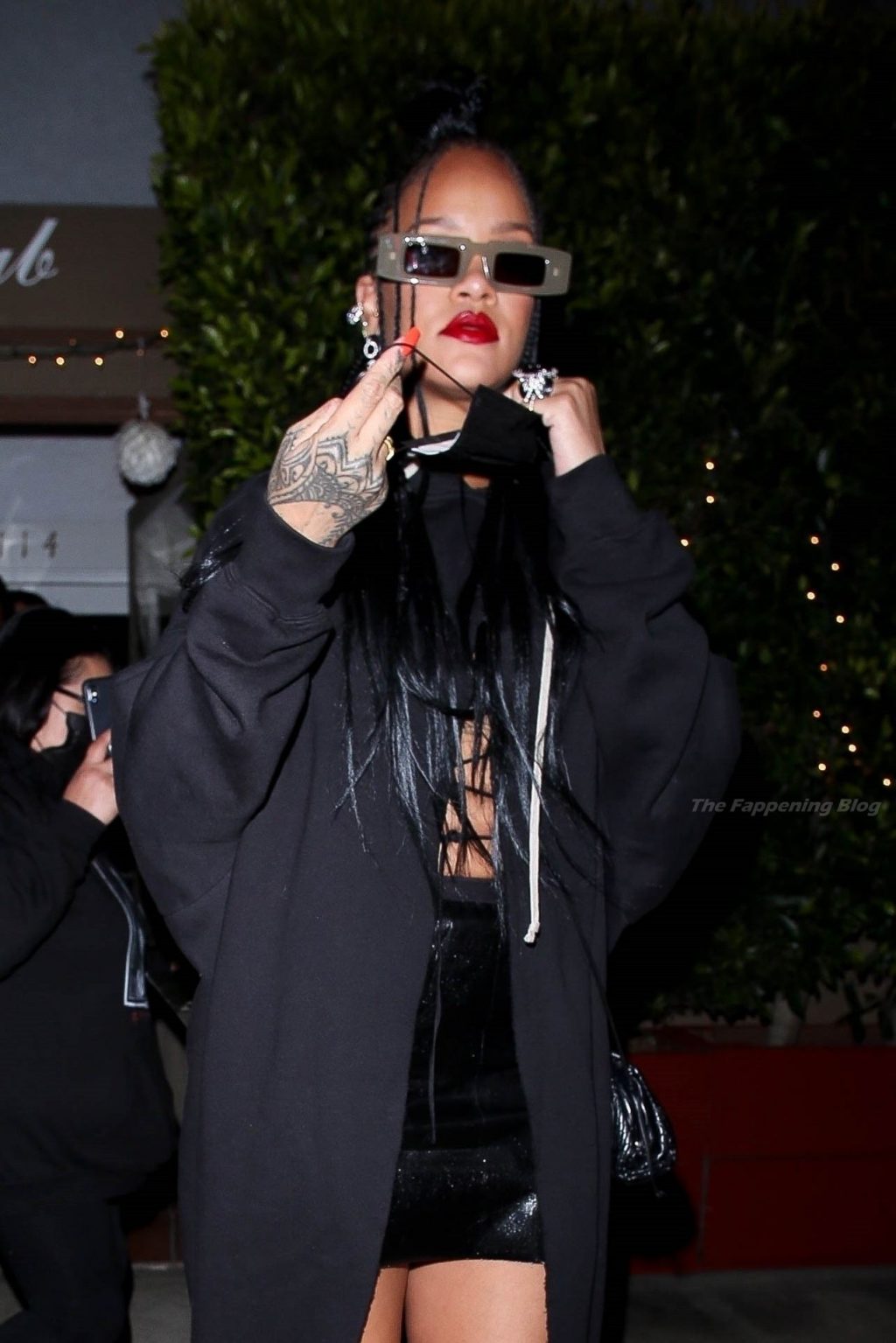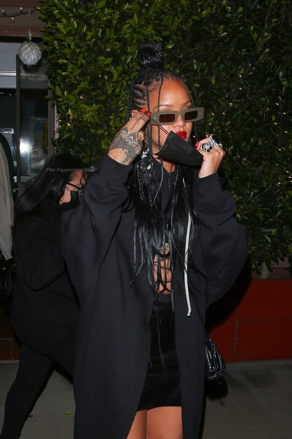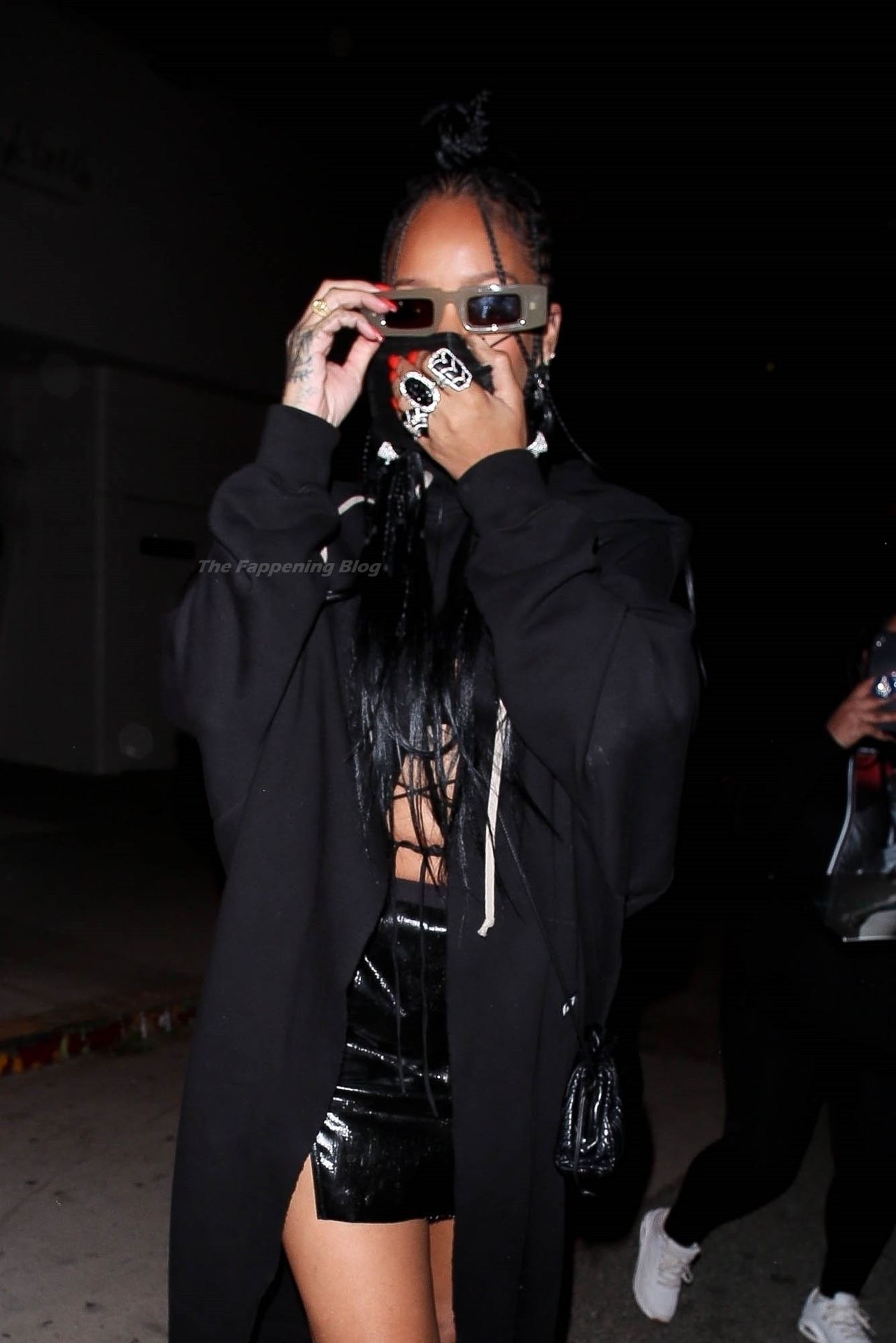 La estrella barbadense del Fappening llamó la atención al lucir sus largas piernas con una minifalda corta, un top revelador y un largo abrigo negro.