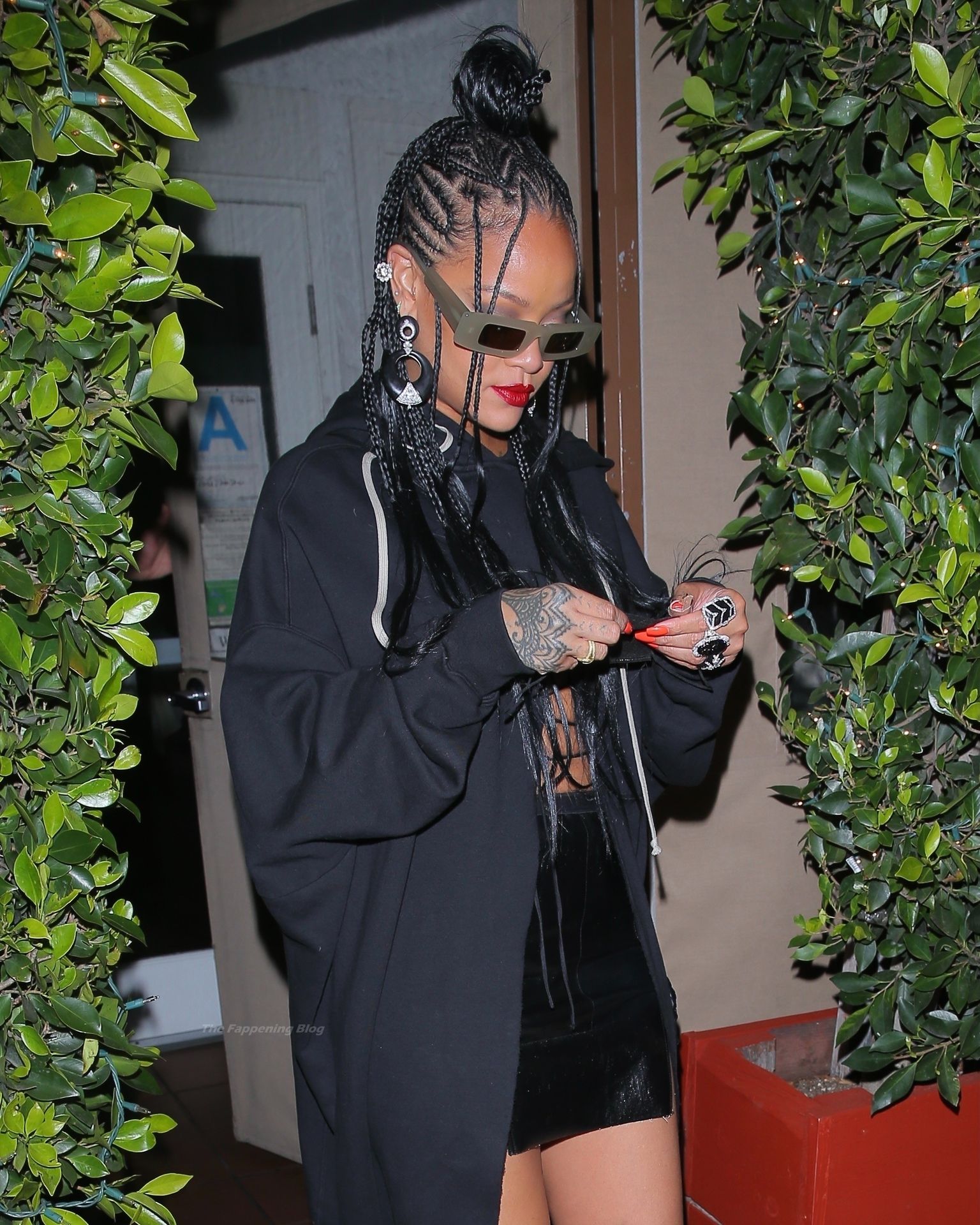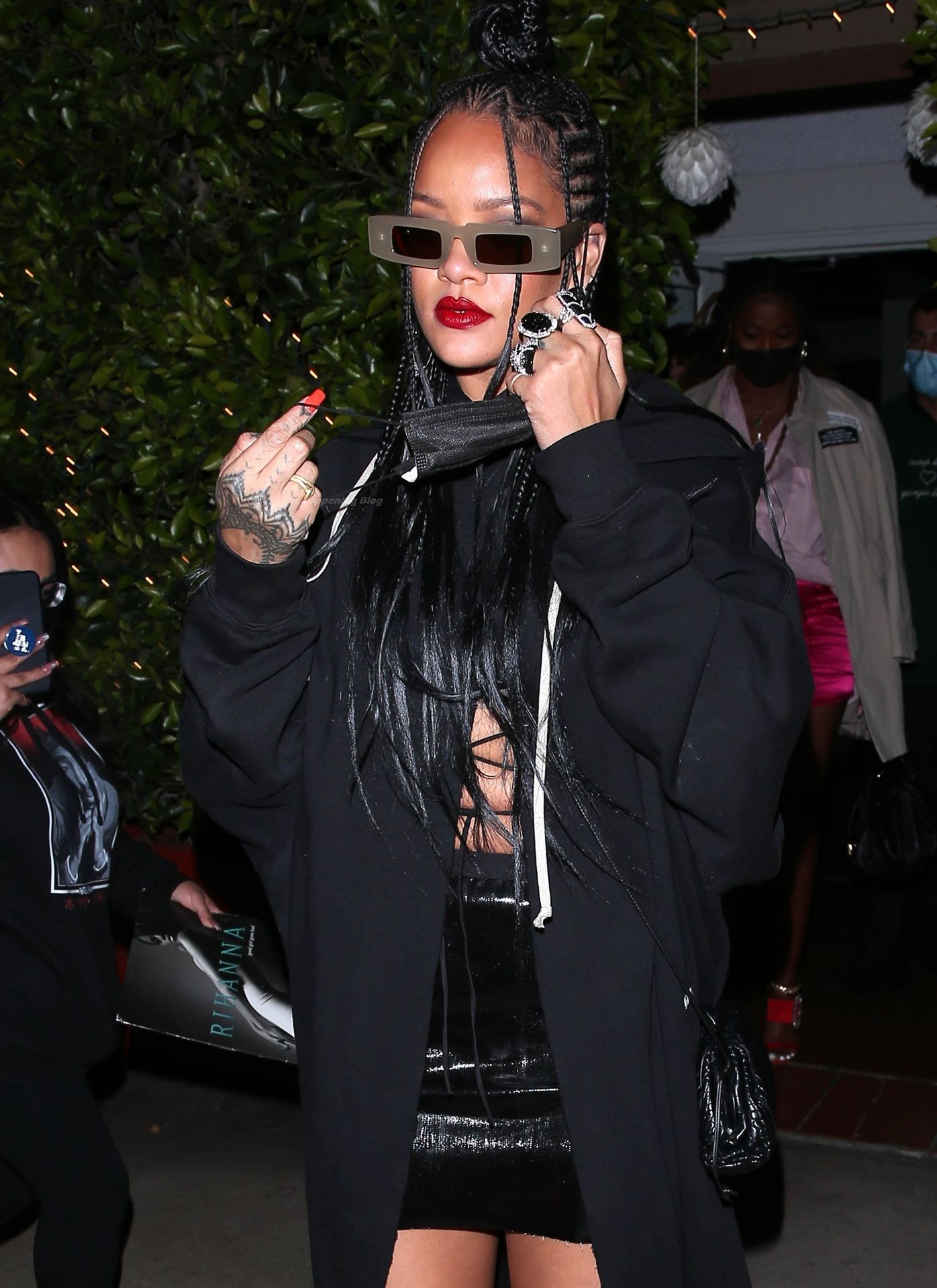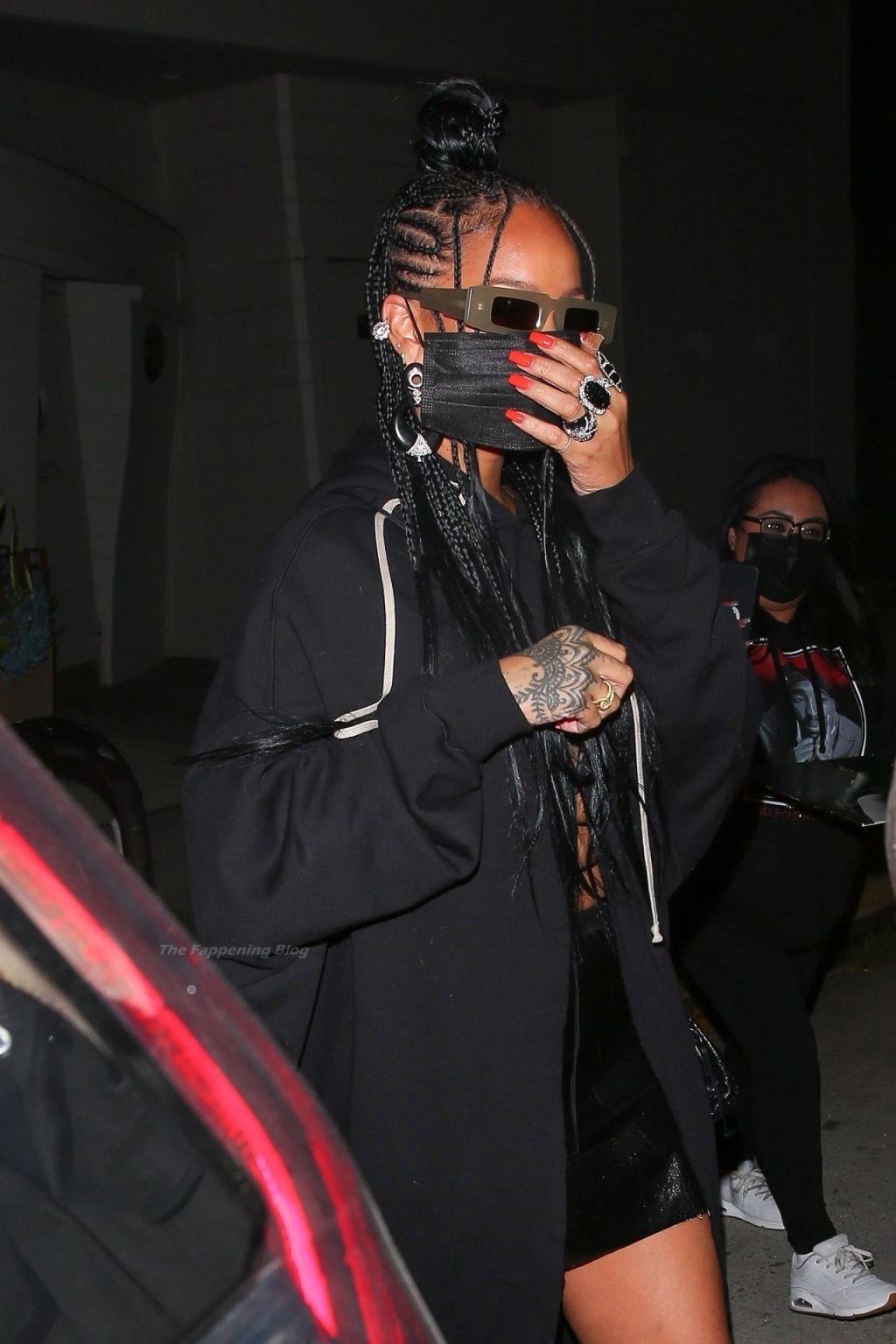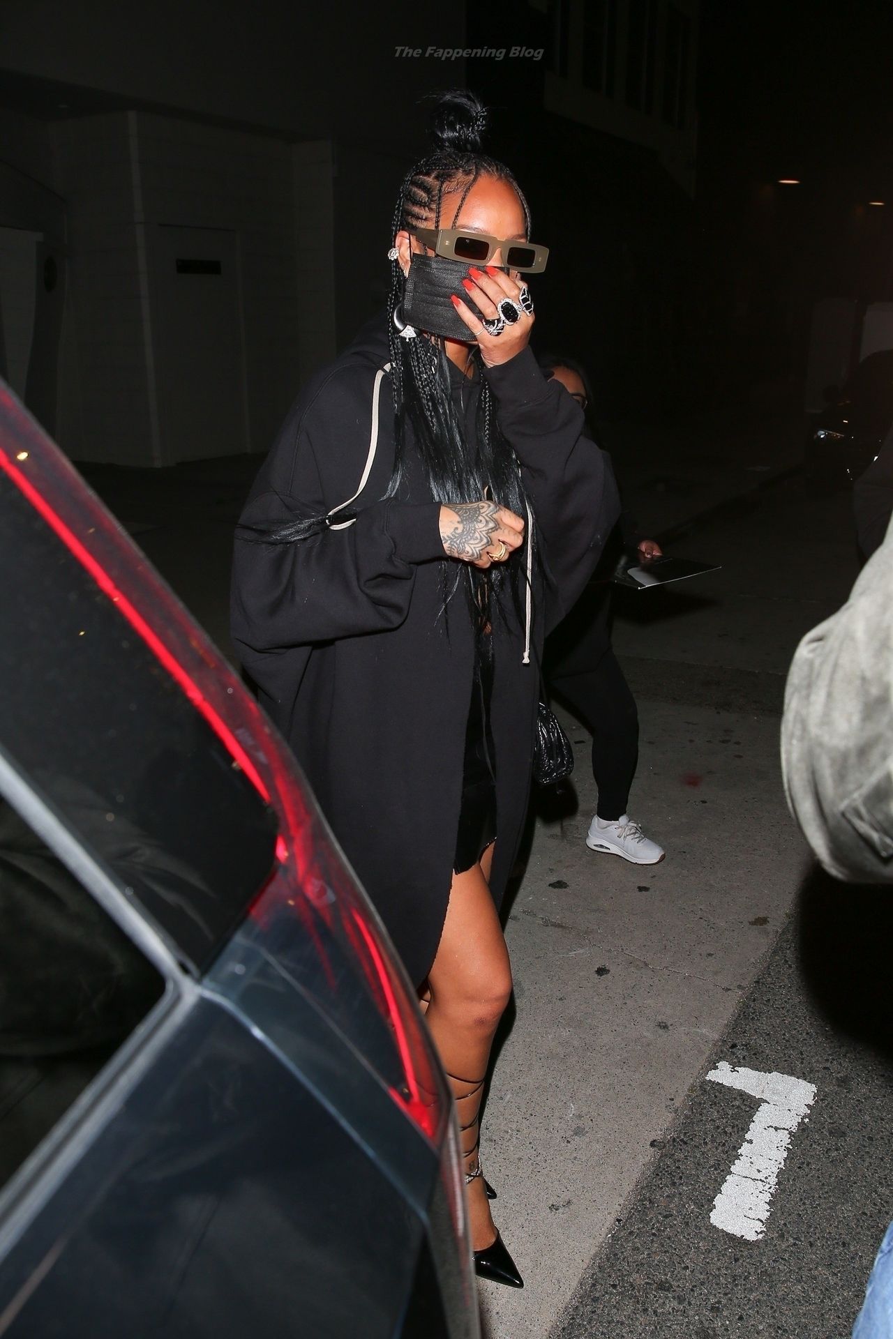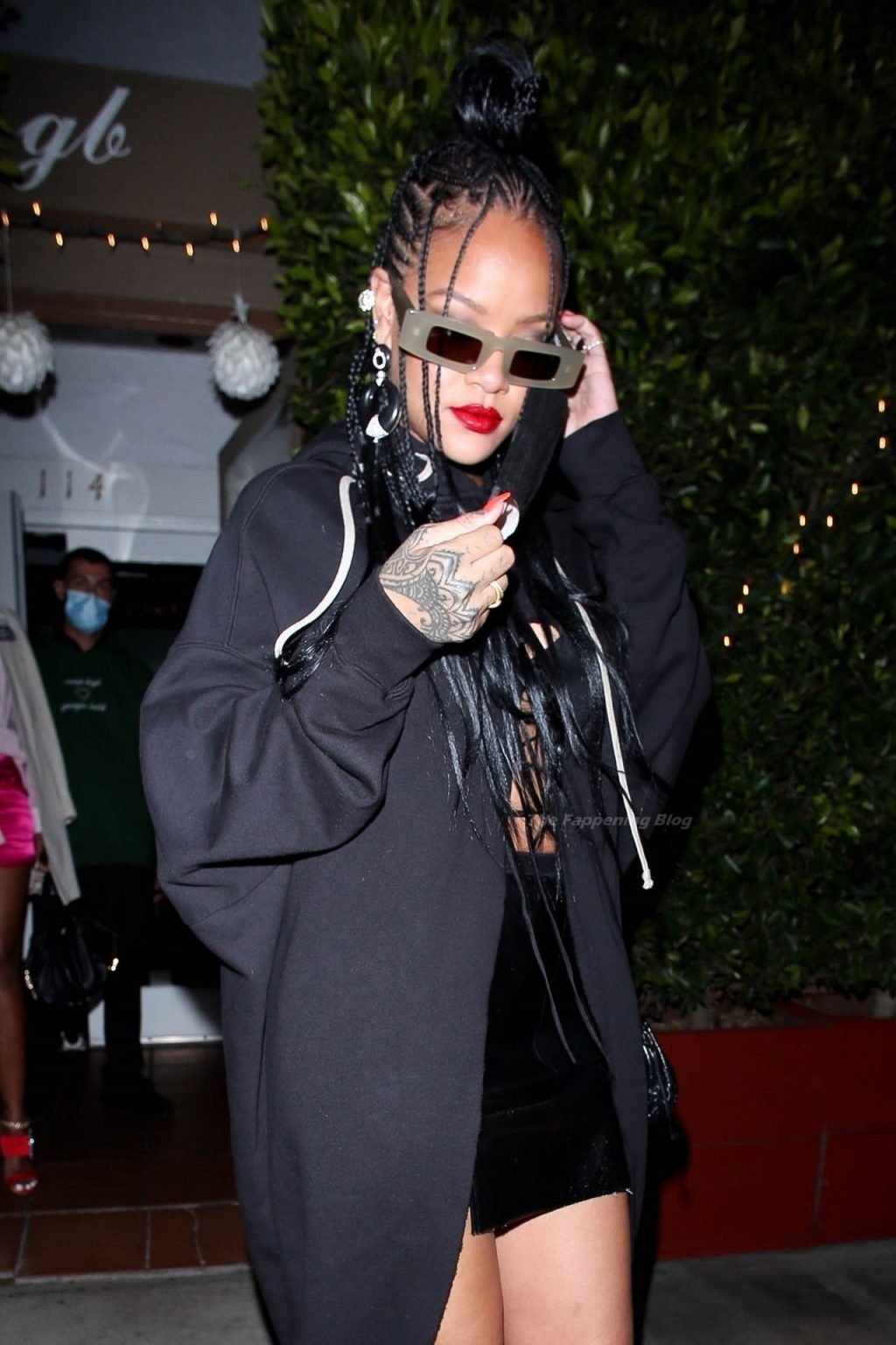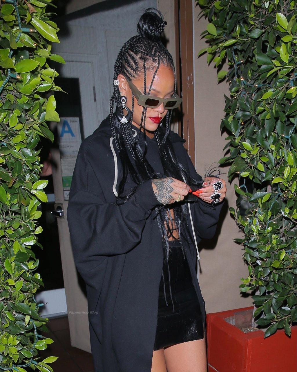 La estrella barbadense del Fappening llamó la atención al lucir sus largas piernas con una minifalda corta, un top revelador y un largo abrigo negro.