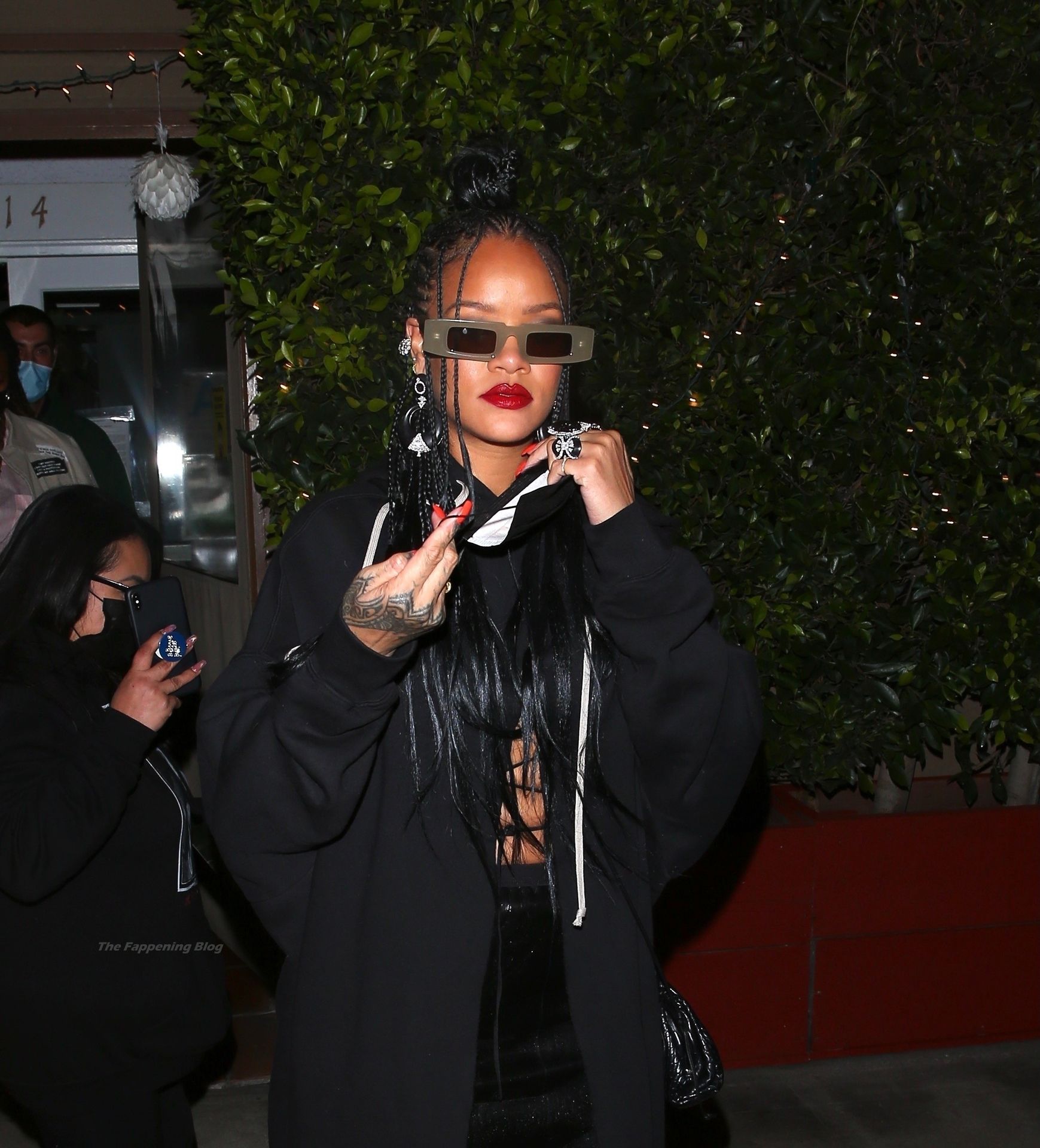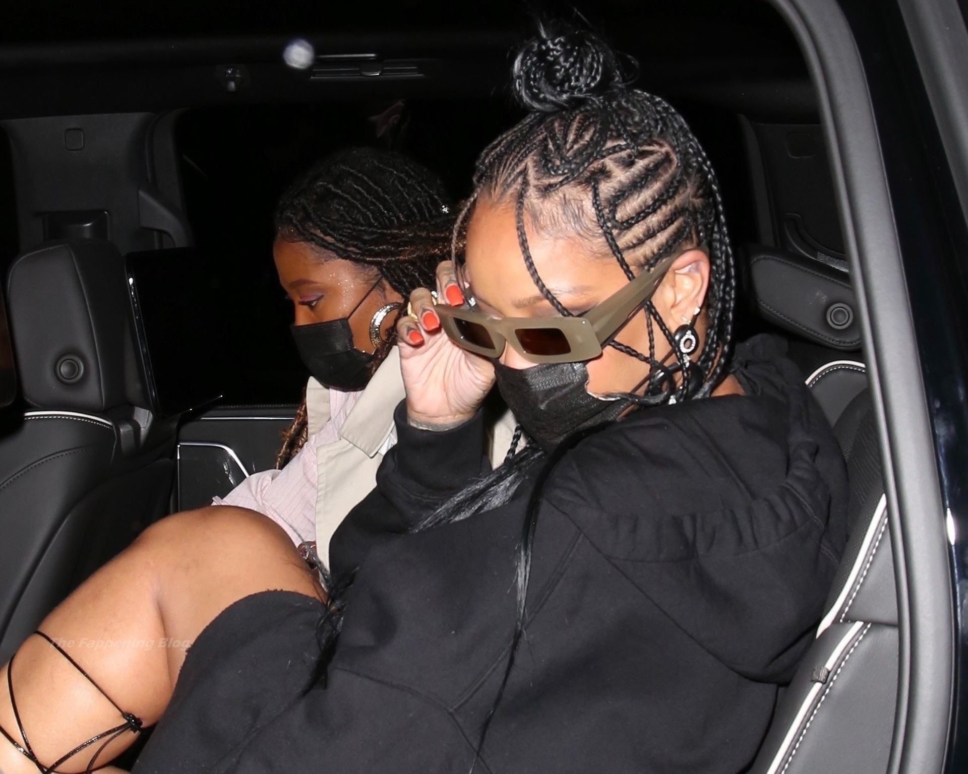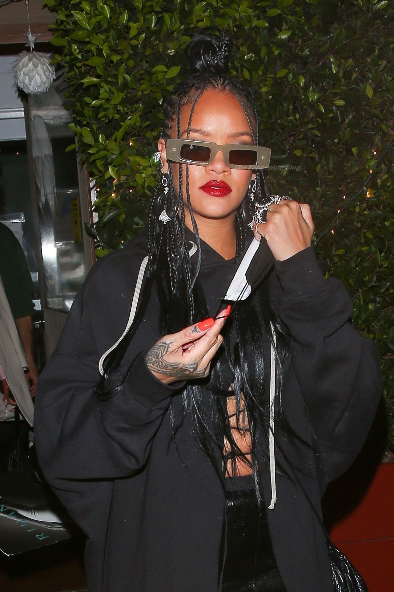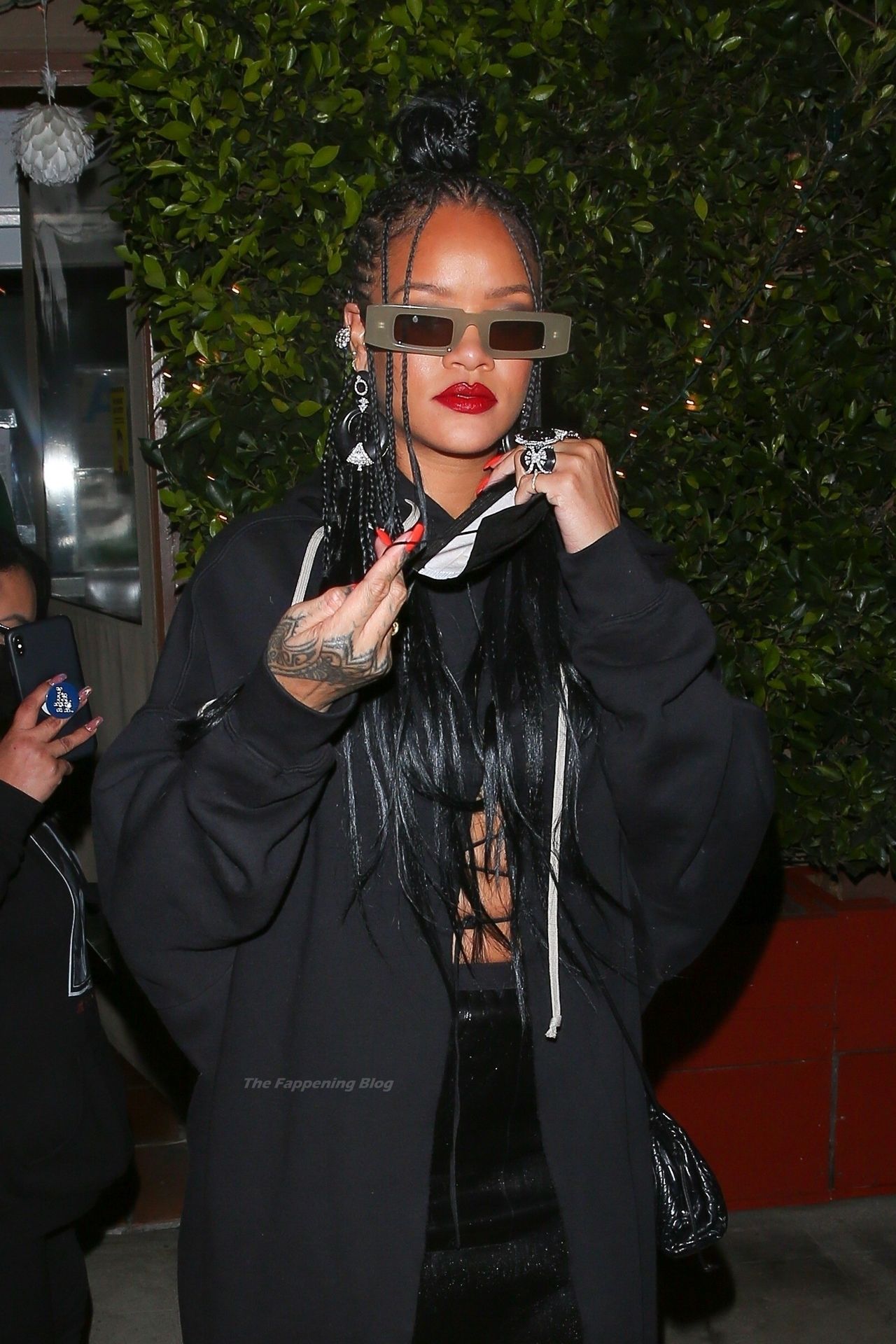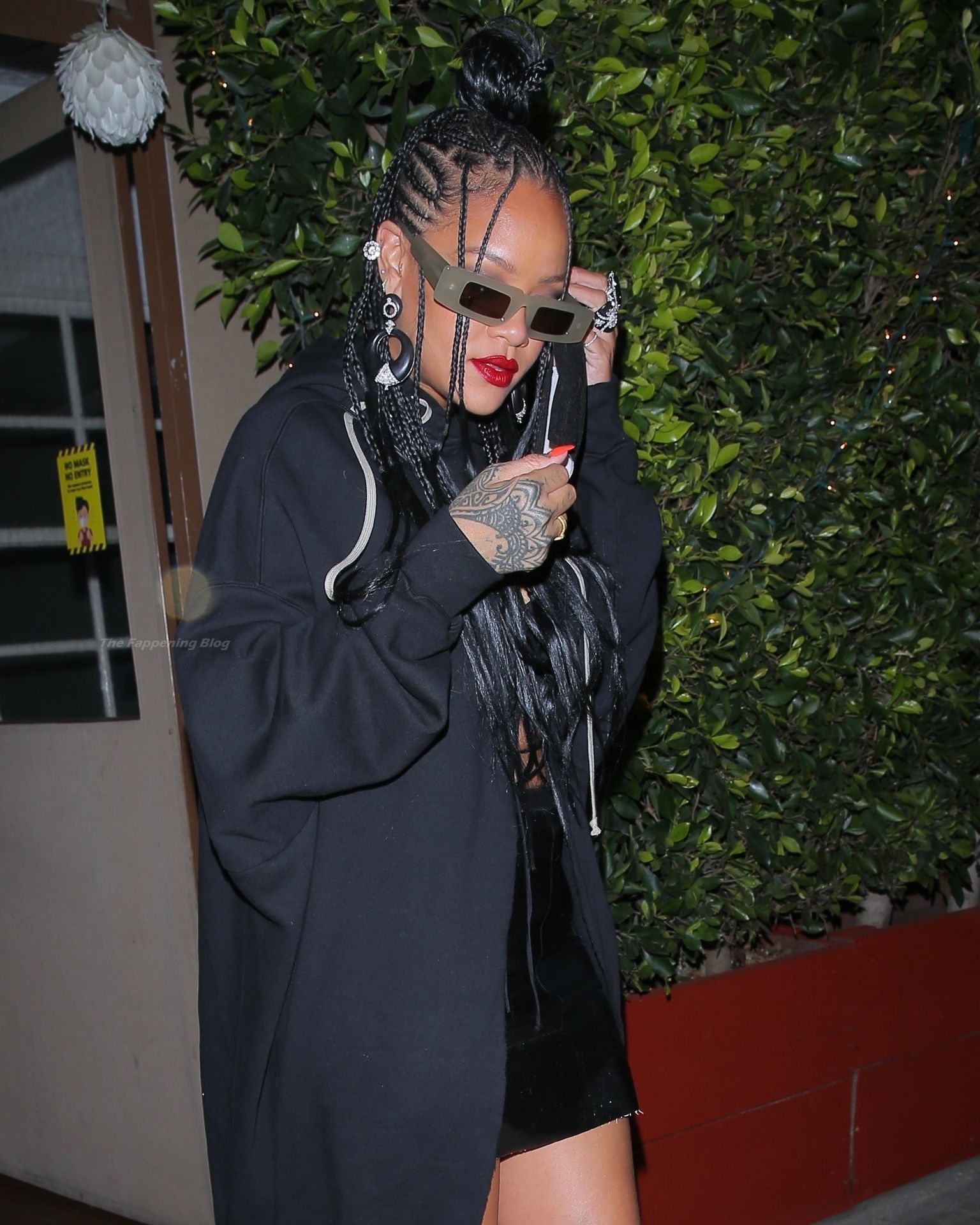 La estrella barbadense del Fappening llamó la atención al lucir sus largas piernas con una minifalda corta, un top revelador y un largo abrigo negro.