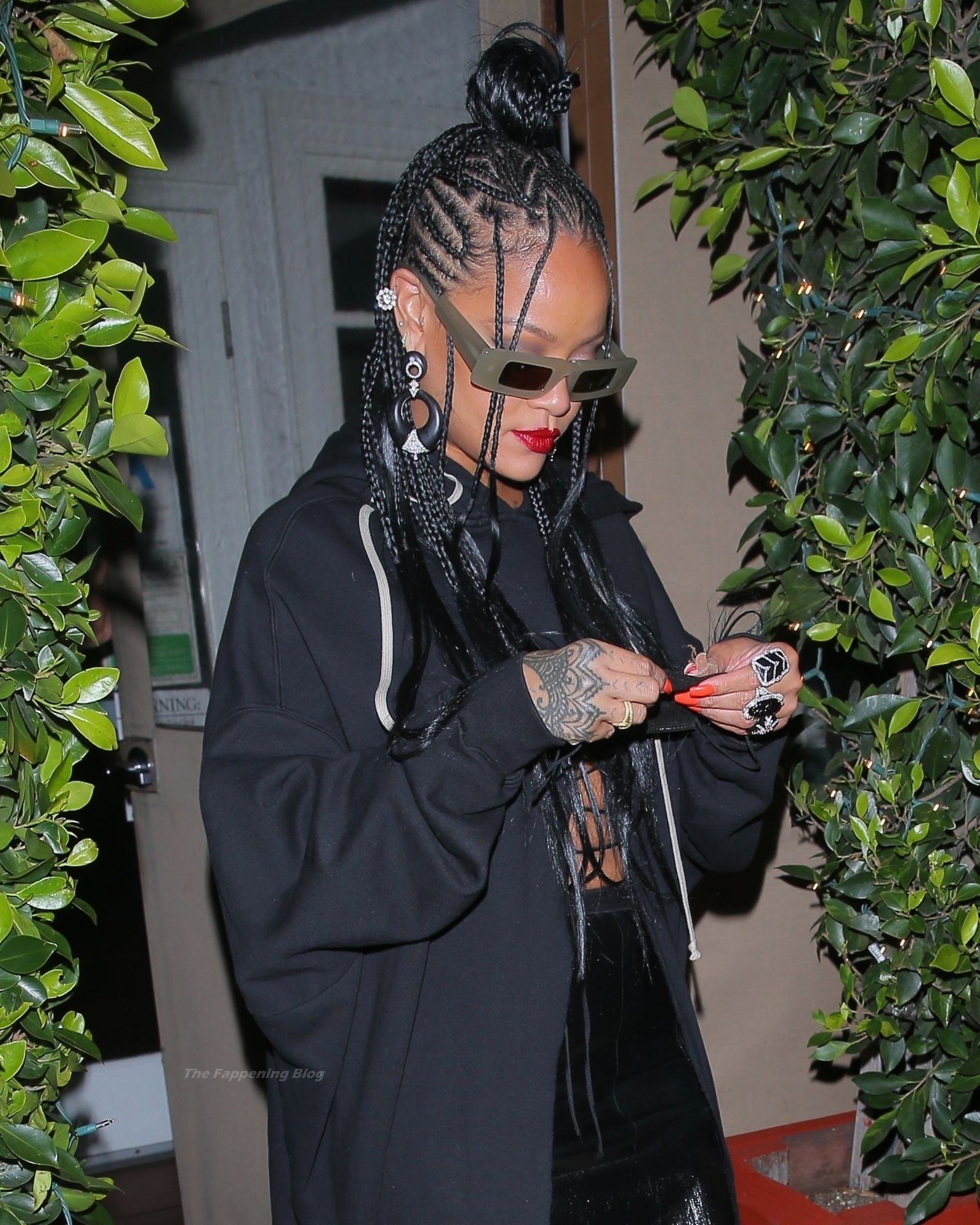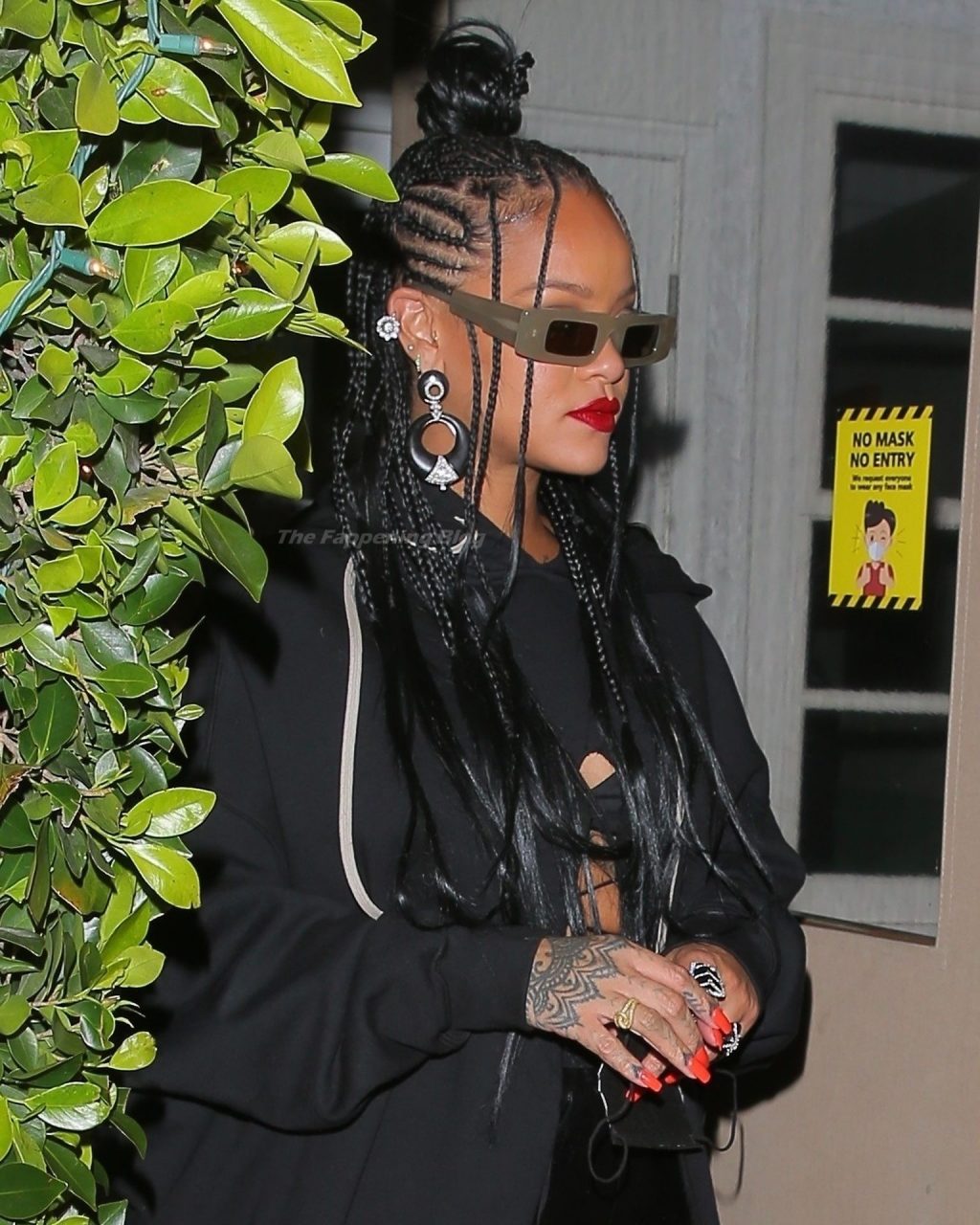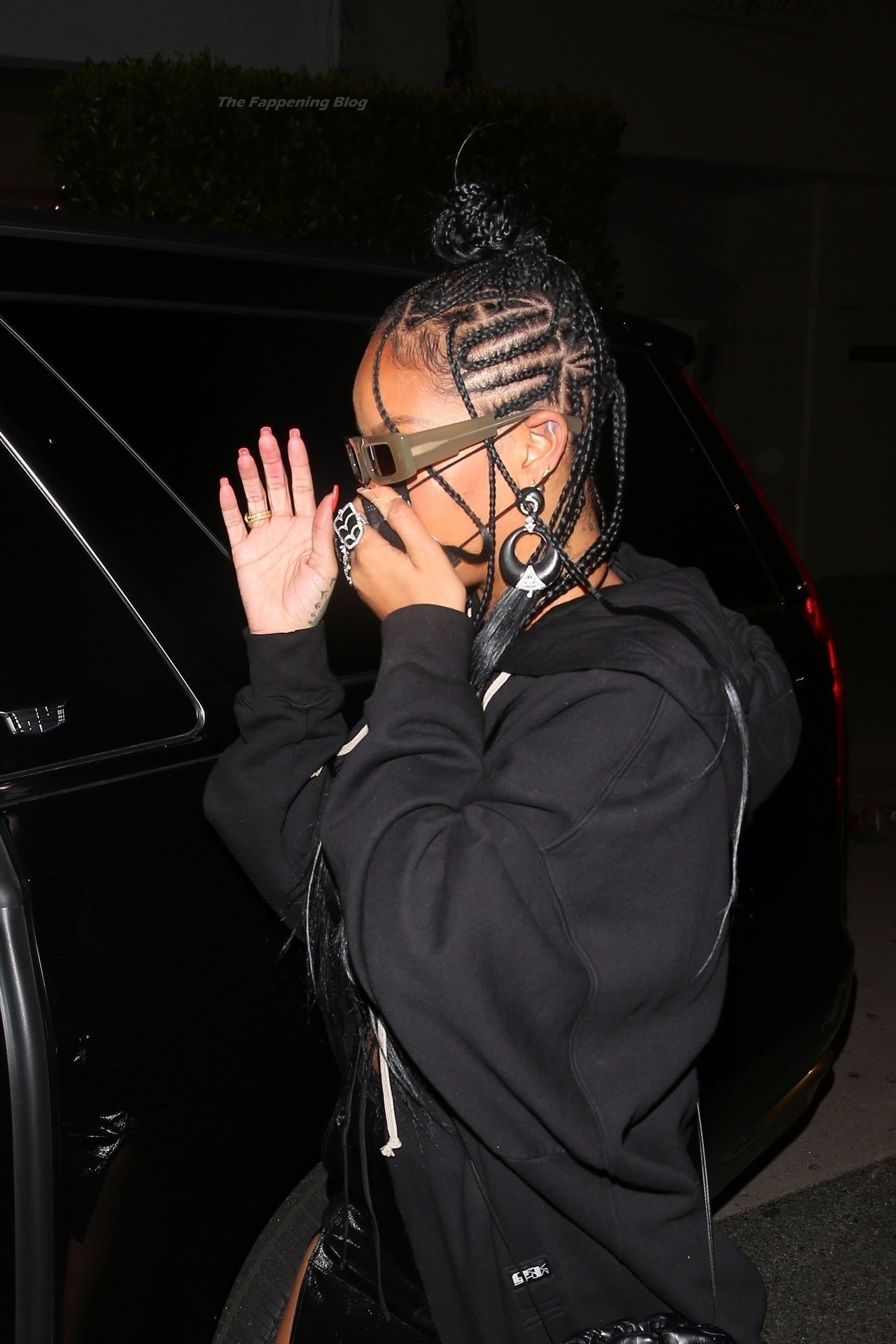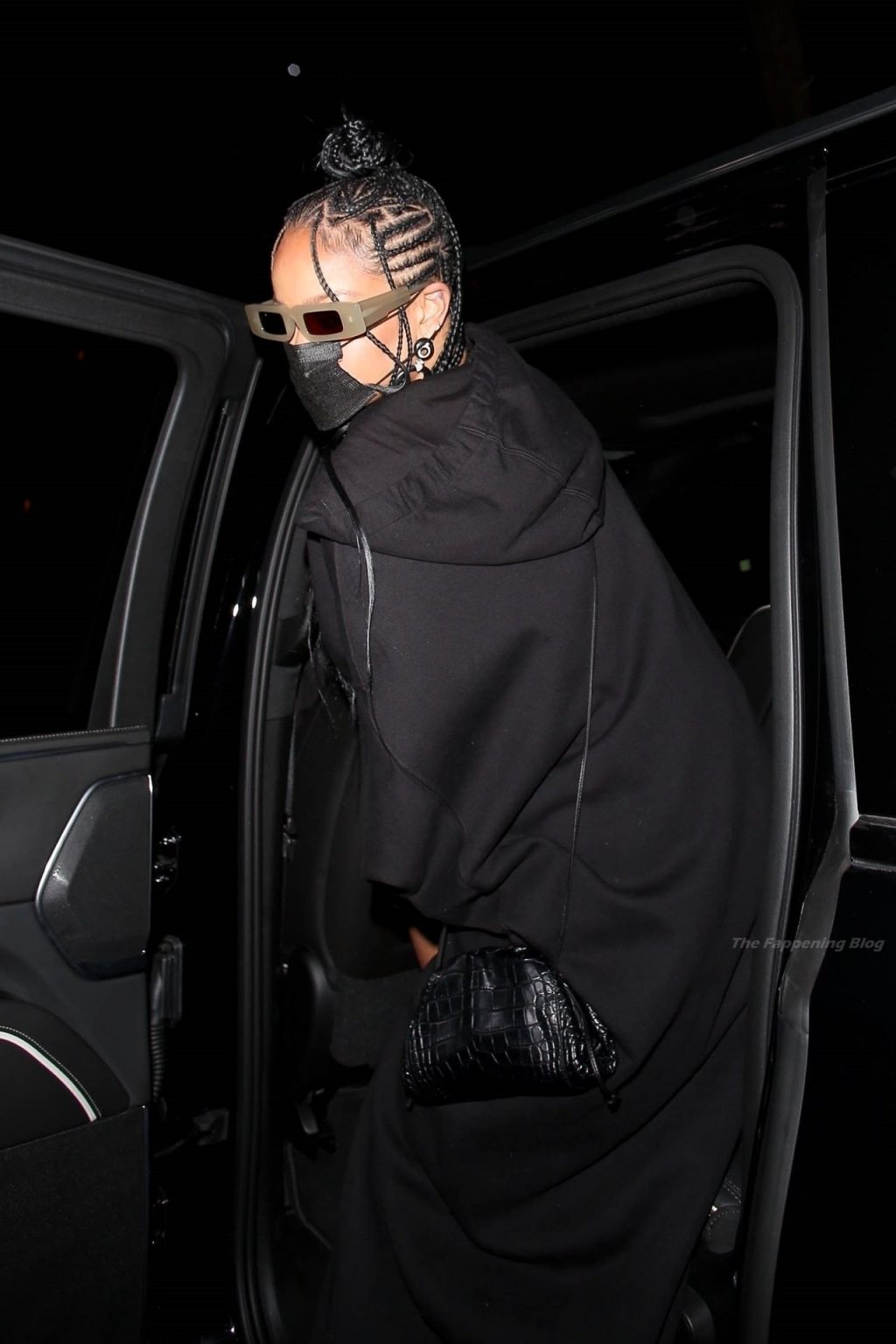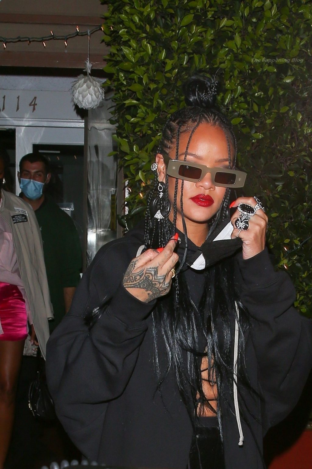 La estrella barbadense del Fappening llamó la atención al lucir sus largas piernas con una minifalda corta, un top revelador y un largo abrigo negro.