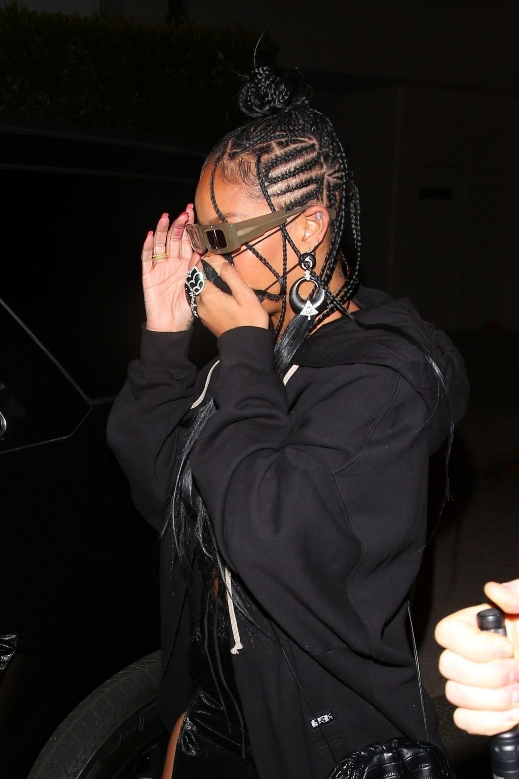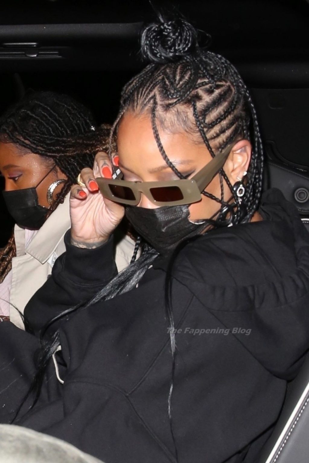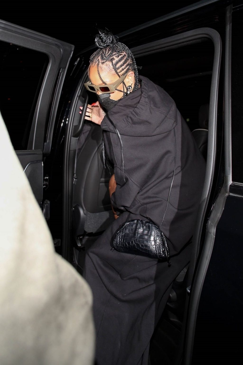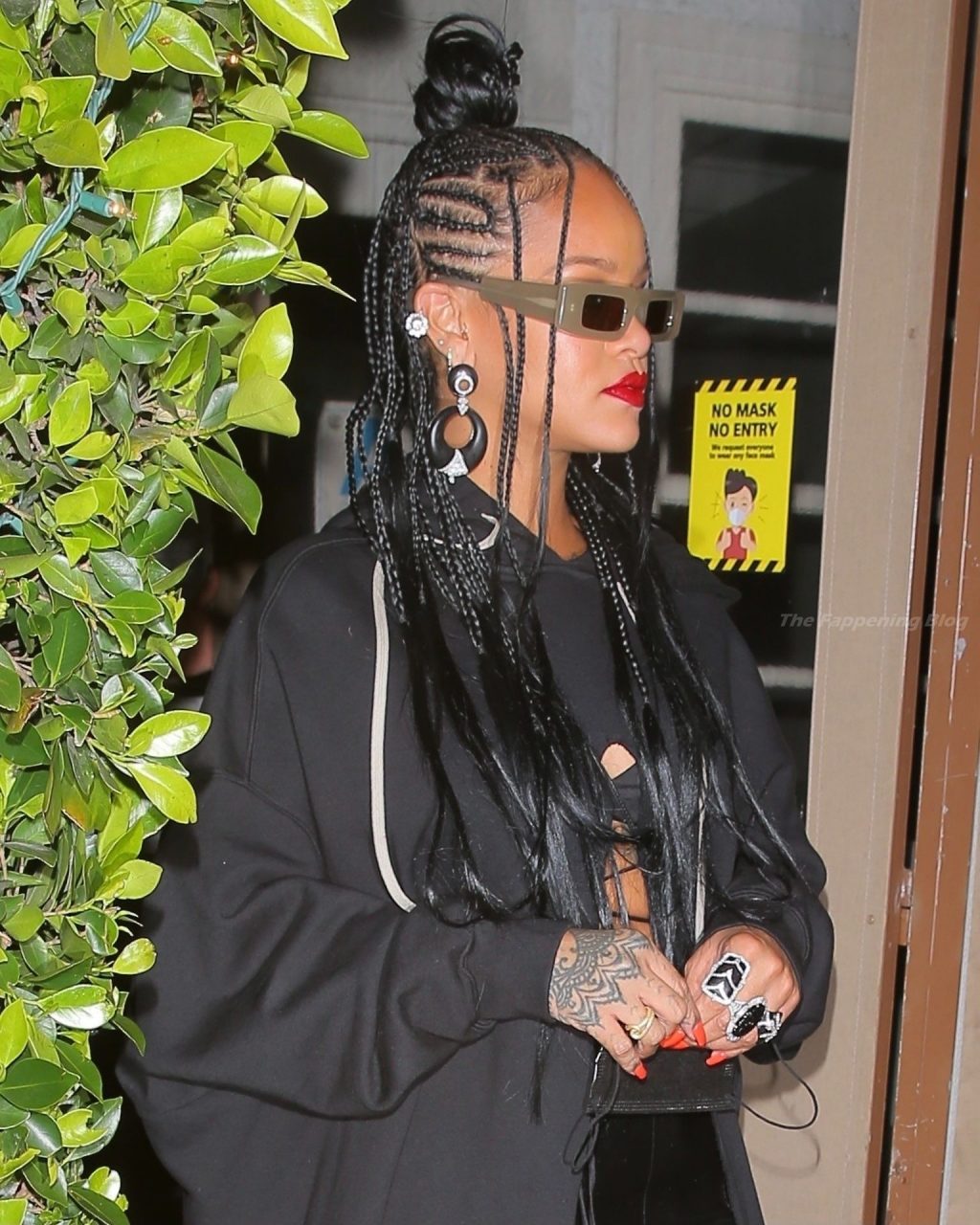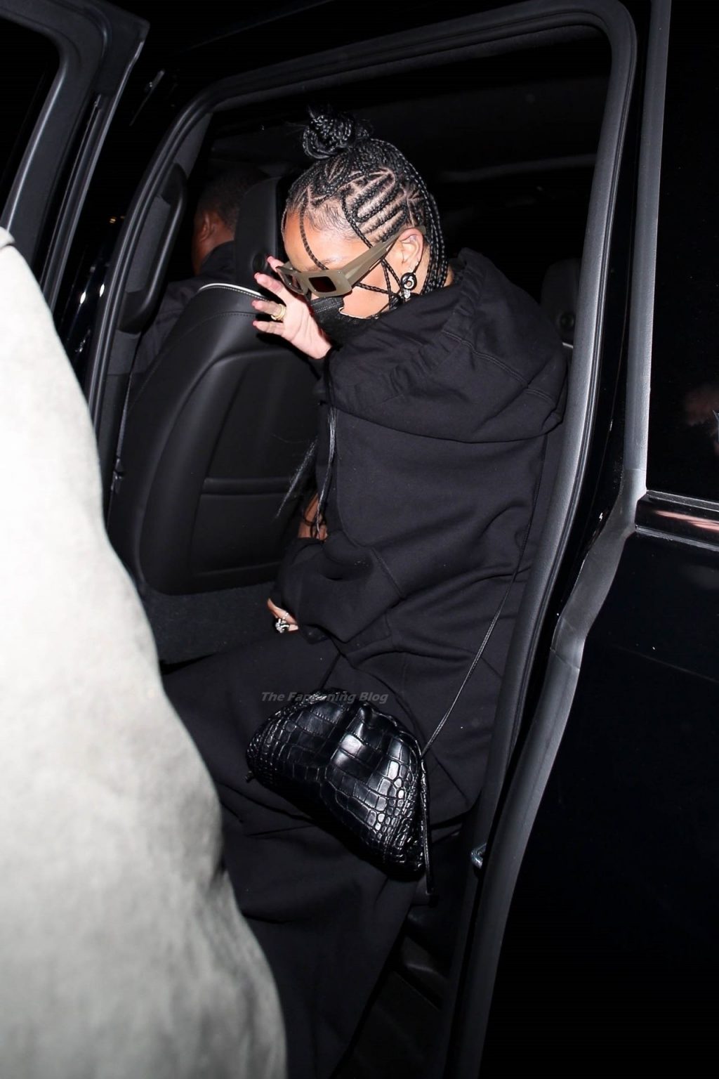 La estrella barbadense del Fappening llamó la atención al lucir sus largas piernas con una minifalda corta, un top revelador y un largo abrigo negro.